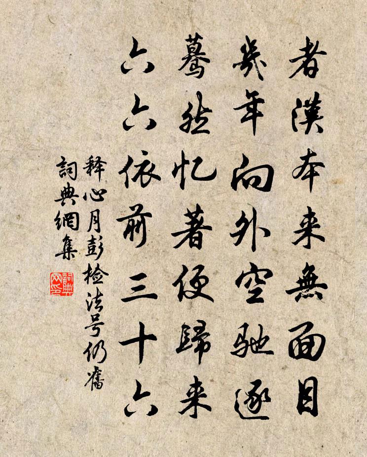 詩詞名句歷史字典書法欣賞書法字典國語詞典說文解字康熙字典古漢語字典標 題 作 者 詩 句 彭檢法號仍舊作者:釋心月 朝代:宋代彭檢法號仍舊原文者漢本來無面目,幾年向外空馳逐。驀然憶著便歸來,六六依前三十六。詩詞問答問:彭檢法號仍舊的作者是誰?答:釋心月問:彭檢法號仍舊寫於哪個朝代?答:宋代釋心月彭檢法號仍舊書法欣賞彭檢法號仍舊書法作品詩詞推薦奉和幸韋嗣立山莊應制崔湜〔唐代〕竹徑桃源本出塵,松軒茅棟別驚新。御蹕何須林下駐,山公不是俗中人。六月二十一日內引賜對緝熙殿玉音宣問漏下數岳珂〔宋代〕曾窺遺制辨中朝,更帖驍游八座貂。空有丹心酬雨露,詎應赤腳踏煙霄。人繇汲汲知堯舜,我豈區區事管簫。不是頌古一○一首釋子淳〔宋代〕淘金豈假披沙得,不觸波瀾猶費力。露柱三更忽放光,此時未審何人識。登城周霆震〔元代〕世祖艱難德澤深,風悲城郭怕登臨。九朝天下俄川決,七載江南竟陸沉。馬骨空傳當日價,雞聲不到暮年心。雨余念奴嬌·賦雨岩辛棄疾〔宋代〕近來何處有吾愁,何處還知吾樂。一點淒涼千古意,獨倚西風寥郭。並竹尋泉,和雲種樹,喚做真閒客,此心閒處食杞張耒〔宋代〕江皋春氣足,佳杞蕃新苗。老枿飽霜露,余滋發柯條。青青被修岡,若若緣空壕。僮歸必盈筐,一杯勸爾勞。神農令狐相公見示河中楊少尹贈答,兼命繼之劉禹錫〔唐代〕兩首新詩百字餘,朱弦玉磬韻難如。漢家丞相重征後,梁苑仁風一變初。四面諸侯瞻節制,八方通貨溢河渠。自從贈祝隱者張詠〔宋代〕當年辭聘幣,高臥魯郊西。道與常流別,名將往哲齊。細蟲喧四壁,芳草暗前蹊。猶有談玄叟,時時一杖藜。柳梢青 岳陽樓戴復古〔宋代〕袖劍飛吟。洞庭青草,秋水深深。萬頃波光,岳陽樓上,一快披襟。不須攜酒登臨。問有酒、何人共斟。變盡人間次周益公韻樓鑰〔宋代〕天將間氣孕山川,名世還當五百年。已是有官居鼎鼐,不妨平地作神仙。書林尚欲校三豕,筆力猶能驅兩肩。前日履齋先生下頒參附往體以謝陳起〔宋代〕有客號奚毒,西來自赤水。外負炎炎氣,記憶體溫粹美。當年楊天惠,誇大不絕齒。解後段氏子,即之殊可喜。卻邪白帝樓杜甫〔唐代〕漠漠虛無里,連連睥睨侵。樓光去日遠,峽影入江深。臘破思端綺,春歸待一金。去年梅柳意,還欲攪邊心。及第後憶舊山白居易〔唐代〕偶獻子虛登上第,卻吟招隱憶中林。春蘿秋桂莫惆悵,縱有浮名不繫心。題太白五松書堂林桷〔宋代〕蕩漾清溪兩漿飛,趨行不及到斜暉。無人跪進雕胡飯,只學盧仝啜茗歸。偈頌一百一十七首釋紹曇〔宋代〕監本祖庭花東西爭擢秀。一等放清香,不分新與舊。枝枝葉葉,陡頓精神,妝點芝園劫外春。卜運算元莫崙〔宋代〕紅底過絲明,綠外飛綿小。不道東風上海棠,白地春歸了。月笛曲欄留,露舃芳池繞。爭得閒情似舊時,遍索檐花易水懷古馬戴〔唐代〕荊卿西去不復返,易水東流無盡期。落日蕭條薊城北,黃沙白草任風吹。昭惠廟黃柏歌王該〔宋代〕四明之山東南雄,中有古柏高巃嵷。霜凌雪犯勢不屈,斡直不與凡柯同。幾十圍,幾千尺,踞隆岩兮盤巨石。有時園居陶弼〔宋代〕篁韻松濤入耳清,誅茅欣見徑初成。更添蒼柏雨非輩,相伴高枝作雨聲。緣識宋太宗〔宋代〕繼出宏材,睹奧自開。揣摩三教,百行俱來。真宗起思,撫掌堪咍。識業之敏,談論熙哉。名句推薦紗廚藤簟,玉人羅扇輕縑。白樸《天淨沙·夏》 雨中黃葉樹,燈下白頭人。司空曙《喜外弟盧綸見宿》 白日不到處,青春恰自來。袁枚《苔》 不學自知,不問自曉,古今行事,未之有也。王充《論衡·卷二十六·實知篇》 對酒捲簾邀明月,風露透窗紗。蘇軾《少年游·潤州作》 野雲萬里無城郭,雨雪紛紛連大漠。李頎《古從軍行》 主人有酒歡今夕,請奏鳴琴廣陵客。李頎《琴歌》 綠葉素榮,紛其可喜兮。屈原《九章》 不及夜台塵土隔,冷清清、一片埋愁地納蘭性德《金縷曲·亡婦忌日有感》 差之毫厘,失之千里。佚名《增廣賢文·上集》