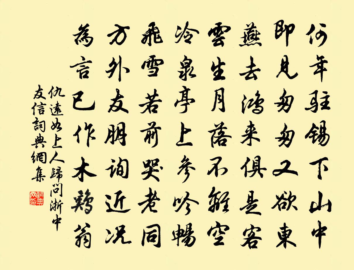 詩詞名句歷史字典書法欣賞書法字典國語詞典說文解字康熙字典古漢語字典標 題 作 者 詩 句 如上人歸問浙中友信作者:仇遠 朝代:宋代如上人歸問浙中友信原文何年駐錫下山中,即見匆匆又欲東。燕去鴻來俱是客,雲生月落不離空。冷泉亭上參吟暢,飛雪若前哭老同。方外友朋詢近況,為言已作木雞翁。詩詞問答問:如上人歸問浙中友信的作者是誰?答:仇遠問:如上人歸問浙中友信寫於哪個朝代?答:宋代仇遠如上人歸問浙中友信書法欣賞如上人歸問浙中友信書法作品詩詞推薦和陶答龐參軍六首蘇軾〔宋代〕將行復止,眷言孜孜。苟有於中,傾倒出之。奕奕千言,粲焉陳詩。觴行筆落,了不容思。傷歙州陳二使君李嘉祐〔唐代〕憐君辭滿臥滄洲,一旦雲亡萬事休。慈母斷腸妻獨泣,寒雲慘色水空流。江村故老長懷惠,山路孤猿亦共愁。寂寞詩一首賈公望〔宋代〕倏忽向六十,萍蓬無奈何。丹心猶奮迅,白道分蹉跎。正直士流少,傾邪朋類多。陽光一銷鑠,不復見妖魔。過太行山徐范〔宋代〕茫茫遠樹隔煙霏,獵獵西風振客衣。山雨未晴嵐氣濕,溪流欲盡水聲微。回車廟古丹青老,碗子城荒草木稀。珍重天津感事二十六首邵雍〔宋代〕去年橋上憑欄人,今歲橋邊騎馬身。橋上橋邊不知數,於今但記十三春。送龐佑甫五首韓元吉〔宋代〕中宵櫂謳發,菰蒲翳明月。月黑色忽行,恐墮蛟龍窟。瓊台胡融〔宋代〕璿台插中天,仙聖展游眺。亭亭珠玕樹,蒙日光照曜。上有天樂鳴,嘈雜聲要妙。浮丘倚岩聽,玉女排雲笑。茲游雜感陸游〔宋代〕病臥踐衰境,躬耕歸故園。怒蛙號廢沼,妖鵩嘯荒村。里巷魚餐薄,坊場黍酒渾。相逢欲話舊,意極轉忘言。商山海棠王禹偁〔宋代〕錦里名雖盛,商山艷更繁。別疑天與態,不稱土生根。淺著紅蘭染,深於絳雪噴。待開先釀酒,怕落預呼魂。春里句錢厚〔宋代〕暮靄不知天遠近,閒雲休礙月升沉。清平樂·留春不住王安國〔宋代〕留春不住。費盡鶯兒語。滿地殘紅宮錦污。昨夜南園風雨。小憐初上琵琶。曉來思繞天涯。不肯畫堂朱戶,春風自蝶戀花佚名〔宋代〕意。崔氏緘報之詞,粗載於此,曰:“捧覽來問,撫愛過深。兒女之情,悲喜交集。兼惠花勝一合,口脂五寸。致紹熙辛亥六月中伏日出郭觀稼小休野石讀仲權滕鎮〔宋代〕稻香藹藹暑風清,下馬傳觴聽水笙。父老指詩懷舊尹,為鐫岩石寄心聲。折楊柳行曹丕〔魏晉〕端居若無悰。駕游博望山。詩江總〔隋代〕惱殺未歸客。桃花塤眼醉。滿庭芳(壽富者·三月十八)卓田〔宋代〕柳暗千株,蓂翻三莢,當年神岳生申。畫堂慶會,今日賀生辰。寶鴨檀煙薰馥,頌椒觴、醽醁頻斟。殷勤勸,歌喉晏子答梁丘據佚名〔〕梁丘據死,景公召晏子而告之曰:“據忠且愛我。我欲豐厚其葬,高大其壟。”晏子曰:“敢問據之忠且愛於君者往復無間釋重顯〔宋代〕平旦寅,眹兆之前已喪真。老胡鶴樹慚開□,猶舉雙趺誑後人。雨中花(送彭文思使君)黃庭堅〔宋代〕政樂中和,夷夏宴喜,官梅乍傳訊息。待作新年歡計,斷送春色。桃李成陰,甘棠少訟,又移旌戟。念畫樓朱閣,十丈洞陳岩〔宋代〕水從洞口瀉玻瓈,松檜林中日影低。勝景略無人避世,始知不是武林溪。名句推薦居移氣,養移體。孟子《孟子·盡心章句上·第三十六節》 天階夜色涼如水,臥看牽牛織女星。杜牧《秋夕》 金風細細。葉葉梧桐墜。晏殊《清平樂·金風細細》 三日入廚下,洗手作羹湯。王建《新嫁娘詞三首》 江上旗亭,送君還是逢君處吳大有《點絳唇·送李琴泉》 扶桑已在渺茫中,家在扶桑東更東。韋莊《送日本國僧敬龍歸》 君子恥其言而過其行。孔子弟子《論語·憲問篇》 紅蓼渡頭秋正雨,印沙鷗跡自成行,整鬟飄袖野風香。薛昭蘊《浣溪沙·紅蓼渡頭秋正雨》 白水滿春塘,旅雁每迥翔。沈約《詠湖中雁》 颯颯東風細雨來,芙蓉塘外有輕雷。李商隱《無題·颯颯東風細雨來》