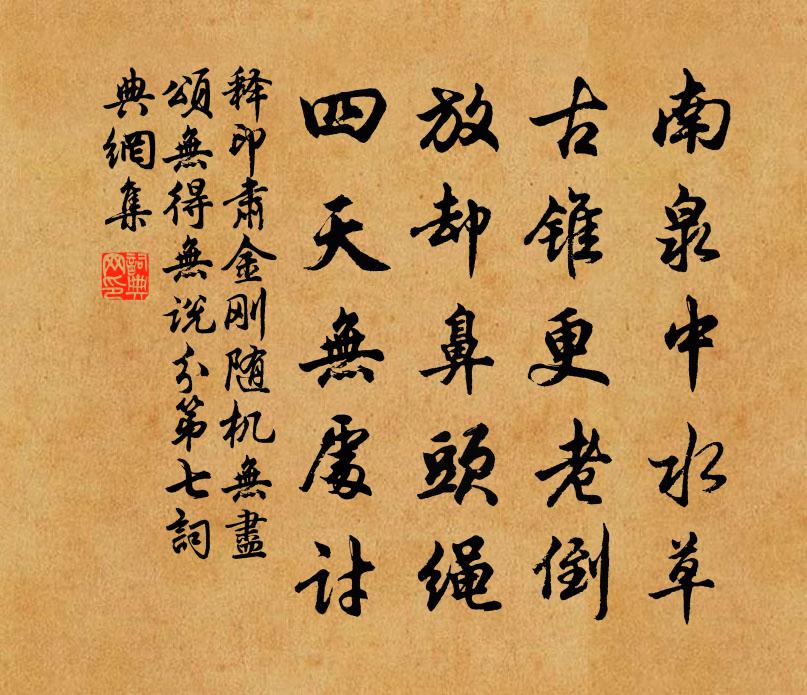 詩詞名句歷史字典書法欣賞書法字典國語詞典說文解字康熙字典古漢語字典標 題 作 者 詩 句 金剛隨機無盡頌無得無說分第七作者:釋印肅 朝代:宋代原文南泉中水草,古錐更老倒。放卻鼻頭繩,四天無處討。詩詞問答問:《金剛隨機無盡頌無得無說分第七》的作者是誰?答:釋印肅問:該詩寫於哪個朝代?答:宋代書法欣賞金剛隨機無盡頌無得無說分第七書法作品詩詞推薦郡治燕堂庭中梅花楊萬里〔宋代〕林中梅花如隱士,只多野氣也無塵,庭中梅花如賁人,也無野氣也無塵。不疏不密隨宜了,旋落旋開無不好。珠簾秋雲王安石〔宋代〕秋雲放雨靜山林,萬壑崩湍共一音。欲記荒寒無善畫,賴傳悲壯有能琴。壽丞相慶七十五首吳泳〔宋代〕昨夜聞宣鎖,虛皇注意深。三師分漢制,一尺瀉商霖。未白憂邊發,仍丹報國心。黃封留壽酒,且把斗杓斟。梅花惠端方〔宋代〕美人在空谷,抱志苦貞潔。不學桃李顏,甘在枯朽列。素衣飄白雲,玉佩綴明月。肌膚炯凝脂,容色眩春雪。臨風寄外劉彤〔宋代〕盡扇停揮白日長,清風細細襲羅裳。女重來報新簪熟,安得良人共一觴。又自和葉茵〔宋代〕一雁雲間落勁弧,經秋不見寄來書。人情自昔如翻紙,世道從今甚借鋤。鹿夢隍中知得喪,爵羅門外看親疏。歲寒織婦處默〔唐代〕蓬鬢蓬門積恨多,夜闌燈下不停梭。成縑猶自陪錢納,未直青樓一曲歌。曉出古城山范成大〔宋代〕落月墮眇莽,殘星澹微茫。竹輿亂清溪,飛蓋入嵐光。松檜霧靄濕,桑麻風露香。空翠滴塵纓,何必濯滄浪?山家次韻成父趙蕃〔宋代〕山經立壁動危情,路入懸崖作峭行。雨露正昏當晝黑,瀑泉倒瀉助波驚。萬無一理可至寇,十有九家空避兵。愧子蚊二首蒲壽宬〔宋代〕白日沿溝渠,中宵隱堂奧。獨處招燎煙,幾人有良幬。眶睫知若何,口觜有計暴。梁雅樂歌 滌雅沈約〔南北朝〕將修盛禮。其儀孔熾。有腯斯牲。國門是置。不黎不{疒酉}。靡愆靡忌。呈肌獻體。永言昭事。俯休皇德。仰綏農家戴栩〔宋代〕農家何所有,掛壁一鋤犁。歲計唯供賦,門前自好溪。剝麻稭覆日,繰繭蛹分雞。不復知炎月,南風焚{稃去子加答陳楙伯二首劉克莊〔宋代〕乃翁良玉不勞攻,之子天葩特地紅。海道扁舟明日具,江東尊酒幾時同。上樓誰伴老玄德,驚座今逢小孟公。回首虞美人(七夕悼亡)袁去華〔宋代〕娟娟缺月梧桐影。雲度銀潢靜。夜深檐隙下微涼。醒盡酒魂何處、藕花香。鵲橋初會明星上。執手還惆悵。莫嗟相留別鄒紹劉長卿嚴維〔唐代〕中年從一尉,自笑此身非。道在甘微祿,時難恥息機。晨趨本郡府,晝掩故山扉。待見干戈畢,何妨更採薇。大人游千金張仲宗以守捨不得侍行用仲宗韻二葛立方〔宋代〕古寺依煙艇,一篙春水深。石壇幡轉影,玉殿磬流音。客有張公子,僧皆支道林。行行雲水窟,幽夢渺難尋。秋晚陸游〔宋代〕竹竿坡面老別駕,飯顆山頭瘦拾遺。自古詩人例如此,放翁窮死未須悲。鷓鴣引 和周斡臣韻。中統五年三月十二日夜王惲〔元代〕門外東風駐馬蹄。月明庭樹綠陰稀。眼中時事驚天運,醉里游談似□機。思遠走,擬高飛。此心安得與時違。遺書西溪子毛文錫〔唐代〕昨夜西溪游賞,芳樹奇花千樣。鎖春光,金尊滿,聽弦管。嬌妓舞衫香暖。不覺到斜暉,馬馱歸。送蘭秋谷皈雙溪兼簡諸友釋行海〔宋代〕故人多住山頭寺,到日先煩問起居。花柳西湖好時節,不來須寄幾行書。名句推薦今又重陽,戰地黃花分外香。 * 《採桑子·重陽》 慨當初,倚飛何重,後來何酷。文徵明《滿江紅·拂拭殘碑》 地中有山,謙;君子以裒多益寡,稱物平施。佚名《易傳·象傳上·謙》 常有江南船,寄書家中否。王維《雜詩三首》 綠楊芳草長亭路。年少拋人容易去。晏殊《玉樓春·春恨》 落葉委埏側,枯荄帶墳隅。潘安《悼亡詩三首》 驚鳥去無際,寒蛩鳴我傍。馬戴《楚江懷古三首》 今朝此為別,何處還相遇。韋應物《初發揚子寄元大校書》 蒲生我池中,其葉何離離。甄宓《塘上行》 不語含嚬深浦里,幾回愁煞棹船郎,燕歸帆盡水茫茫。薛昭蘊《浣溪沙·紅蓼渡頭秋正雨》