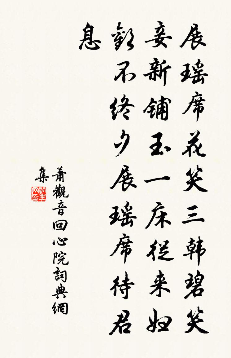 詩詞名句歷史字典書法欣賞書法字典國語詞典說文解字康熙字典古漢語字典標 題 作 者 詩 句 回心院作者:蕭觀音 朝代:遼代回心院原文展瑤席,花笑三韓碧。笑妾新鋪玉一床,從來婦歡不終夕。展瑤席,待君息。詩詞問答問:回心院的作者是誰?答:蕭觀音問:回心院寫於哪個朝代?答:遼代蕭觀音回心院書法欣賞回心院書法作品詩詞推薦菩薩蠻(和賀子忱)曹勛〔宋代〕琴堂窗戶清無暑。宮妝爭捧黃金注。勸我醉秋風。難辭兩臉紅。別來三墮葉。同是修門客。十載嘆萍蓬。方欣一笑戲書燕几陸游〔宋代〕飽知此手合鋤犁,剩喜東歸老故棲。僧乞新詩題院壁,人扶半醉下樓梯。少通朝籍讒銷骨,晚畏京塵悔噬臍。尚有新亭曾極〔宋代〕青山四合繞天津,風景依然似洛濱。江左於今成樂土,新亭垂淚亦無人。浣溪沙洪咨夔〔宋代〕小雨輕霜作嫩寒。蠟梅開盡菊花乾。清香收拾貯詩肝。文武兩魁前樣在,功名四諫後來看。 * 進酒斗闌乾。天津感事二十六首邵雍〔宋代〕雲輕日淡天津暮,風急林疏洛水秋。獨步獨吟人莫會,時時鷗鷺下汀洲。藻侄比課五言詩,已有意趣,老懷甚喜,因吟范成大〔宋代〕汗漬筇枝赤,苔封屐齒青。有醫延上坐,無客抗分庭。霽月鑽窗看,鳴琴側枕聽。莫嗔猿鶴怨,岫幌兩年扃。金燈花葛立方〔宋代〕小圃金燈滿意芳,苞舒絳彩照煌煌。珠璣小滴今朝雨,縞紵難禁昨夜霜。拂秉麟須蛾欲避,枝銜螭口蠟猶香。列錢次朱必先與師是唱酬韻陳造〔宋代〕男子負抱成蹉跎,唾壺自擊商聲歌。此聲此意誰解領,政用折柬招羊何。人言百里半九十,它日聰明嗟不及。雲衢木蘭花慢史深〔宋代〕畫樓簾半卷,倩誰覓、鳳簫音。記待月梅邊,籠香酒後,私語屏陰。忽忽佩珠暗解,斷歸鴻、訊息兩沉沉。前度劉與友人過山寺戴叔倫〔唐代〕共有春山興,幽尋此日同。談詩訪靈徹,入社愧陶公。竹暗閒房雨,茶香別院風。誰知塵境外,路與白雲通。送黃岩二陳秀才葉適〔宋代〕一雙璞玉稟天和,遠向東州就琢磨。待得永無痕鋟相,莫言功用不須多。蝶戀花·桐葉晨飄蛩夜語陸游〔宋代〕桐葉晨飄蛩夜語。旅思秋光,黯黯長安路。忽記橫戈盤馬處。散關清渭應如故。江海輕舟今已具。一卷兵書,嘆息酹江月/念奴嬌周密〔宋代〕奩霏花淨洗,喚花素娥睡起,平分秋色。雁背風高霜兔冷,露腳侵衣香濕。銀浦流雲,珠房迎曉,鬢影霜爭白。玉和奇父叔夏雪五首胡寅〔宋代〕不須十日照胥敖,且要仙花麗顯皋。集霰果然歸望望,同雲因得蔽高高。輝山玉璞韜虹氣,亂眼煙霄隘羽毛。欲叩酒泉子(十之二)潘閬〔宋代〕長憶錢塘,臨水傍山三百寺。僧房攜杖遍曾游。閒話覺忘憂。栴檀樓閣雲霞畔。鍾梵清宵徹天漢。別來遙禮只焚香憶故人羅公升〔宋代〕檐前一矯首,雲凍天欲愁。客心急歲晚,留滯此何州。黃金不療飢,暖老各一裘。珍重山中人,幅巾自無憂。其日雨聞姚黃開戲成詩二章呈子駿堯夫司馬光〔宋代〕穀雨後來花更濃,前時已見玉玲瓏。客來更說姚黃髮,只在街西相第東。和歷陽守張仲智觀梅五首王之道〔宋代〕夜燒紅燭照梅花,刺史風流自一家。待得殘英上丹臉,韶華端復到山茶。獨處愁張耒〔宋代〕高高花飛驚愁顏,珠簾晝鎖春風閒。少年金鞍照秦地,玉巵雙覆應埃間。花間蝴蝶雙飛舞,感觸深心心更苦。昨夜夜坐王冕〔元代〕夜深山館冷,風雨滿江城。老客不成寐,感懷無限情。蠻煙迷五嶺,王氣屬三京。休問泥塗事,荊榛處處生。名句推薦倦遊京洛風塵,夜來病酒無人問。晁端禮《水龍吟·詠月》 清江一曲柳千條,二十年前舊板橋。劉禹錫《楊柳枝 / 柳枝詞》 木屑竹頭,皆為有用之物;牛溲馬渤,可備藥石之資。程登吉《幼學瓊林·卷三·人事》 蜀國曾聞子規鳥,宣城還見杜鵑花。李白《宣城見杜鵑花 / 子規》 同來何事不同歸。賀鑄《半死桐·重過閶門萬事非》 投宿駸駸征騎,飛雪滿孤村。孔夷《南浦·旅懷》 但遠山長,雲山亂,曉山青。蘇軾《行香子·過七里瀨》 更吹羌笛關山月,無那金閨萬里愁王昌齡《從軍行七首》 故人何在,煙水茫茫。柳永《玉蝴蝶·望處雨收雲斷》 驚風亂颭芙蓉水,密雨斜侵薜荔牆。柳宗元《登柳州城樓寄漳汀封連四州》