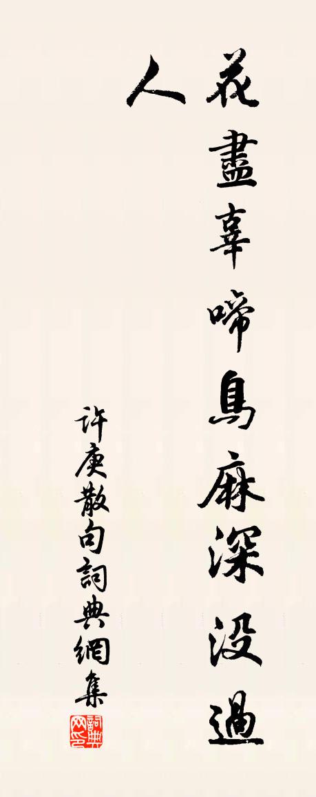 詩詞名句歷史字典書法欣賞書法字典國語詞典說文解字康熙字典古漢語字典標 題 作 者 詩 句 句作者:許庚 朝代:宋代句原文花盡辜啼鳥,麻深沒過人。詩詞問答問:句的作者是誰?答:許庚問:句寫於哪個朝代?答:宋代許庚句書法欣賞句書法作品詩詞推薦送曇秀師歸廬山夢齋晁補之〔宋代〕扁舟又過楚江東,廬阜霜晴翠掃空。四海五湖皆逆旅,千岩萬壑正秋風。會觀沙界無華處,何必茅齋是夢中。已悟邠詩人張谷齊物先生馳名京師四方晚隱於終南張舜民〔宋代〕能吟解飲張夫子,醉臥黃池谷口風。天地至寬容不得,勞君收拾畫圖中。偈頌十二首釋道璨〔宋代〕無個入處,奔走 * 。有個入處,礙塞 * 。晚行後園見菊戲宜莆司馬光〔宋代〕野菊荒無數,班班初見花。徑須求一醉,度遣問東家。鷓鴣天(祝良顯家牡丹一本百朵)辛棄疾〔宋代〕占斷雕欄只一株。春風費盡幾工夫。天香夜染衣猶濕,國色朝酣酒未蘇。嬌欲語,巧相扶。不妨老乾自扶疏。恰如依韻贈嚴司直徐夤〔唐代〕曾轉雙蓬到玉京,宣尼恩奏樂卿名。歌殘白石扣牛角,賦換黃金愛馬卿。滄海二隅身漸老,太行千疊路難行。夫君題李公麟山莊圖其十四玉龍峽蘇轍〔宋代〕白龍晝飲潭,修尾掛石壁。幽人慾下看,雨雹晴相射。是夜聞十六兄雪中有作次韻杜范〔宋代〕晚山棲半白,晚岫勒斜紅。草草三杯里,悠悠一笑中。喜君才磊魄,雇我意蒙茸。伯仲壎篪處,空嗟不與同。浴日亭(在南海廟前。)蘇軾〔宋代〕劍氣崢嶸夜插天,瑞光明滅到黃灣。坐看暘谷浮金暈,遙想錢塘涌雪山。已覺蒼涼蘇病骨,更煩沆瀣洗衰顏。忽驚水調歌頭李昴英〔宋代〕野趣在城市,崛起此台高。誰移蓬島,馮夷夜半策靈鰲。十萬人家甃碧,四面峰巒涌翠,遠岫拍銀濤。插漢筆雙塔臨江仙(和陳景衛憶梅)胡銓〔宋代〕我與梅花真莫逆,別來長恐因循。幾年不見嶺頭春。栩然蝴蝶夢,魂夢竟非真。浪蕊浮花空滿眼,愁眉不展長顰。守齋示予游問政山和陳廣文詩予用韻呈守齋陳鑒之〔宋代〕小人名山訪古歸,雪雲不爭聽招麾。瓊瑤千嶂插空闊,珠璧一詩爭崛奇。興逸聊茲游赤石,民安何待花潢池。妓圍喜同費君長官游周敦頤〔宋代〕尋山尋水侶尤難,愛利愛名心少間。此亦有君吾茂樂,不辭高遠共躋攀。遣興陸游〔宋代〕湖海元為汗漫遊,誤恩四領幔亭秋。掃空薄祿始無媿,閉上衡門那得愁?湯嫩雪濤翻茗碗,火溫香縷上衣篝。床頭次韻安撫侍郎勸耕喜雨之什度正〔宋代〕田家何所樂,所樂日未曛。男耕而禾稼,女桑而襦裙。面垢落塈塗,目眩濕薪熏。婦子饁南畝,詩人嘗云云。使車舟次王令〔宋代〕梢梢修竹夾溪斜,樹系孤逢白淺沙。風力引雲行玉馬,水光流月動金蛇。村酤客聚還成市,晚釣舟橫便當家。山野游張園陸游〔宋代〕冷局歸差早,名園得緩行。穿林山驟出,度硤路微平。霜近柳無色,風生蒲有聲。出門還戃怳,滿路夕陽明。法喜堂謝景初〔宋代〕虛堂庇風雨,結構不務壯。外飾無髹髵,置物況容長。開篋藥劑靈,拈棋白黑抗。階花澹亦夭,庭石碧交向。出門予一病七十日心呈牢落作詩自解李呂〔宋代〕抱病懶巾櫛,自度作黃冠。披褐襟便短,拖鞋步稍安。忘機任俗薄,遮眼把書看。未必不為福,善乎能自寬。釋老六言十首劉克莊〔宋代〕吾嘗評石鼎詩,蓋出一手所為。若使彌明能道,唐朝有兩退之。名句推薦休對故人思故國,且將新火試新茶。詩酒趁年華。蘇軾《望江南·超然台作》 暮雨忽來鴻雁杳,莽關山、一派秋聲里。龔自珍《金縷曲·癸酉秋出都述懷有賦》 泉眼無聲惜細流,樹陰照水愛晴柔楊萬里《小池》 榮螈,蜥蜴。佚名《爾雅·釋魚》 楊柳陰陰細雨晴,殘花落盡見流鶯。武元衡《春興》 龜游蓮葉上,鳥宿蘆花里。李白《姑孰十詠》 小處不滲漏,暗處不欺隱,末路不怠荒,才是真正英雄。洪應明《菜根譚·概論》 古戍蒼蒼烽火寒,大荒沈沈飛雪白。李頎《聽董大彈胡笳聲兼寄語弄房給事》 當場不論,過後枉然。佚名《增廣賢文·下集》 向露冷風清,無人處,耿耿寒漏咽。周邦彥《浪淘沙慢·曉陰重》