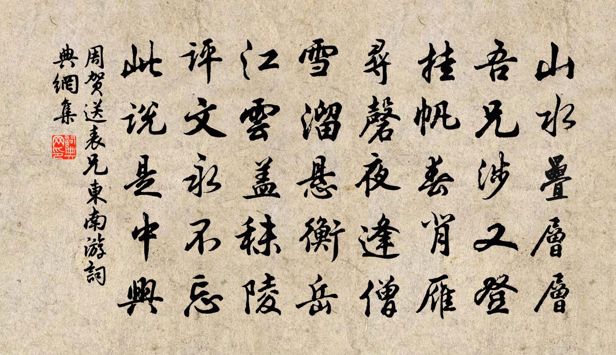 詩詞名句歷史字典書法欣賞書法字典國語詞典說文解字康熙字典古漢語字典標 題 作 者 詩 句 送表兄東南遊作者:周賀 朝代:唐代送表兄東南遊原文山水疊層層,吾兄涉又登。掛帆春背雁,尋磬夜逢僧。雪溜懸衡岳,江雲蓋秣陵。評文永不忘,此說是中興。詩詞問答問:送表兄東南遊的作者是誰?答:周賀問:送表兄東南遊寫於哪個朝代?答:唐代問:送表兄東南遊是什麼體裁?答:五律周賀送表兄東南遊書法欣賞送表兄東南遊書法作品注釋全唐詩:卷503-6詩詞推薦頌古三首釋師遠〔宋代〕呵呵大笑不尋常,笑得眉間也放光。不是明招重註腳,叢林洎合錯商量。途中盛暑丁謂〔宋代〕山木無陰驛路長,海風吹熱透蕉裳。渴思西漢金莖露,困憶南朝石步廊。江上竹竿輸散誕,林間冠褐負清涼。不程姜鍾離輓詞樓鑰〔宋代〕門戶期興起,交朋務琢磨。反身求大學,決意取儒科。贊府聲尤著,鄰封惠亦多。傷心濠上路,無復聽弦歌。山居漫興吳端〔宋代〕莫笑山莊小,偏於隱者宜。門當八字路,園葺五經籬。地暖花開早,天寒酒熟遲。不須雞報曉,已得數聯詩。孤標上人留宿真山民〔宋代〕山僧留我宿,我亦似山僧。香茗半甌雪,寒虀一籌冰。廊風響黃葉,壁雨暗青燈。參透詩三昧,何須契一乘。近買山范灣自營藏地與亡弟草塘君及外家墓塋薛嵎〔宋代〕依然且作住庵看,茆屋三間辦不難。戶外莫容千駟馬,客床唯置兩 * 。深林藏虎風長怒,短木去門睡自安。西北憂旱章甫〔宋代〕貧賤甘羈旅,淹留賴薄田。悠悠將送老,比比不逢年。旱魃工為虐,雷公豈易鞭。醉能忘萬事,安得酒如川。芭蕉王銍〔宋代〕六曲欄乾院宇深,影連苔色晝沉沉。已將虛實論因果,尤稱風流寫醉吟。夢短不禁簾外雨,愁多常怯檻邊陰。可憐秋謁屺瞻墓馬廷鸞〔宋代〕了知五十六年非,何處空山叫阿{上彌下女}。斗酒只雞雙淚落,荒林宿莽九原悲。黃花委地傷徂歲,青筍迎船憶商子引諺佚名〔先秦〕蠹眾而木折。隙大而牆壞。留汪子明徐瑞〔宋代〕美人渺渺隔秋水,六年不見心茫茫。麥昴黍低各自媚,鶴長鎬短庸何傷。荷鑰未未素業在,讀憶具來真味長。是間聞子規杜荀鶴〔唐代〕楚天空闊月成輪,蜀魄聲聲似告人。啼得血流無用處,不如緘口過殘春。苦寒六言范成大〔宋代〕檐冰低掛闌角,隙雪斜侵坐隅。春後一寒如此,梅花有信來無。題上饒半月岩四絕胡寅〔宋代〕何年落月掛蒼山,長似瑤梳插翠鬟。擬琢半輪營魄處,莫教如玦只如環。燕台四首秋李商隱〔唐代〕月浪沖天天宇濕,涼蟾落盡疏星入。雲屏不動掩孤嚬,西樓一夜風箏急。欲織相思花寄遠,終日相思卻相怨。但聞吳大帝陵曾極〔宋代〕老瞞虎裂橫中州,何物生兒作仲謀。四十帝 * 第一,壞陵無主使人愁。山中薛嵎〔宋代〕長日山中坐,白雲應笑人。浮生塵未脫。至老趣難真。身在影猶贅,年豐家自貧。莫將吟事廢,柳色已知春。次韻周公謹見寄馬廷鸞〔宋代〕射洪高蹈翁,哀歌淚盈盈。幽居觀元化,悼此歲月更。感遇三十篇,讀之慨余情。白露號玄蟑,春日鳴倉庚。過潼關溫庭筠〔唐代〕地形盤屈帶河流,景氣澄明是勝游。十里曉雞關樹暗,一行寒雁隴雲愁。片時無事溪泉好,盡日凝眸岳色秋。麈尾十一月二十三日趙蕃〔宋代〕正爾元無事,胡然不自聊。髯衰紛若雪,梅早綴如椒。太白傾殘榼,方爐爇柿樵。宦才成此味,隱莫待渠招。名句推薦放逐肯消亡國恨?歲時猶動楚人哀!查慎行《三閭祠》 中年親友難別,絲竹緩離愁。蘇軾《水調歌頭·安石在東海》 紅橋路,正一派、畫船蕭鼓中流住。納蘭性德《摸魚兒·午日雨眺》 兩岸桃花烘日出,四圍高柳到天垂。一尊心事百年期。姜彧《浣溪沙·山滴嵐光水拍堤》 莫唱當年長恨歌,人間亦自有銀河。袁枚《馬嵬》 賴其力者生,不賴其力者不生。墨子《墨子·32章 非樂(上)》 將軍發白馬,旌節度黃河。李白《發白馬》 成事莫說,覆水難收。佚名《增廣賢文·上集》 千雷萬霆,激繞其身,霰雪雨雹,一時皆下。李朝威《柳毅傳》 何當金絡腦,快走踏清秋。李賀《馬詩二十三首》