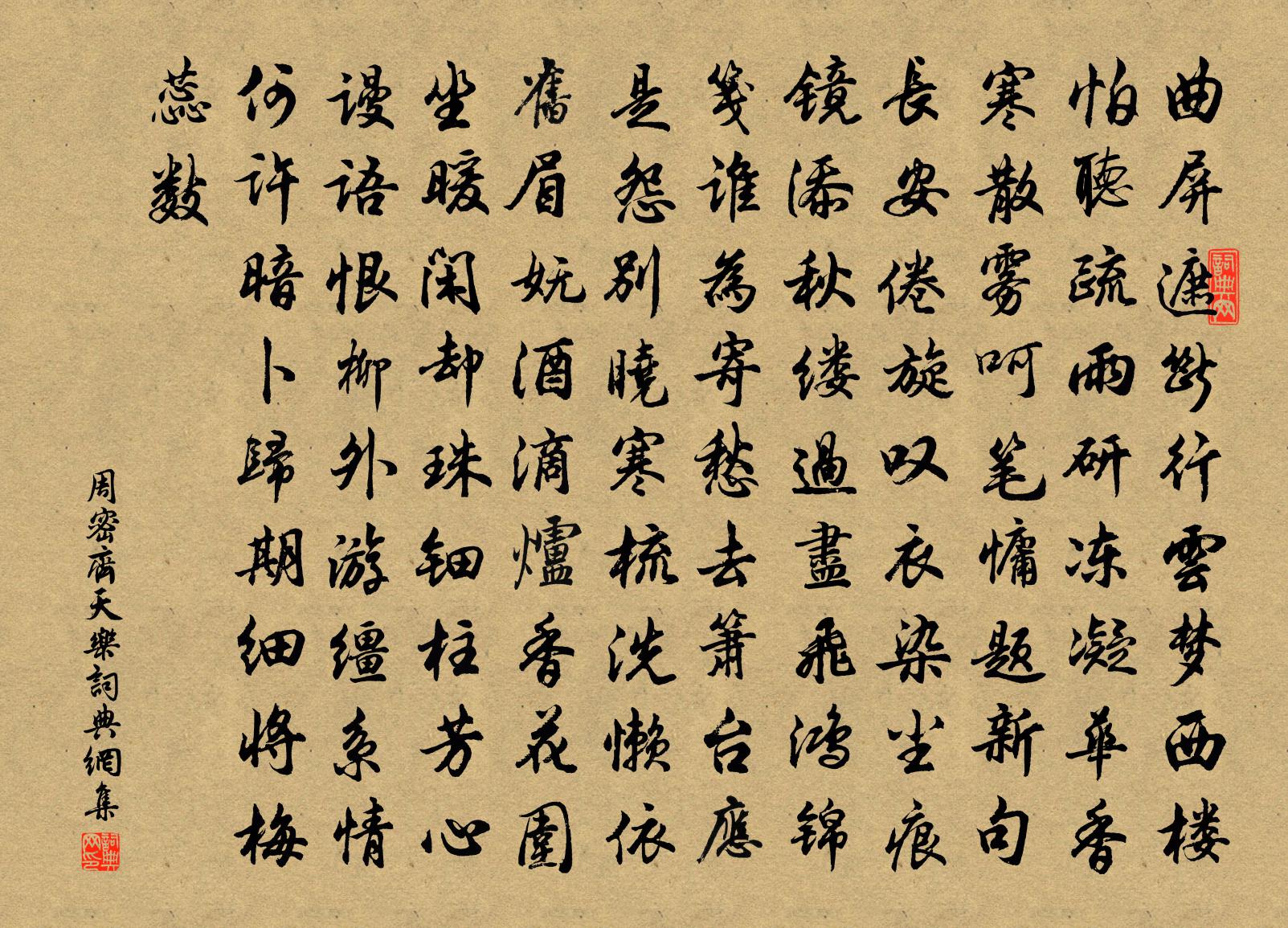 曲屏遮斷行雲夢,西樓怕聽疏雨。研凍凝華,香寒散霧,呵筆慵題新句。長安倦旋。嘆衣染塵痕,鏡添秋縷。過盡飛鴻,錦箋誰為寄愁去。