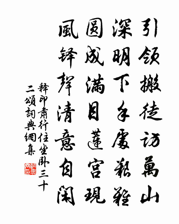 詩詞名句歷史字典書法欣賞書法字典國語詞典說文解字康熙字典古漢語字典標 題 作 者 詩 句 行住坐臥三十二頌作者:釋印肅 朝代:宋代行住坐臥三十二頌原文引領搬徒訪萬山,深明下手處艱難。圓成滿目蓮宮現,風鐸聲清意自閒。詩詞問答問:行住坐臥三十二頌的作者是誰?答:釋印肅問:行住坐臥三十二頌寫於哪個朝代?答:宋代釋印肅行住坐臥三十二頌書法欣賞行住坐臥三十二頌書法作品詩詞推薦客中月(一作望月)於鄴〔唐代〕離家凡幾宵,一望一寥寥。新魄又將滿,故鄉應漸遙。獨臨彭蠡水,遠憶洛陽橋。更有乘舟客,悽然亦駐橈。送李判官赴東江王維〔唐代〕聞道皇華使,方隨皂蓋臣。封章通左語,冠冕化文身。樹色分揚子,潮聲滿富春。遙知辨璧吏,恩到泣珠人。以詩句詠梅淡薄似龍知我意方蒙仲〔宋代〕平生惟有梅,與語覺差可。此外豈無花,周旋寧作我。浙東參政寄示會稽蓬萊閣詩軸,次韻寄題范成大〔宋代〕鰲背飛來紺碧浮,人間還有小蓬丘。不須擊水三千里,已壓中天十二樓。羽駕舊曾將夢到,芝田今合為公秋。玉霄安人趙氏哀詞程公許〔宋代〕商飈之蕭瑟兮,百草莽其披離。何深之敷蕙兮,藹芳華其不虧。物有生而專媺兮,豈伊人而不然。見浚房其窈窕兮搗練子 贈寧海州於清馬鈺〔元代〕玄中妙,沒言傳。勸君休縱馬猿顛。*心香,達聖賢。聖賢喜,賜良緣。暗中細細剔根源。性靈靈,得做仙。贈武十七諤李白〔唐代〕馬如一匹練。明日過吳門。乃是要離客。西來欲報恩。笑開燕匕首。拂拭竟無言。狄犬吠清洛。天津成塞垣。愛子再至會稽鄭獬〔宋代〕自憐多病趁朝稀,合引朱轓東路歸。名姓未通丹陛下,夢魂已過浙江飛。人生如意即為樂,世事驚心漸覺非。正是化江南簡寂觀道士侯用晦磨劍(一作磨劍贈侯道士)呂岩〔唐代〕欲整鋒鋩敢憚勞,凌晨開匣玉龍嗥。手中氣概冰三尺,石上精神蛇一條。奸血默隨流水盡,凶豪今逐漬痕消。削平臨江仙(為顧致堯生日)韓淲〔宋代〕難老一杯春酒美,主人玉鑒清秋。九華山下共追游。朝來多爽氣,都向筆端收。台閣功名歸去好,便應袞袞公侯。行宮文天祥〔宋代〕十里宮牆一聚塵,天津晚過客愁新。花啼杜宇歸來血,樹掛蒼龍脫去鱗。神德儻存終有晉,秣陵未改已無秦。秋風遊仙詞三十三首王鎡〔宋代〕月斜天路曉風清,縹緲雲開見玉城。無數小仙參闕罷,相逢只是說長生。送王瓘同年河南司錄司馬光〔宋代〕采服昔為兒,隨親宦洛師。於今余夢想,常記舊遊嬉。佐使頭應白,書樓樹已欹。聞君行有日,使我淚交頤。張九齡徐鈞〔宋代〕祿山必兆邊陲禍,林甫終貽廟社憂。二事眼前君不悟,何須金鑒錄千秋。鼓吹曲辭·有所思沈佺期〔唐代〕君子事行役,再空芳歲期。美人曠延佇,萬里浮雲思。園槿綻紅艷,郊桑柔綠滋。坐看長夏晚,秋月生羅幃。懷古題雪十首陶谷茶雪方鳳〔宋代〕馮夷翦水飛九垓,瓊花萬樹先春開。玉堂學士愛清味,取雪烹茶真快哉。堪笑嬌娥党家妓,歌舞但知趨富貴。豈知慶建州葉守劉克莊〔宋代〕貴人列屋貯傾城,公獨齋居徹骨清。七帙高年高上品,夜窗相伴一寒檠。送張無夢歸天台查道〔宋代〕天台峻極橫海濱,金庭紫洞多真人。先生舍道心照鄰,上有羲軒為逸民。玉韞深山珠在水,圓折如虹難自晦。萬乘劉正之宜樓四章黃榦〔宋代〕屏山重回首,日暮起長思。鴻雁來翩翩,共賦棠棣詩。淮陽感懷李密〔唐代〕金風盪初節,玉露凋晚林。此夕窮塗士,鬱陶傷寸心。野平葭葦合,村荒藜藿深。眺聽良多感,徙倚獨沾襟。沾襟名句推薦荊吳相接水為鄉,君去春江正淼茫。孟浩然《送杜十四之江南 / 送杜晃進士之東吳》 我來一長嘆,知是東溪蓮。白居易《京兆府栽蓮》 日日深杯酒滿,朝朝小圃花開。朱敦儒《西江月·日日深杯酒滿》 數枝門柳低衣桁,一片山花落筆床。岑參《山房春事二首》 自我來黃州,已過三寒食。蘇軾《寒食雨二首》 問他有甚堪悲處?思量卻也有悲時,重陽節近多風雨。辛棄疾《踏莎行·庚戌中秋後二夕帶湖篆岡小酌》 如來說世界非世界。是名世界。鳩摩羅什譯《金剛經·如法受持》 解鞍欹枕綠楊橋,杜宇一聲春曉。蘇軾《西江月·頃在黃州》 東南第一名州,西湖自古多佳麗。陳德武《水龍吟·西湖懷古》 寧為蘭摧玉折,不作蕭敷艾榮。劉義慶《世說新語·言語》