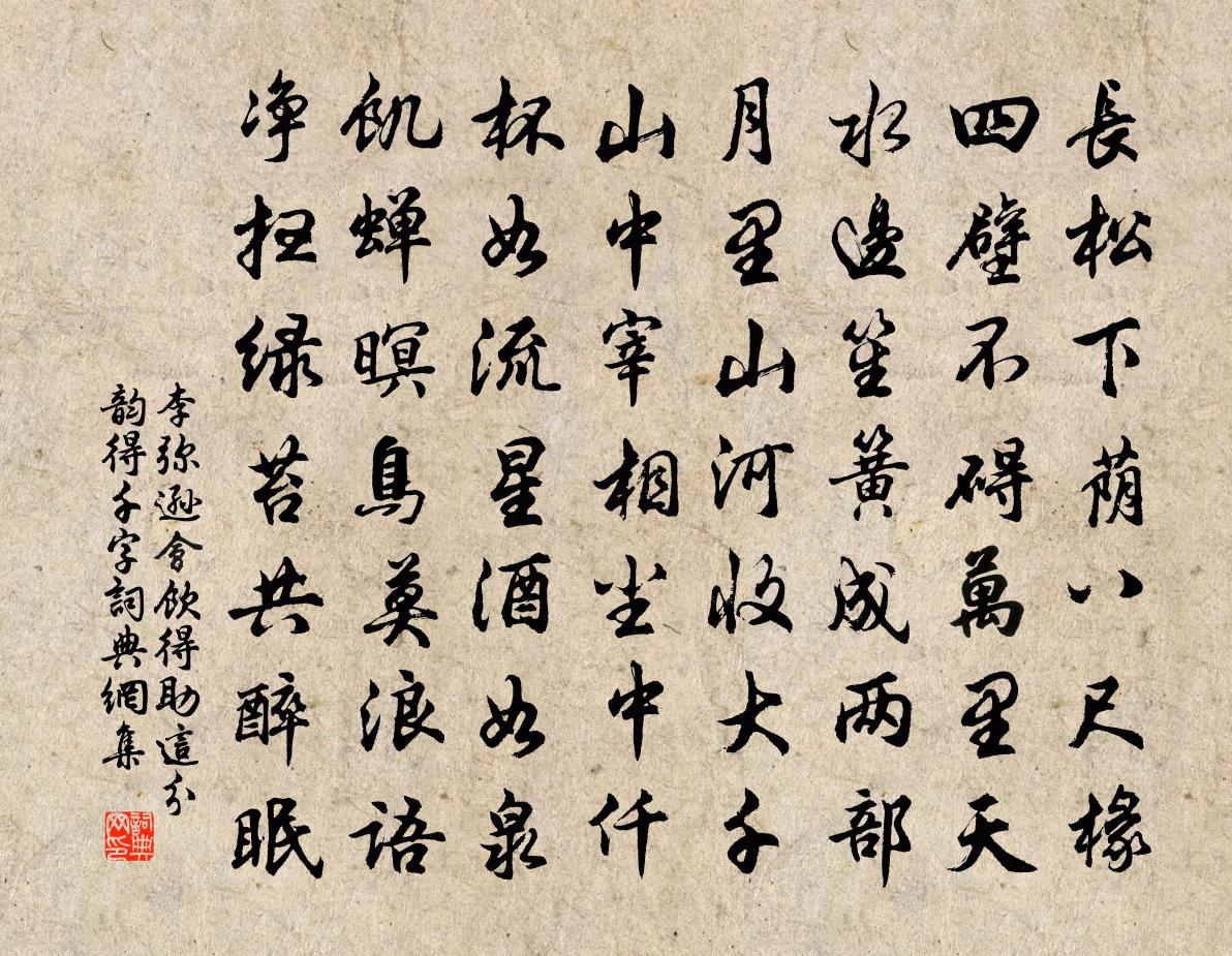 詩詞名句歷史字典書法欣賞書法字典國語詞典說文解字康熙字典古漢語字典標 題 作 者 詩 句 會飲得助這分韻得千字作者:李彌遜 朝代:宋代會飲得助這分韻得千字原文長松下蔭八尺椽,四壁不礙萬里天。水邊笙簧成兩部,月里山河收大千。山中宰相塵中仟,杯如流星酒如泉。飢蟬暝鳥莫浪語,淨掃綠苔共醉眠。詩詞問答問:會飲得助這分韻得千字的作者是誰?答:李彌遜問:會飲得助這分韻得千字寫於哪個朝代?答:宋代李彌遜會飲得助這分韻得千字書法欣賞會飲得助這分韻得千字書法作品詩詞推薦憶秦娥(元夕)張孝祥〔宋代〕元宵節。鳳樓相對鰲山結。鰲山結。香塵隨步,柳梢微月。多情又把珠簾揭。遊人不放笙歌歇。笙歌歇。曉煙輕散金沙台蘇轍〔宋代〕待罪東軒僅兩秋,搉酤事了且夷猶。獎崇善類詢輿論,過訪仁賢棹小舟。契合通家心異姓,情敦同氣邁凡流。金沙卜運算元(四明別周德遠)趙長卿〔宋代〕閒路踏花來,閒逐清和去。來去雖然總是閒,有多少傷心處。紅碧好池塘,朱綠深庭戶。隨分山歌社舞中,且樂陶鷓鴣天向子諲〔宋代〕說著分飛百種猜。泥人細數幾時回。風流可慣曾孤冷,懷抱如何得好開。垂玉箸,下香階。憑肩小語更兜鞋。再三感舊黃景仁〔清代〕大道青樓望不遮,年時系寫醉流霞。風前帶是同心結,杯底人如解語花。下杜城邊南北路,上闌門外去來車。匆匆偈頌七十六首釋師觀〔宋代〕問訊燒香,閒行靜坐。與麽分明,是個什麽。讀史羅公升〔宋代〕太初結繩制自好,庖犧倉頡計益疏。拓跋小羌行國字,鐘山丞相著新書。蔡尚書輓詞二首葉適〔宋代〕撥沙得黃金,百鍊寫光影。飛行日月上,瑩徹肝膽醒。空山慘馬鬣,何決重為礦。余哀不浪施,留寄長夜炯。燕山聞鵑范晞文〔宋代〕燕山三月初三夜,聽得啼鵑第一聲。同是小樓孤燭下,主人熟睡客驚心。採蓮曲俞桂〔宋代〕西風引袂涼雲起,鴛漿扶船浮淥水。露沁花脂茜粉香,滿柄鋒芒刺蔥指。紅綃半妥金釧明,堤上六郎闚唱聲。湘中次韻史少莊竹醉日移竹魏了翁〔宋代〕平生自許歲寒操,醉日移來三十丁。底事此君亦移轉,連明風雨喚教醒。宿村舍杜荀鶴〔唐代〕野人於我有何情,半掩柴門向月明。深夜欲眠眠未著,一叢寒木一猿聲。久雨嘆曹彥約〔宋代〕誰為戎首起邊功,萬里生靈一擲中。天為憂之連作雨,人無識者驟歌風。所期壁地今城守,不善因糧卻火攻。古道次韻姚粹正月三日游山道中口占蘇頌〔宋代〕車馬西郊踏曉光,城隅一徑繞羊腸。泉流帶雪添膏脈,山色逢春變郁蒼。雲外樓台晴掛影,風前松檜遠飄香。仁祠送韓廷評婺州市征宋祁〔宋代〕去程菸草妬藍袍,越絕天文寶婺高。五兩樵風船畫鷁,九秋犀燭鷺翻濤。吳監煮海通關賦,陸橐收金析利毫。仙酎紹興以後時享二十五首真宗〔宋代〕[膺鍾為羽]道信於神,神靈燕娭。酒有嘉德,物惟其時。緩節安歌,樂奏具宜。欣欣樂康,福祿綏之。冬夜泊僧舍方乾〔唐代〕江東寒近臘,野寺水天昏。無酒能消夜,隨僧早閉門。照牆燈焰細,著瓦雨聲繁。漂泊仍千里,清吟欲斷魂。題彭澤縣尉廳林壑之勝葉適〔宋代〕彭澤西山天秘惜,淵明未敢發幽緘。始從石尉兼王尉,洗出前岩到後岩。也只暫時供步履,可能終老卸朝衫。應須湖州歌九十八首 其八十八汪元量〔宋代〕萬里修途似夢中,天家賜予意無窮。昭儀別館香雲暖,自把詩書授國公。早秋出塞寄東台詳正學士駱賓王〔唐代〕促駕逾三水,長驅望五原。天階分斗極,地理接樓煩。溪月明關隴,戎雲聚塞垣。山川殊物候,風壤異涼暄。戍古名句推薦怠慢忘身,禍災乃作。荀子《荀子·勸學》 凍臉有痕皆是血,酸心無恨亦成灰。曹雪芹《詠紅梅花得“梅”字》 朔風吹散三更雪,倩魂猶戀桃花月。納蘭性德《菩薩蠻·朔風吹散三更雪》 颯颯西風滿院栽,蕊寒香冷蝶難來。黃巢《題菊花》 不將辛苦意,難近世間財。馮夢龍《醒世恆言·卷十四》 誠既勇兮又以武,終剛強兮不可凌。屈原《國殤》 月華如練,長是人千里。范仲淹《御街行·秋日懷舊》 山高月小,水落石出。蘇軾《後赤壁賦》 不扶自直,不鏤自雕。范曄《後漢書·列傳·周黃徐姜申屠列傳》 人行明鏡中,鳥度屏風裡。李白《清溪行 / 宣州清溪》