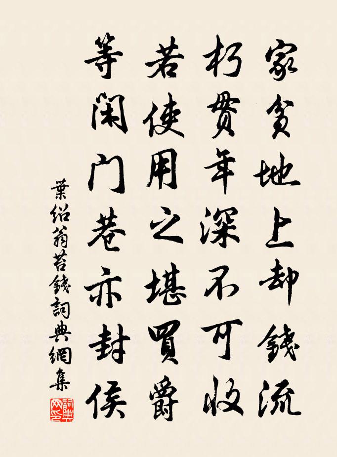 詩詞名句歷史字典書法欣賞書法字典國語詞典說文解字康熙字典古漢語字典標 題 作 者 詩 句 苔錢作者:葉紹翁 朝代:宋代苔錢原文家貧地上卻錢流,朽貫年深不可收。若使用之堪買爵,等閒門巷亦封侯。詩詞問答問:苔錢的作者是誰?答:葉紹翁問:苔錢寫於哪個朝代?答:宋代葉紹翁苔錢書法欣賞苔錢書法作品詩詞推薦八月十五日夜湓亭望月白居易〔唐代〕昔年八月十五夜,曲江池畔杏園邊。今年八月十五夜,湓浦沙頭水館前。西北望鄉何處是?東南見月幾回圓。臨風浣溪沙 元豐七年十二月二十四日從泗州劉蘇軾〔宋代〕細雨斜風作曉寒。淡煙疏柳媚晴灘。入淮清洛漸漫漫。雪沫乳花浮午盞,蓼茸蒿筍試春盤。人間有味是清歡。筆貫休〔唐代〕莫訝書紳苦,功成在一毫。自從蒙管錄,便覺用心勞。手點時難棄,身閒架亦高。何妨成五色,永願助風騷。梅花張問陶〔清代〕臘尾春頭放幾枝,風霜雨露總無私。美人遺世應如此,明月前身未可知。照影別開清淨相,傳神難得性靈詩。萬花早夏閒興白居易〔唐代〕簟冷乍逞新氣味,扇涼重敘舊恩情。山礬圖牟巘五〔宋代〕玉殿何勞定等差,弟兄俱是老涪受獎。季方也與新名字,免得人呼作瑒花。次韻李士雄子飛獨游西園折牡丹憶弟子奇二首黃庭堅〔宋代〕西園春色才桃李,蜂已成圍蝶作團。更欲開花比京洛,放教姚魏接山丹。江南李群玉〔唐代〕鱗鱗別浦起微波,泛泛輕舟桃葉歌。斜雪北風何處宿,江南一路酒旗多。寄袁校書(一作袁都校書)許渾〔唐代〕擾擾換時節,舊山琪樹陰。猶乖清漢志,空負白雲心。廣陌埃塵遠,重門管吹深。勞歌極西望,芸省有知音。黃蓮花韓維〔宋代〕一水盈盈獨立時,六銖衣薄透冰肌。臨川已沒龍丘遠,辜負芳妍乞好祠。送何安中之官新安錄事賀鑄〔宋代〕帶郭荒山百匝牢,躋攀幾見病猿猱。官糧可數才雞肋,吏事懸知倍馬曹。芸閣有書行且召,萱堂須養未容高。慶湖句宋祁〔宋代〕珠簾約住牡丹風。殉節詩一解方氏〔宋代〕昊天懵懵,四海洶洶,趙氏終衰,妖孽景從。韋侍郎山居王維〔唐代〕幸忝君子顧。遂陪塵外蹤。閒花滿岩谷。瀑水映杉松。啼鳥忽臨澗。歸雲時抱峰。良游盛簪紱。繼跡多夔龍。詎枉滿庭芳佚名〔宋代〕西掖南宮,黃扉青瑣,年來有分終須。從容曳履,衣錦賦歸歟。暫樂終南佳處,供笑傲、松菊庭除。行看取,一封茉莉鄭剛中〔宋代〕真香入玉初無信,香欲尋人玉始開。不是滿枝生綠葉,端須認作嶺頭梅。送僧游天台貫休〔唐代〕囊空心亦空,城郭去騰騰。眼作么是眼,僧誰識此僧。歇隈紅樹久,笑看白雲崩。已有天台約,深秋必共登。明皇祀圜丘樂章。雍和佚名〔唐代〕爛雲普洽,律風無外。千品其凝,九賓斯會。禋尊晉燭,純犧滌汰。玄覆攸廣,鴻休汪濊。代書寄歐陽永叔四十韻梅堯臣〔宋代〕始謫夷陵日,當居建德年。一書冤逐客,四詠繼稱賢。自謂臨江徼,相逢莫我先。白醪封畫榼,素鯉養泓泉。戒吏仙學堂李仲光〔宋代〕天人異所稟,事物皆生知。強名仙學堂,此語將誰欺。我欲借隙地,虛檐敞茅茨。琅琅誦玉章,勉力探希夷。名句推薦貧者士之常也,死者人之終也,處常得終,當何憂哉?列子及其弟子《列子·天瑞》 玉勒雕鞍遊冶處,樓高不見章台路。歐陽修《蝶戀花·庭院深深深幾許》 胡瓶落膊紫薄汗,碎葉城西秋月團。王昌齡《從軍行七首》 言必有主,行必有法,親人必有方。戴聖《大戴禮記·曾子立事第四十九》 何以解憂?唯有杜康。曹操《短歌行》 為問元戎竇車騎,何時返旆勒燕然。皇甫冉《春思》 夫君子之行,靜以修身,儉以養德。諸葛亮《誡子書》 幽人歸獨臥,滯慮洗孤清。張九齡《感遇十二首》 連山變幽晦,綠水函晏溫柳宗元《飲酒》 不患人之不己知,患不知人也。孔子弟子《論語·學而篇》