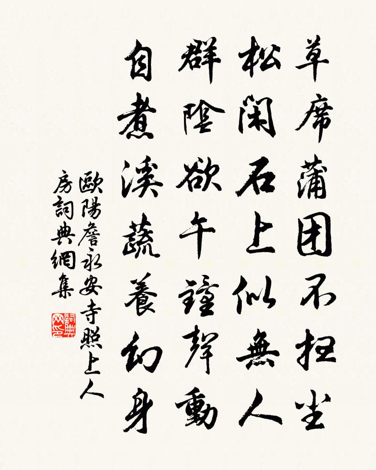 詩詞名句歷史字典書法欣賞書法字典國語詞典說文解字康熙字典古漢語字典標 題 作 者 詩 句 永安寺照上人房作者:歐陽詹 朝代:唐代永安寺照上人房原文草蓆蒲1~1團不掃塵,松閒石上似無人。群陰欲午鐘聲動,自煮溪蔬養幻身。詩詞問答問:永安寺照上人房的作者是誰?答:歐陽詹問:永安寺照上人房寫於哪個朝代?答:唐代問:永安寺照上人房是什麼體裁?答:七絕歐陽詹永安寺照上人房書法欣賞永安寺照上人房書法作品注釋全唐詩:卷349-62詩詞推薦林省吾輓辭王柏〔宋代〕羌若人兮大帶而深衣,張拱徐趨兮儼乎其若思。動有則兮神定,澹無欲兮心夷。便儇嶔{上山下戲}之紛吾前兮,鹿頭關過龐士元廟陸游〔宋代〕士元死千載,悽惻過遺祠。海內常難合,天心豈易知。英雄今古恨,父老歲時思。蒼蘚無情極,秋來滿斷碑。南山田中行李賀〔唐代〕秋野明,秋風白,塘水漻漻蟲嘖嘖。雲根台蘚山上石,冷紅泣露嬌啼色。荒畦九月稻叉牙,蟄螢低飛隴徑斜。石脈贈翁承贊漆林書堂詩蕭項〔唐代〕軺車故國世應稀,昔日書堂二紀歸。手植松筠同茂盛,身榮金紫倍光輝。入門鄰里喧迎接,列坐兒童見等威。卻對華山文同〔宋代〕石蓮峨峨橫紫霄,中瀉萬丈銀河水。安得大箭長八尺,欲與天神博於此。次韻門下劉侍郎直宿寄蘇左丞蘇轍〔宋代〕雷雨連年起臥龍,穆然台閣有清風。一時畫諾雖雲舊,此日都偷本自公。松竹經霜俱不改,鹽梅共鼎固非同。一篇鵲橋仙佚名〔宋代〕東西二府,掖垣一相,誰似碩人兄弟。驂鸞來伴紫陽仙,要同享、橘中千歲。銀燈初試,花城不夜,鐵馬響冰春碎金菊對芙蓉馮取洽〔宋代〕寶鏡緣空,玉簪點水,盪搖千頃寒光。正江妃月姊,斗理明妝。扶闌一笑開詩眼,少容我、吟諷其旁。一川風露,頭白吟邵雍〔宋代〕頭白已多時,況能垂白髭。不如猶甚幸,竊比未全衰。潤屋雖無鏹,承家卻有兒。敢言貧淨潔,似我亦應稀。鳳棲梧佚名〔宋代〕綠暗紅稀春已暮,燕子銜泥,飛入垂楊處。柳絮欲停風不住,杜鵑聲里山無數。 竹杖芒鞋無定據,穿過溪南,獨次韻王魯齋大安古道倪公武〔宋代〕著腳爭些子,公私只兩歧。正途元自穩,捷徑不勝巘。見透行須透。心移境亦移。前人須指點,進步莫遲疑。法曹羅立之酒邊舉數首皆仆故人為我寄聲戴復古〔宋代〕佳士欣相識,吟邊問姓名。官為三語掾,詩到五言城。野客可憐我,故人煩寄聲。白頭歸故隱,秋後會群英。山居十首陳造〔宋代〕萍梗才餬口,爬沙亦畏塗。悠然三徑地,有此合金軀。乘興聊吟筆,無弦且槁梧。幽居喜客醉,未遣秫田蕪。禪人並化主寫真求贊釋正覺〔宋代〕情謂之外兮言路那通,形殼之外兮模畫那同。一方明有月,萬簌嘯而風。其應而妙,其用而沖。圖星之拱兮周羅而挽妹婿汪汻四首許月卿〔宋代〕奉禮徒員外,京師枉治中。二郎槐不做,四老橘成空。三鳳壁岩子,雙龍寶劍雄。萬人真莫贖,愁絕老坡翁。答周德夫見寄黃庭堅〔宋代〕自我官東南,久無西北書。周郎縱橫才,欬唾落明珠。寄聲相勞苦,敦厚不忘初。窮山江莽蒼,胸次赤寬舒。念君少年游·參差煙樹灞陵橋柳永〔宋代〕參差煙樹灞陵橋,風物盡前朝。衰楊古柳,幾經攀折,憔悴楚宮腰。 夕陽閒淡秋光老,離思滿蘅皋。一曲陽關,朱處士相與有山水之願見送至南康作此以別之徐鉉〔唐代〕憐君送我至南康,更憶梅花庚嶺芳。多少仙山共游在,原君百歲尚康強。金菊對芙蓉 九月二十五日壽金桐岡陳櫟〔元代〕壽宿騰光,壽香裊碧,郁蔥枝上梧桐。記紱麟令旦,門掛弧蓬。今年東閣郎皆侍,懷章綬、拜捧金鐘。榮華富貴,贊達磨釋印肅〔宋代〕妙契觸目菩提,誰觀達磨西歸。只是老胡捏怪,好與三十竹篦。試問參方知不知,狂書早自落便宜。名句推薦舌為利害本,口是禍福門。馮夢龍《醒世恆言·卷二十九》 陽生陰長,陽殺陰藏佚名《黃帝內經·素問·陰陽應象大論》 慈母手中線,遊子身上衣。孟郊《遊子吟 / 迎母漂上作》 有田不耕倉廩虛,有書不讀子孫愚。佚名《增廣賢文·上集》 十年磨一劍,霜刃未曾試。賈島《劍客 / 述劍》 攜壺酌流霞,搴菊泛寒榮。李白《九日》 長安陌上無窮樹,唯有垂楊綰別離。劉禹錫《楊柳枝詞九首》 躬自厚而薄責於人,則遠怨矣。孔子弟子《論語·衛靈公篇》 鳥下綠蕪秦苑夕,蟬鳴黃葉漢宮秋。許渾《鹹陽城東樓 / 鹹陽城西樓晚眺 / 西門》 華而不實,恥也。左丘明《國語·晉語·秦伯享重耳以國君之禮》
