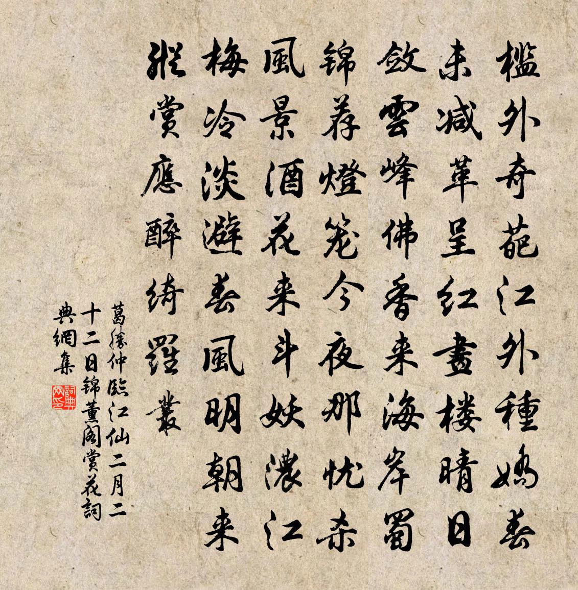 詩詞名句歷史字典書法欣賞書法字典國語詞典說文解字康熙字典古漢語字典標 題 作 者 詩 句 臨江仙(二月二十二日錦薰閣賞花)作者:葛勝仲 朝代:宋代原文檻外奇葩江外種,嬌春未減革呈紅。畫樓晴日斂雲峰。佛香來海岸,蜀錦薦燈籠。今夜那憂殺風景,酒花來斗妖濃。江梅冷淡避春風。明朝來縱賞,應醉綺羅叢。詩詞問答問:《臨江仙(二月二十二日錦薰閣賞花)》的作者是誰?答:葛勝仲問:該詩寫於哪個朝代?答:宋代書法欣賞臨江仙(二月二十二日錦薰閣賞花)書法作品詩詞推薦懷寄寇元弼王文舉十首之六登黃樓賀鑄〔宋代〕何處延明月,東城百尺樓。故人那得見,後夜是中秋。偈頌六十五首釋普濟〔宋代〕錦城歌管日紛紛,半入江風半入雲。此曲只應天上有,人間能是幾回聞。新安道中許月卿六〔宋代〕白水黃山天一青,雪梨金柳眼雙明。要知來日清明日,請聽鵑鳴第一聲。初夏即事十二解楊萬里〔宋代〕密有花紅綠剌長,似來作伴石榴芳。金櫻身子玫瑰臉,更吃餳枝蜜果香。蟾宮曲·嘆世馬致遠〔元代〕鹹陽百二山河,兩字功名,幾陣干戈。項廢東吳,劉興西蜀,夢說南柯。韓信功兀的般證果,蒯通言那裡是風魔?韓魏公生日三首強至〔宋代〕新秋再宿澂涼兆,間氣生才歷世稀。綠髮文章驚紫殿,青雲事業照黃扉。力陳社稷安危計,首斡乾坤造化機。二相雨中有懷廖行之〔宋代〕客里春三月,江頭雨半旬。囊空那得醉,吟苦未甘貧。愁逐花枝老,詩隨節物新。郴流去湘水,欲此寄雙鱗。詠雪駱賓王〔唐代〕龍雲玉葉上,鶴雪瑞花新。影亂銅烏吹,光銷玉馬津。含輝明素篆,隱跡表祥輪。幽蘭不可儷,徒自繞陽春。太子納妃太平公主出降李治〔唐代〕龍樓光曙景,魯館啟朝扉。艷日濃妝影,低星降婺輝。玉庭浮瑞色,銀榜藻祥徽。雲轉花縈蓋,霞飄葉綴旂。雕軒挽葛夫人二首劉克莊〔宋代〕不惟婆嫂鹹嗟惜,學語兒知此母賢。味薄居常喜蔬食,心慈勸勿用蒲鞭。若非騰上天宮裡,必是迎歸海岸邊。九十寄襄州程大夫陳師道〔宋代〕中年為吏晚專城,不獨身榮府亦榮。江漢風流見羊杜,相門經術有韋平。十年一別音書絕,萬里相看骨肉情。今代題楊汝士玉蕊帖傅子容〔宋代〕比瑒更攀總未佳,要須博物似張華。因觀異代前賢貼,知是唐昌玉蕊花。游衢州烏石山觀僧房畫山水釋文珦〔宋代〕苔徑高低草樹寒,雲從隨處有飛湍。山中老宿居來熟,卻畫他山水石看。送鎮知客釋心月〔宋代〕海南一片舊田園,松竹迎風幸可憐。拂拭藤枝倚床畔,隄防人問祖師禪。清平樂·鳳城春淺陳允平〔宋代〕鳳城春淺,寒壓花梢顫。有約不來樑上燕,十二繡簾空卷。去年共倚鞦韆,今年獨倚闌乾。誤了海棠時候,不成直除夜二首蘇轍〔宋代〕七十三年客,相從尚幾年。西方他日事,東魯一經傳。漸解平生縛,初安半夜禪。紛紛爭奪際,何意此心全。送吏部李侍郎東歸得歸字蘇頲〔唐代〕陌上有光輝,披雲向洛畿。賞來榮扈從,別至惜分飛。泉溜含風急,山煙帶日微。茂曹今去矣,人物喜東歸。雨夜思子虡陸游〔宋代〕兀兀過遙夜,悠悠擁破衾。峭寒侵病骨,殘雨滴愁心。人別易千里,書來真萬金。醉眠差似可,誰與伴孤斟?魏忠獻公輓辭三首司馬光〔宋代〕瀛海吁謨定,宗祧指顧安。鴻勛柱石壯,勁節雪霜寒。翼亮三朝久,初終一德完。如何未黃髮,壟柏已丸丸。林戶求明道堂詩二首陳淳〔宋代〕秉彝同是得天生,道在其中本自明。氣為稟來微有蔽,欲因感處復多萌。磨礱須到十分粹,克治全教一味清。從此名句推薦尊嚴而憚,可以為師荀子《荀子·致士》 今夕復何夕,共此燈燭光。杜甫《贈衛八處士》 知之者不如好之者,好之者不如樂之者。孔子弟子《論語·雍也篇》 念蘭堂紅燭,心長焰短,向人垂淚。晏殊《撼庭秋·別來音信千里》 深林人不知,明月來相照。王維《竹里館》 新知遭薄俗,舊好隔良緣。李商隱《風雨》 不可以一時之譽,斷其為君子;不可以一時之謗,斷其為小人。馮夢龍《警世通言·卷四》 為奏薰琴唱,仍題寶劍名。張九齡《奉和聖制送尚書燕國公赴朔方》 寒山幾堵,風低削碎中原路,秋空一碧無今古。陳維崧《醉落魄·詠鷹》 北郭清溪一帶流,紅橋風物眼中秋,綠楊城郭是揚州。王士禎《浣溪沙·紅橋》