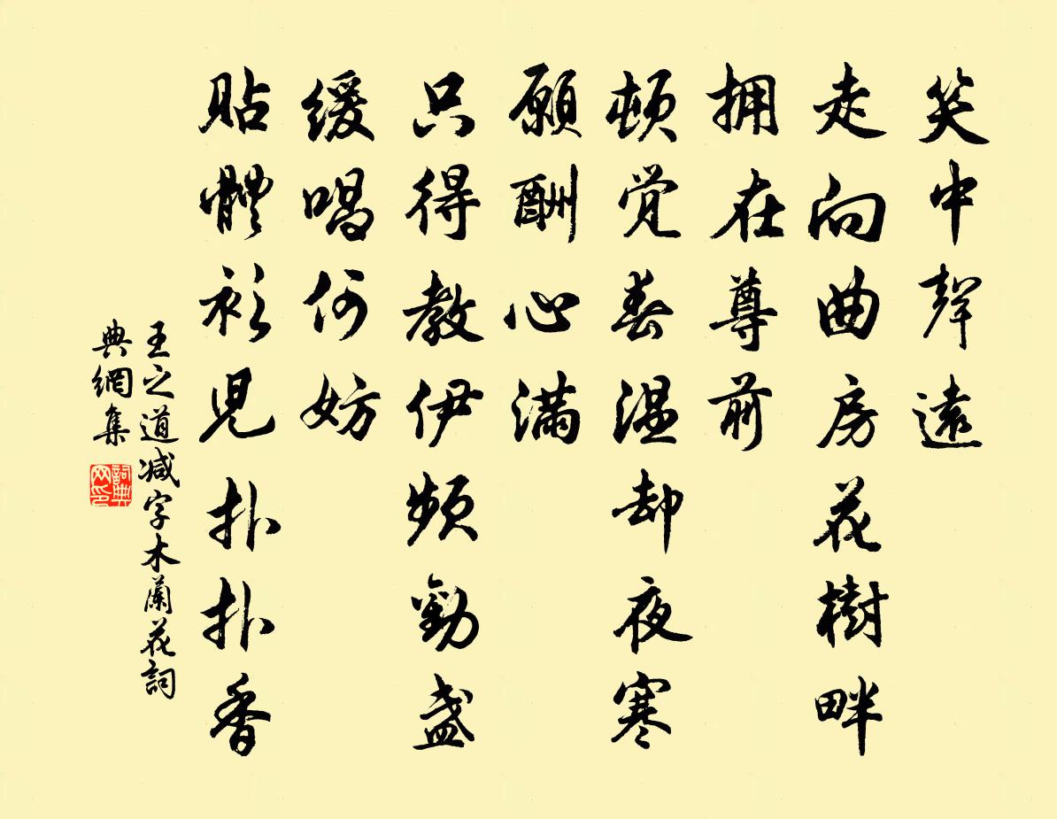 詩詞名句歷史字典書法欣賞書法字典國語詞典說文解字康熙字典古漢語字典標 題 作 者 詩 句 減字木蘭花作者:王之道 朝代:宋代減字木蘭花原文笑中聲遠。走向曲房花樹畔。擁在尊前。頓覺春溫卻夜寒。願酬心滿。只得教伊頻勸盞。緩唱何妨。貼體衫兒撲撲香。詩詞問答問:減字木蘭花的作者是誰?答:王之道問:減字木蘭花寫於哪個朝代?答:宋代問:減字木蘭花是什麼體裁?答:詞王之道減字木蘭花書法欣賞減字木蘭花書法作品詩詞推薦梅陸游〔宋代〕若耶溪頭春意慳,梅花獨秀愁空山。逢時決非桃李輩,得道自保冰雪顏。僊去要令天下惜,折來聊伴放翁閒。人中花時遍游諸家園陸游〔宋代〕為愛名花抵死狂,只愁風日損紅芳。綠章夜奏通明殿,乞借春陰護海棠。懷鄭洎孟遲〔唐代〕風蘭舞幽香,雨葉墮寒滴。美人來不來,前山看向夕。促拍滿路花(瑞蔭亭贈錦屏苗道人)趙師俠〔宋代〕連枝蟠古木,瑞蔭映晴空。桃江江上景,古今同。忙中取靜,心地盡從容。掃盡荊榛蔽,結屋誅茅,道人一段家風細雨李商隱〔唐代〕蕭灑傍回汀,依微過短亭。氣涼先動竹,點細未開萍。稍促高高燕,微疏的的螢。故園菸草色,仍近五門青。聖泉蔡襄〔宋代〕源流出何山,涌涸茲有異。湛然盈不泓,餘波下金地。清甘本無滓,渴飲得真味。端能發茶色,博亦資農利。矧茲四月八日三絕劉克莊〔宋代〕徵在生夫子,摩耶育釋迦。人人衣逢掖,個個著袈裟。和仲固春日村居即事十二絕胡寅〔宋代〕似聞寂寂帶經鋤,老圃何知莫問渠。況是漢陰機事息,豈憂芳草翳嘉蔬。減字木蘭花謝逸〔宋代〕疏疏密密,薝蔔林中飛玉出。妒舞欺梅。悠揚隨風去卻回。遙岑玉刻,不見雲中浮寸碧。夜色清妍。庭下交光月午送俞元宰失薦東歸強至〔宋代〕蛟龍水淺一戰失,鴻雁天寒相背飛。疏柳不堪霜後折,故人轉覺酒邊稀。朱顏有改宜看鏡,黃卷無窮且杜扉。事業石門寺趙師秀〔宋代〕寺外山偕石,門因鑿石開。野花黃類菊,寒筍綠黏苔。官為看田至,僧方乞食回。一雙檐際鴿,空覷出生台。題嘉祥驛孟遲〔唐代〕樹頂煙微綠,山根菊暗香。何人獨鞭馬,落日上嘉祥。殉節詩一解方氏〔宋代〕昊天懵懵,四海洶洶,趙氏終衰,妖孽景從。月珠寺明月樓程少逸〔宋代〕江上群峰潑黛濃,水村煙渚夕陽紅。一聲啼鳥催耕去,何處龍歸急雨中。舊遊一絕蘇籀〔宋代〕慨悵秦關舊儕侶,綾袍韘{左韋右占}火鐮囊。南來放馬遵舟楫,鱸鱖西風號本鄉。高枕陸游〔宋代〕高枕閒看古篆香,世間萬事本茫茫。偶亡塞馬寧非福?太察淵魚恐不祥。每與諸兒論今古,常思百世業耕桑。危機浣溪沙·樓倚春江百尺高張先〔宋代〕樓倚春江百尺高。煙中還未見歸橈。幾時期信似江潮。花片片飛風弄蝶,柳陰陰下水平橋。日長才過又今宵。甲子秋八月偶思出遊往往累日不能歸或遠至傍陸游〔宋代〕鄉閭敬老意常勤,一味甘鮮必見分。大胾在前無箸食,始知富貴本浮雲。龍母廟范成大〔宋代〕孝龍分職隸湘西,天許寧親歲一歸。風雹春春損桃李,山中寒食尚冬衣。立春日雪和趙端質韻王之道〔宋代〕春寒有信不逾期,肯為衰顏獨見欺。白雪已輸梅斗早,綠樽尤與火相宜。擷來野蔌和萱草,分得江魚貫柳枝。刺史名句推薦博學而詳說之,將以反說約也。孟子《孟子·離婁章句下·第十五節》 芰荷迭映蔚,蒲稗相因依。謝靈運《石壁精舍還湖中作》 君子恥其言而過其行。孔子弟子《論語·憲問篇》 寒更承夜永,涼夕向秋澄。駱賓王《送別》 綠陰不減來時路,添得黃鸝四五聲。曾幾《三衢道中》 知不知,上矣。過者之患,不知而自以為知。呂不韋《呂氏春秋·論·似順論》 曉月過殘壘,繁星宿故關。司空曙《賊平後送人北歸》 宜如臨深淵,如履薄冰,戰戰慄栗,日慎一日。范曄《後漢書·本紀·光武帝紀上》 山中無甲子,寒盡不知年。吳承恩《西遊記·第一回》 私勿與人,謀必辟。來俊臣《羅織經·治下卷第三》