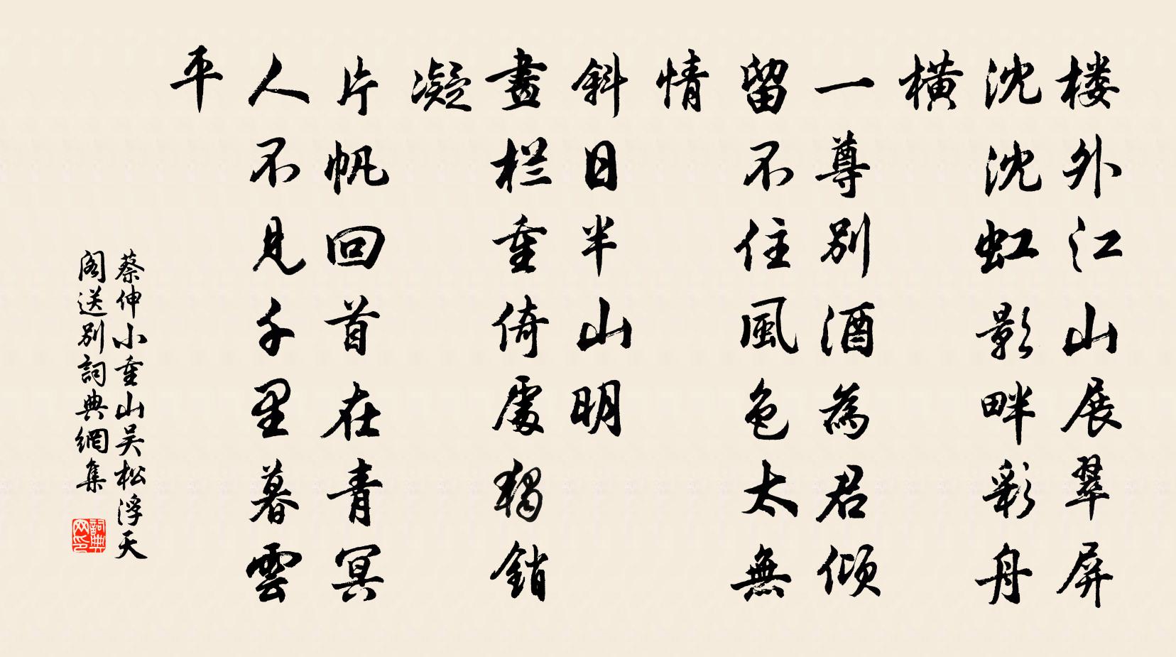 詩詞名句歷史字典書法欣賞書法字典國語詞典說文解字康熙字典古漢語字典標 題 作 者 詩 句 小重山(吳鬆浮天閣送別)作者:蔡伸 朝代:宋代小重山(吳鬆浮天閣送別)原文樓外江山展翠屏。沈沈虹影畔,彩舟橫。一尊別酒為君傾。留不住,風色太無情。斜日半山明。畫欄重倚處,獨銷凝。片帆回首在青冥。人不見,千里暮雲平。詩詞問答問:小重山(吳鬆浮天閣送別)的作者是誰?答:蔡伸問:小重山(吳鬆浮天閣送別)寫於哪個朝代?答:宋代問:小重山(吳鬆浮天閣送別)是什麼體裁?答:詞蔡伸小重山(吳鬆浮天閣送別)書法欣賞小重山(吳鬆浮天閣送別)書法作品詩詞推薦和虞永康梅花十絕句魏了翁〔宋代〕蓬蒿已逐曉霜眠,玉立孤標漢綺園。月澹風輕雲欲壓,精神千古對羲軒。秋興章甫〔宋代〕宿昔驅蠅手,今還把蟹螯。家愁難止酒,天氣近登高。歲月形容改,鄉關夢寐勞。小窗無晤對,風葉暮蕭騷。寄題崔校書郊舍黃滔〔唐代〕一片寒塘水,尋常立鷺鷥。主人貧愛客,沽酒往吟詩。和蔣御帶薦合中三偈釋師觀〔宋代〕威音那畔絕安排,個裡何曾有去來。如是住而無所住,摩醯眼向頂門開。長沙驛前南樓感舊(昔與德公別於此)柳宗元〔唐代〕海鶴一為別,存亡三十秋。今來數行淚,獨上驛南樓。偈頌一百一十七首釋紹曇〔宋代〕國有世臣,伊周是則。神政冰清,忠謨鯁直,存方寸地子孫耕,黍稷非馨深種德。美則美矣,這爭如何。巨闢十三偈頌一百三十六首釋惟一〔宋代〕琢雪雕冰,攢花簇錦。鄰義昭昭,友義炯炯。扶人上樹,推人下井。劫石可消,此恨難殞。鳳鳴洞史昌卿〔宋代〕何年雷斧鑿山裂,六月蒼崖細飛雪。孤鳳一去聲不聞,海水桑田幾興滅。我知仙去仙尚存,時見真形生岩穴。青天贈趙子野歌周文璞〔宋代〕與君雖為外兄弟,語話尋常見肝肺。自從不見半年餘,每望吳雲輒流涕。苹溪松江同一波,半年不見當奈何。長安此君室方蒙仲〔宋代〕泛菊秋始佳,愛蓮夏方娛。不如交此君,清興無時無。思二亭送光祿謝寺丞歸滁陽歐陽修〔宋代〕吾嘗思豐樂,魂夢不在身。三年永陽謫,幽谷最來頻。谷口兩三家,山泉為四鄰。但聞山泉聲,豈識山意春。春至中呂紅繡鞋佚名〔元代〕孤雁叫教人怎睡,一聲聲叫的孤淒。向月朋中和影一樣飛。你雲中聲嘹亮,我枕上淚雙垂。雁兒我你爭個甚的。立春陳師道〔宋代〕馬蹄殘雪未成塵,梅子梢頭已著春。巧勝向人真奈老,衰顏從俗不宜新。高門肯送青絲菜,下里誰思白髮人。共學扇子詩李石〔宋代〕機鋒相拄不爭多,父舞三台子唱歌。若問一時同啐啄,菩提般若六波羅。次韻答斌老病起獨游東園二首黃庭堅〔宋代〕主人心安樂,花竹有和氣。時從物外賞,自益酒中味。斸枯蟻改穴,掃籜筍迸地。萬籟寂中生,乃知風雨至。三用韻何夢桂〔宋代〕貧女傷莫年,有淚不可挹。秦川五色錦,半世勞獨織。織花空過眼,新故總塵跡。撫機悲歲年,顏貌非故夕。妾心題鄧寨周氏小園王之望〔宋代〕徑草荒春綠作堆,東風深入小園來。可憐幾陣嫣香裹,立盡庭前數樹梅。趨郡回姜特立〔宋代〕老去猶趨府,往來添客愁。丹楓漁舍晚,花麥野田秋。與枯崖悟師胡仲弓〔宋代〕振錫歸來又許時,苔痕猶污坐禪衣。時非不定空懷古,慚愧高人蚤見幾。冬夕陸游〔宋代〕不寐起中夕,披衣增慨慷。千金空市骨,三沐竟刳腸。世事粗能識,吾生安用長!布裘茆屋底,死去亦芬芳。名句推薦還始覺、留情緣眼,寬頻因春。吳文英《渡江雲三犯·西湖清明》 絳雪生涼,碧霞籠夜,小立中庭蕪地。吳文英《拜星月慢·林鐘羽姜石帚以盆蓮數十置中庭宴客其中》 織婦何太忙,蠶經三臥行欲老。元稹《織婦詞》 大風起兮雲飛揚。威加海內兮歸故鄉。劉邦《大風歌》 思其艱以圖其易佚名《尚書·周書·君牙》 攻人之惡毋太嚴,要思其堪受;教人以善毋過高,當使其可從。洪應明《菜根譚·概論》 行雲卻在行舟下,空水澄鮮,俯仰留連,疑是湖中別有天。歐陽修《採桑子·畫船載酒西湖好》 迢迢牽牛星,皎皎河漢女。佚名《迢迢牽牛星》 禁里疏鍾官舍晚,省中啼鳥吏人稀。王維《酬郭給事 / 贈郭給事》 人生自古誰無死?留取丹心照汗青。文天祥《過零丁洋》