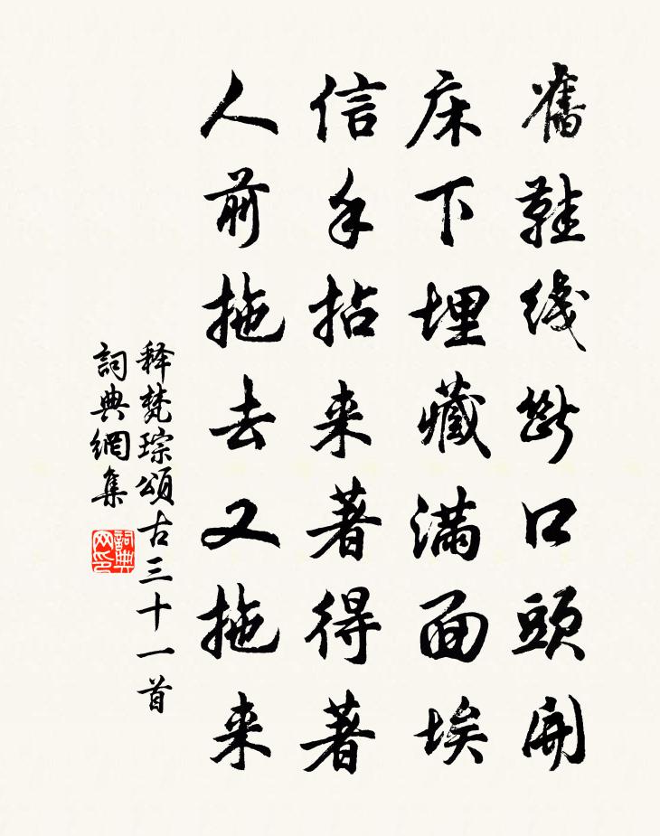 詩詞名句歷史字典書法欣賞書法字典國語詞典說文解字康熙字典古漢語字典標 題 作 者 詩 句 頌古三十一首作者:釋梵琮 朝代:宋代頌古三十一首原文舊鞋線斷口頭開,床下埋藏滿面埃。信手拈來著得著,人前拖去又拖來。詩詞問答問:頌古三十一首的作者是誰?答:釋梵琮問:頌古三十一首寫於哪個朝代?答:宋代釋梵琮頌古三十一首書法欣賞頌古三十一首書法作品詩詞推薦午日項安世〔宋代〕一杯聊解獨醒嘩,老眼猶明纏臂花。煮角沈筒隨地俗,賜衣題墨又天涯。千年菖本鬚眉古,九蕊戎葵節纛華。景物感興石介〔宋代〕村導枕何所適,枕種木樹桑枕梓。田園枕繞家舍,遠不逾十里。款段足乘騎,代步而已矣。但識畜駑駘,安知有騏淳熙戊戌將命廣東侍親攜孥十一月至安仁留蔡戡〔宋代〕憶昨南遊日,今餘二十年。扶輿潘母健,舉案孟光賢。遠宦徒勞耳,重來倍愴然。若非吾小阮,隻影更誰憐。【中呂】十二月過堯民歌_靜慘慘煙霞佚名〔元代〕靜慘慘煙霞嶺外,響潺潺澗水橋西。光燦燦銀河倒瀉,高聳聳碧玉盤堆。滿山滿樹幽微景致,錦模糊一帶屏圍。更翠芳園董嗣杲〔宋代〕翠挹南山樹石蒼,五花亭外萬花芳。雲芝栱斗晴檐濕,金字屏風水榭涼。柳接蘇堤無空地,萍侵蘭枻有深坊。未幾八月十八日天曉二首方回〔宋代〕河中船已動,岸亦有人行。城北鐘聲斷,樓東鬼宿明。倚□□酒醒,搔首小詩成。□□中秋熱,今朝始漸清。寄徐稚山王洋〔宋代〕曾攬軺軒一整冠,江西吏膽至今寒。疲民仰德方為貴,野老言公不似官。身必靜休猶是病,心無揀擇始知安。高情幽恨詩安邑坊女〔唐代〕卜得上峽日,秋江風浪多。巴陵一夜雨,腸斷木蘭歌!送趙德老端明帥蜀樓鑰〔宋代〕身名俱泰老尚書,叱馭寧辭萬里途。兩地恩榮真赫奕,四川父老定歡呼。乖崖袍帶今重見,清獻琴龜我更無。頻向鷓鴣天石耆翁〔宋代〕借問枝頭昨夜春。已傳訊息到柴門。頻看秀色無多艷,拖得清香不見痕。山矗矗,水粼粼。村南村北冷銷魂。人間清心鏡 贈小李仙馬鈺〔元代〕李宜僧,僧學道。道要玄機,日常尋討。討論得、常淨常清,清心意最好。好降心,心塵掃。掃除淨,自是通明秘導引佚名〔宋代〕紫鸞飛去,玉殿鎖坤寧,珠箔儼銀屏。仙家不似人間世,無處覓雲軿。金鋪肅肅湛嚴扃,天冊下彤庭。嘉觴好在新新隱四首新亭王洋〔宋代〕題輿記榻得高賢,寄意真同物象先。收拾蕪萊成院落,{左尊右刂}量邊由占風煙。登臨斗覺今知要,雲水從斯入餞潘吳二察院去國五首劉黻〔宋代〕兩豸歸歟一相留,孤山草木亦含羞。忠言不必排閶闔,付與錢塘江自流。州以隆名誠盛事也父老歡喜一仆亦感且慰因賦員興宗〔宋代〕青峰高隆隆,赤縣垂世世。俯仰或百年,興衰寄一字。有人紀國勛,今日起天意。父老歡不徹,衢歌傳盛事。偈頌四十一首釋慧暉〔宋代〕彈指圓成八萬門,掌中握卻一乾坤。鐵圍倒入黃泉底,一句截流萬水源。還張德遠書幣題詩蔬圃壁間蘇雲卿〔宋代〕多年別作一番風,誰料聲名達帝聰。自有時人求富貴,莫將富貴污蘇公。衡湘驛傅若金〔元代〕烽火連諸郡,旌旗轉百蠻。野鶯先客至,江雁及春還。吳楚青天迥,瀟湘白日閒。登臨慰懷抱,況復近鄉關。湛處士枸杞架歌皎然〔唐代〕天生靈草生靈地,誤生人間人不貴。獨君井上有一根,始覺人間眾芳異。拖線垂絲宜曙看,裴回滿架何珊珊。春風寄浙漕王子文野以思君令人老五字為韻得詩五五邁〔宋代〕我本印麋鹿群,印官職不要印討。儋石印倘有儲,山林堪佚老。焚香旦告天,非為其私禱。一願屢豐年,田疇足禾名句推薦泰山嵯峨夏雲在,疑是白波漲東海。李白《早秋單父南樓酬竇公衡》 錢財如糞土,仁義值千金。馮夢龍《醒世恆言·卷十七》 君人者,愛民而安,好士而榮,兩者無一焉而亡。荀子《荀子·君道》 治民無常,唯治為法。韓非及後人《韓非子·心度》 待浮花、浪蕊都盡,伴君幽獨。蘇軾《賀新郎·夏景》 亂鴉三四點,愁坐話無憀。陳維崧《臨江仙·寒柳》 美人結長想,對此心悽然。李白《折楊柳》 居上不寬,為禮不敬,臨喪不哀,吾何以觀之哉?孔子弟子《論語·八佾篇》 取次花叢懶回顧,半緣修道半緣君。元稹《離思五首·其四》 海棠未雨,梨花先雪,一半春休。王雱《眼兒媚·楊柳絲絲弄輕柔》