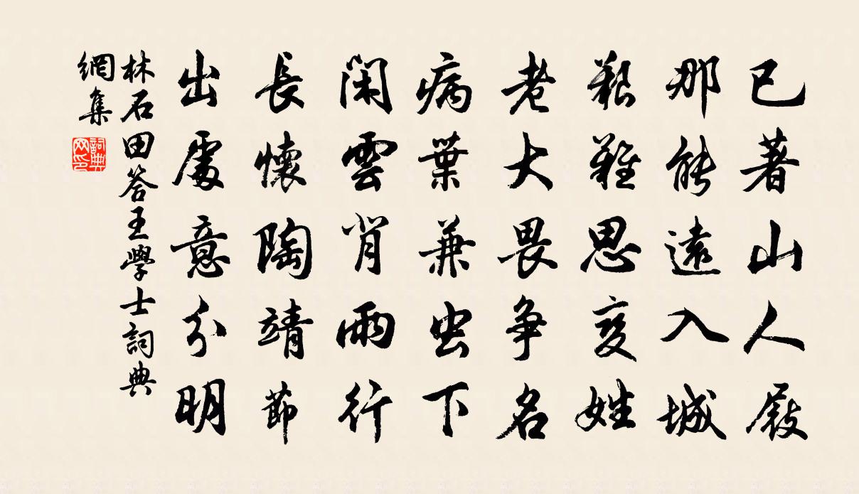 詩詞名句歷史字典書法欣賞書法字典國語詞典說文解字康熙字典古漢語字典標 題 作 者 詩 句 答王學士作者:林石田 朝代:宋代答王學士原文已著山人屐,那能遠入城。艱難思變姓,老大畏爭名。病葉兼蟲下,閒雲背雨行。長懷陶靖節,出處意分明。詩詞問答問:答王學士的作者是誰?答:林石田問:答王學士寫於哪個朝代?答:宋代林石田答王學士書法欣賞答王學士書法作品詩詞推薦念奴嬌(庚申生朝)姜特立〔宋代〕宦途巘險,問急流勇退,幾人聞早。自別修門今正是,一紀生朝還到。綠野風光,平泉草木,爭似梅山好。園林如孝宗明堂前朝獻景靈宮八首真宗〔宋代〕合宮之鄉,慶基無窮。祗率百辟,仰瞻睟容。鼓鍾斯和,黍稷期豈。靈其居歆,福祿來崇。贈杜郎中陳允平〔宋代〕草堂人遠只存詩,幾席臨風入詠思。文印幸傳同谷譜,祖燈猶照曲江碑。濡毫省闥春霖足,立馬君門夜漏遲。憔悴漫興胡仲弓〔宋代〕大笑出塵間,吟謝得暫閒。解衣臨水閣,倚杖看雲山。歸鳥聲如市,騎牛歌更蠻。明邊一點墨,元是野僧遠。清平樂王炎〔宋代〕呢喃燕語。共訴春歸去。春去從他留不住。落盡枝頭紅雨。老翁袖手優遊。閒愁不到眉頭。過了麥黃椹紫,歸期只挽翟伯壽二首吳芾〔宋代〕高情爽氣薄雲天,灑落真如晉七賢。筆下蟲魚元自得,胸中丘壑更依然。風流已足追千載,壽考胡為不百年。人物送公辟給事自青州致政歸吳中王珪〔唐代〕青瑣仙人解玉符,秋風一夜滿江湖。曾歌郢水非凡曲,示掃旄頭負壯圖。終日望群天欲盡,平生知我世應無。扁舟詠曉韋應物〔唐代〕軍中始吹角,城上河初落。深沉猶隱帷,晃朗先分閣。早夏寄元校書司空曙〔唐代〕獨游野徑送芳菲,高竹林居接翠微。綠岸草深蟲入遍,青叢花盡蝶來稀。珠荷薦果香寒簟,玉柄搖風滿夏衣。蓬蓽斤竹嶺張嵲〔宋代〕朧朧曉月淡,暠暠晨霜秋。棄馬沙金平,步過草地嶺。仰登上層雲,俯降入深井。回潭冷更清,嶺樹疏逾整。蹊荒大言權德輿〔唐代〕華嵩為佩河為帶,南交北朔跬步內。搏鵬作臘巨鰲鱠,伸舒軼出元氣外。又詠荔子曾幾〔宋代〕百年中半飽聞渠,名下親承果不虛。可愛風流元有種,自然富貴乃其餘。肯隨妃子紅塵驛,甘伴先生白鶴居。可惜嘉陵江過合州漢初縣下范成大〔宋代〕井徑東川縣,山河古合州。木根拏斷岸,急雨沸中流。關下嘉陵水,沙頭杜老舟。江花應好在,無計會江樓。偶成小酌招魯望不至,以詩為解,因次韻酬之皮日休〔唐代〕醉侶相邀愛早陽,小筵催辦不勝忙。沖深柳駐吳娃幰,倚短花排羯鼓床。金鳳欲為鶯引去,鈿蟬疑被蝶勾將。如何岩桂盛開感而有作吳芾〔宋代〕抱痾三月未能瘳,樂事都無只有愁。忽覺天香參鼻觀,頓令病客展眉頭。擬招賓佐同歡賞,奈怯壺觴且罷休。卻憶冷翠閣與秋岩同賦董嗣杲〔宋代〕笑攜琴冊上崑崙,分坐溪頭蘚石根。崖樹有霜飛老葉,野泉無雨落秋痕。幾番閒借樵人屐,何許追尋隱者門。多種華山張喬〔唐代〕青蒼河一隅,氣狀杳難圖。卓傑三峰出,高奇四岳無。力疑擎上界,勢獨壓中區。眾水東西走,群山遠近趨。天回句晏殊〔宋代〕澹澹梳妝薄薄文。廣支蘇才翁輓詞三首梅堯臣〔宋代〕自昔愛春物,樽深眼底紅。日斜花在落,身醉客西東。歿嘆千年隔,生悲百事空。君嘗知此理,不悞學陶公。城北王安石〔宋代〕青青千里亂春袍,宿兩催紅出小桃。回首北城無限思,日酣川淨野雲高。名句推薦雪虐風饕愈凜然,花中氣節最高堅。陸游《落梅》 大風起兮雲飛揚。威加海內兮歸故鄉。安得猛士兮守四方!劉邦《大風歌》 大天而思之,孰與物畜而制之!從天而頌之,孰與制天命而用之荀子《荀子·天論》 君子之心事,天青日白,不可使人不知洪應明《菜根譚·概論》 弓背霞明劍照霜,秋風走馬出鹹陽。令狐楚《少年行四首·其三》 凍臉有痕皆是血,酸心無恨亦成灰。曹雪芹《詠紅梅花得“梅”字》 老圃好栽培,菊花五月開。顧太清《菩薩蠻·端午日詠盆中菊》 茅檐低小,溪上青青草。辛棄疾《清平樂·村居》 半卷紅旗臨易水,霜重鼓寒聲不起。李賀《雁門太守行》 一聲何滿子,雙淚落君前。張祜《宮詞·故國三千里》