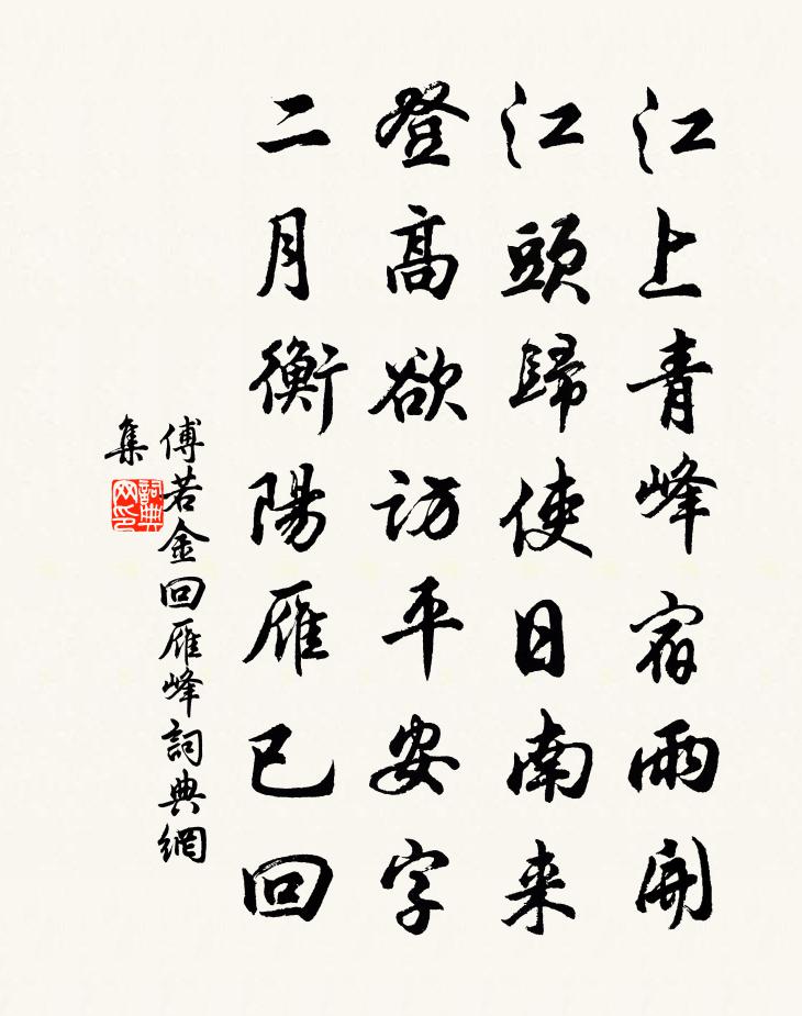 詩詞名句歷史字典書法欣賞書法字典國語詞典說文解字康熙字典古漢語字典標 題 作 者 詩 句 回雁峰作者:傅若金 朝代:元代回雁峰原文江上青峰宿雨開,江頭歸使日南來。登高欲訪平安字,二月衡陽雁已回。詩詞問答問:回雁峰的作者是誰?答:傅若金問:回雁峰寫於哪個朝代?答:元代問:回雁峰是什麼體裁?答:七絕傅若金回雁峰書法欣賞回雁峰書法作品注釋元詩別裁集詩詞推薦和遠老韻吳芾〔宋代〕野性平時酷愛山,年來何幸得休官。情知軒冕生無益,身在林泉死亦安。已免出門頻應接,尚貪散策縱游觀。得師南山寺舒璘〔宋代〕山谷幽深鎖梵宮,千章灌木郁蘢蔥。香浮古篆半檐霧,茶潄清泉兩腋風。鶴伴老僧歸夕照,山留行客駐霜楓。前朝中宗降誕日長寧公主滿月侍宴應制李嶠〔唐代〕神龍見像日,仙鳳養雛年。大火乘天正,明珠對月圓。作新金篋里,歌奏玉筐前。今日宜孫慶,還參祝壽篇。野外王令〔宋代〕綠野愛平寬,偶來或永嘆。村兒駭車馬,野犬吠衣冠。亂草無閒地,斜陽有去鞍。良田半蹊徑,始信直行難。賀新郎(鄉士以狂得罪,賦此餞行)蔣捷〔宋代〕甚矣君狂矣。想胸中、些兒磊塊,酒澆不去。據我看來何所似,一似韓家五鬼。又一似、楊家風子。怪鳥啾啾鳴未效王仲至少監詠姚花用其韻四首黃庭堅〔宋代〕仙衣襞積駕黃鵠,草木無光一笑開。人間風日不可奈,故待成陰葉下來。憶秦娥(七夕)袁去華〔宋代〕月照席。不知天上今何夕。今何夕。鵲橋初就,玉繩低側。暫時不見猶尋覓。那堪更作經年隔。經年隔。許多良夜石屋徐集孫〔宋代〕路僻鳥關關,行吟膛字刪。偶來游石屋,卻喜見香山。閣峭寒雲護,岩深野水閒。坡仙留墨在,姓字有無間。鷓鴣天元好問〔金代〕內府清虛息萬緣。逍遙真是地行仙。從他玉帶金魚貴,聽我綸巾羽扇偏。傾美醞,祝長年。休辭瀲灩十分圓。來年虎跡韋莊〔唐代〕白額頻頻夜到門,水邊蹤跡漸成群。我今避世棲岩穴,岩穴如何又見君。滕王亭子杜甫〔唐代〕寂寞春山路,君王不復行。古牆猶竹色,虛閣自松聲。鳥雀荒村暮,雲霞過客情。尚思歌吹入,千騎把霓旌。隆蔭堂黃公度〔宋代〕意得壺觴外,心清杖屨間。簿書休吏早,花鳥向人閒。楊真人籙中像鮑溶〔唐代〕畫中留得清虛質,人世難逢白鶴身。應見茅盈哀老弟,為持金籙救生人。冬至節假賦愁陰喜霽黃彥平〔宋代〕愛日明朝至,寒雲此夕同。預知鴉啄雪,先驗鳥呼風。鄉國追隨外,年華感嘆中。清愁將濁酒。斟酌並成空。梅龍黃庚〔宋代〕孤根蟠屈浸冰壺,蟄裹陽和發朽枯。雪樹鱗封寒水玉,月梢頷吐夜明珠。暗香吹冷龍涎濕,疏影涵清蛻骨癯。安得扶風歌劉琨〔魏晉〕南山石嵬嵬。松柏何離離。上枝拂青雲。中心十數圍。洛陽發中梁。松樹竊自悲。斧鋸截是松。松樹東西摧。特作戲書旅況方回〔宋代〕垢癢頻搔虱欠烘,泥行草宿嘆匆匆。欲紉衣苦無針線,每煮羹難得菜蔥。險惡固宜防賊盜,愚頑莫可恕奴僮。閒人鵲橋仙(春院)毛滂〔宋代〕紅摧綠挫,鶯愁蝶怨,滿院落花風緊。醉鄉好夢恰瞢騰,又冷落、一成吹醒。柔紅不耐,暗香猶好,覷著翻成不忍贈蔡俊民挾雷法妝眼科北行陳杰〔宋代〕乖龍捲雨焦土山,妖蟆蝕晴長夜漫。安得霹靂鞭龍起,取光還天磔蟆死。寥落風霆道術空,坐看短世入盲聾。南人與李公擇道中見兩客布衣班荊而坐對戲弈秋因黃庭堅〔宋代〕兩客班荊覆局圖,看人車馬溷泥塗。文昌八座鄰樞極,天上歸來愧不如。名句推薦相尋夢裡路,飛雨落花中。晏幾道《臨江仙·鬥草階前初見》 生前心已碎,死後性空靈。曹雪芹《紅樓夢·第五回》 昔聞洞庭水,今上岳陽樓杜甫《登岳陽樓》 參橫斗轉欲三更,苦雨終風也解晴。蘇軾《六月二十日夜渡海》 勝敗兵家事不期,包羞忍恥是男兒。杜牧《題烏江亭》 愁里高歌梁父吟,猶如金玉戛商音。鄭思肖《二礪》 孔子大聖,不免武叔之毀;子路至賢,猶有伯寮之訴。范曄《後漢書·列傳·列女傳》 衙齋臥聽蕭蕭竹,疑是民間疾苦聲。鄭燮《濰縣署中畫竹呈年伯包大中丞括 / 墨竹圖題詩》 柳岸風來影漸疏,使君家似野人居。杜牧《齊安郡晚秋》 徒善不足以為政,徒法不能以自行。孟子《孟子·離婁章句上·第一節》