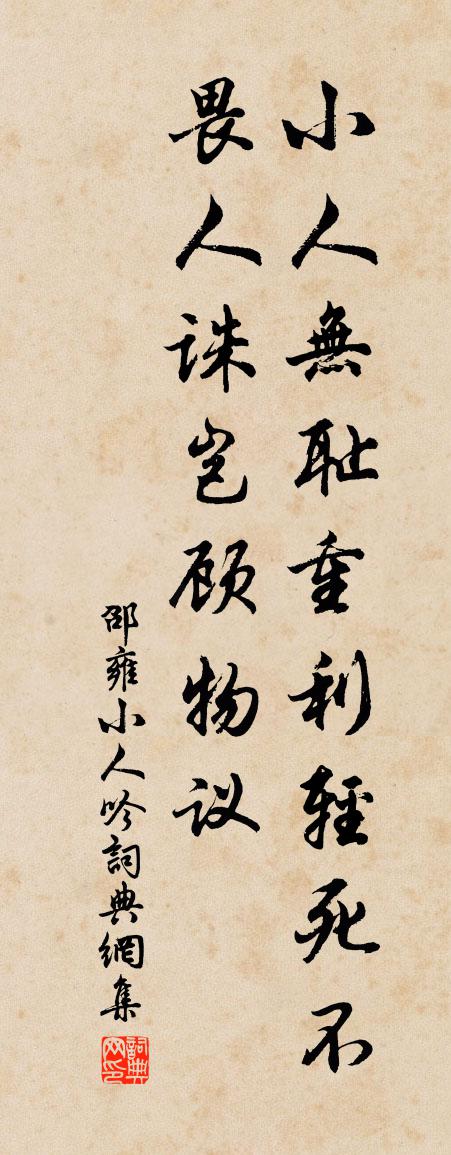 詩詞名句歷史字典書法欣賞書法字典國語詞典說文解字康熙字典古漢語字典標 題 作 者 詩 句 小人吟作者:邵雍 朝代:宋代小人吟原文小人無恥,重利輕死。不畏人誅,豈顧物議。詩詞問答問:小人吟的作者是誰?答:邵雍問:小人吟寫於哪個朝代?答:宋代邵雍小人吟書法欣賞小人吟書法作品詩詞推薦示慧開禪師頌二首吳潛〔宋代〕黑山心歷歷,金殿口巴巴。不因漁父引,怎得見波查。與鄭少融、趙養民二使者訪古訾家洲,歸憩松范成大〔宋代〕飄飄竹雨潤輕裘,嫋嫋松風系小舟。安得從容興廢手,越人重上訾家洲。草堂成即事二首喻良能〔宋代〕燕雀桑麻五畝勻,香爐峰下磬湖濱。青衫不礙兩居士,白髮真成六老人。子美浣花元不惡,淵明栗里總宜貧。作詩和仁仲至荊門胡寅〔宋代〕虞帝當年辟四門,三苗那更蠢 * 。茫茫舊楚祗芳草,處處朱樓空斷垣。不原耦耕招素隱,要看良耜接深村。韓公五月二十八日書詩人壁黃宗羲〔清代〕水晶宮殿玉雕闌,絲竹叢中墨未乾。卻道詩情多富貴,故教村落寫荒寒。王主簿以湘潭檢旱詩卷為示用其廣惠寺蠲放韻趙蕃〔宋代〕隴畝循行不憚難,是知漢詔本從寬。講求利病非無補,老矣病能策治安。送族侄赴任(一作之郡)錢起〔唐代〕林下不成興,仲容微祿牽。客程千里遠,別念一帆懸。欲嘆卑棲去,其如勝趣偏。雲山深郡郭,花木淨潮田。坐嘯送楊秀才游蜀張祜〔唐代〕鄂渚逢遊客,瞿塘上去船。峽深明月夜,江靜碧雲天。舊俗巴渝舞,新聲蜀國弦。不堪揮慘恨,一涕自潸然。送雲卿知衛州司馬光〔宋代〕汗簡成新令,褰帷刺劇州。韋平家法在,邵杜治聲優。野竹交淇水,秋瓜蔓帝丘。三年歸奉計,肯顧石渠游。次韻和李舍人憶北園尋春之作楊億〔宋代〕謝公別墅枕城闉,蕭灑都無紫陌塵。五色絲論貪草詔,一園桃李阻尋春。早朝禁漏猶傳點,下直殘陽已滿身。除是蠶婦辭陳普〔宋代〕東鄰採桑婦,西鄰養蠶女,年年役役為蠶苦。桐花如雪麥如雲,鳴鳩醉椹 * 雨。踏踏登竹梯,山煙鎖春樹。不管嘉禾百詠符姥瑞竹張堯同〔宋代〕一幅霜縑外,青青出自然。天機何敢議,珍重白衣仙。崇道叔慶七十葉茵〔宋代〕寄意南豐一瓣香,願公耆艾熾而昌。歷經七甲鬢浮綠,帶錫萬釘眉映黃。疑是函關逢老子,巋然魯國有靈光。陰功試越裳貢白雉王若岩〔唐代〕素翟宛昭彰,遙遙自越裳。冰晴朝映日,玉羽夜含霜。歲月三年遠,山川九澤長。來從碧海路,入見白雲鄉。作瑞歲晚書事十首劉克莊〔宋代〕鬱壘鍾馗尚改更,青雲變幻幾公卿。人間止有章泉叟,撲斷衡山了一生。春晴曾幾〔宋代〕莫春已辦曾點服,急雨又墊林宗巾。一晴政為吾輩設,速載家釀羞廚珍。戲李相如攜婦還金鄉晃沖之〔宋代〕舍人固多奇,奉璧登章台。君王擊缶罷,將軍負荊來。長卿束髮時,亦復悅名字。一從臨邛游,心跡了不似。茂陵獅子岩繆烈〔宋代〕幽岩蕭颯商飈起,一天灝氣涼如水。金井梧飛蘭谷芳,長江浪冷蓴魚美。雁字半側銀鉤欹,雲光淨掃光陸離。桂花別張景嵩梅堯臣〔宋代〕我雖識君晚,君能知我心。我心昭亭水,見底無尺尋。照之不為隱,測之不為深。魚蝦既混混,藻荇亦侵侵。終當戲題睡屏趙必象〔宋代〕一別相如直至今,床頭綠綺暗生塵。當年自是文君誤,未必琴心解挑人。名句推薦和氣吹綠野,梅雨灑芳田。李世民《詠雨》 採桑秦氏女,織錦竇家妻。薛道衡《昔昔鹽》 羞日遮羅袖,愁春懶起妝。魚玄機《贈鄰女 / 寄李億員外》 而浮生若夢,為歡幾何?李白《春夜宴桃李園序 / 春夜宴從弟桃花園序》 王粲登臨寥落際。雁飛不斷天連水。王庭筠《鳳棲梧·衰柳疏疏苔滿地》 一種青山秋草里,路人唯拜漢文陵許渾《途經秦始皇墓》 江湖多風波,舟楫恐失墜。杜甫《夢李白二首·其二》 勿自暴,勿自棄。聖與賢,可馴致。李毓秀《弟子規·餘力學文》 廢一善,則眾善衰。賞一惡,則眾惡歸。黃石公《三略·下略》 為政不難,不得罪於巨室。孟子《孟子·離婁章句上·第六節》