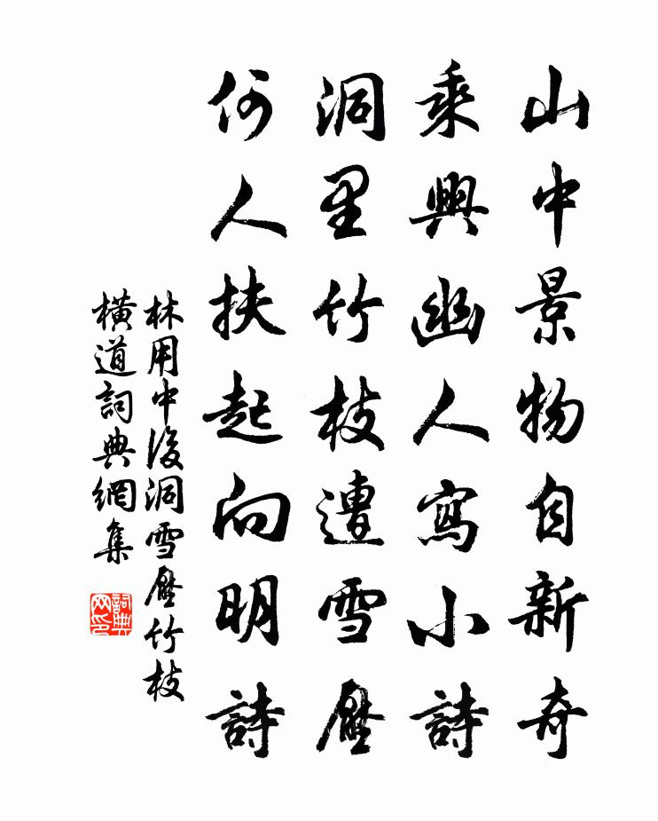 詩詞名句歷史字典書法欣賞書法字典國語詞典說文解字康熙字典古漢語字典標 題 作 者 詩 句 後洞雪壓竹枝橫道作者:林用中 朝代:宋代後洞雪壓竹枝橫道原文山中景物自新奇,乘興幽人寫小詩。洞裡竹枝遭雪壓,何人扶起向明詩。詩詞問答問:後洞雪壓竹枝橫道的作者是誰?答:林用中問:後洞雪壓竹枝橫道寫於哪個朝代?答:宋代林用中後洞雪壓竹枝橫道書法欣賞後洞雪壓竹枝橫道書法作品詩詞推薦贈抱麻劉舍人貫休〔唐代〕郡政今良吏,門風古縉紳。萬年唐社稷,一個哭麻人。憤烈身先死,敷揚氣益貞。天乎資大寶,泰矣見忠臣。得罪題靈山寺張喬〔唐代〕樹涼清島寺,虛閣敞禪扉。四面閒雲入,中流獨鳥歸。湖平幽徑近,船泊夜燈微。一宿秋風裡,煙波隔搗衣。送李節推挈內歸寧池陽並李察推往南康軍嫁妹梅堯臣〔宋代〕江上雙畫舸,風帆或先後。晚共泊蘆洲,欣同幕中友。一過長風沙,一住貴池口。當時驄馬客,今是憑熊守。每憐再次韻寄林郎中陳造〔宋代〕林侯理窟元無底,如拜宣尼親闕里。經笥沈醇文筆古,俯視時流皆日耳。我生憂虞占多半,鱉跛蠖屈今已慣。林侯題羅年能六友堂魏了翁〔宋代〕羅氏堂中六友圖,要求紙尾數行書。若於此味真知得,著甚言詞乞與渠。贊呂先生釋法薰〔宋代〕為儒儒不達,學仙仙非真。黃龍門下過,秋蚊蛟鐵釘。回先生,回先生。岳陽人不識,老樹卻成精。偈傾一百三十三首釋法薰〔宋代〕從上佛祖逆風塵,後代兒孫日中迷路。卻憶禾山老古錐,逢人貪偏道解打鼓。冢上答太宗慕容垂〔唐代〕我昔勝君昔,君今勝我今。榮華各異代,何用苦追尋。砥柱四首范祖禹〔宋代〕巨靈贔屓兩山開,東放黃河萬里來。地軸橫斜爭斡轉,天維欹側恐傾摧。八月十二日夜偕客賞木犀八首陳造〔宋代〕酒邊先起未須扶,猶聽槌床擊唾壺。風月撩人成不寢,隔牆卻擬應歌呼。過桃枝嶺陳藻〔宋代〕兒童嬉戲向比鄰,長見桃枝出郭人。七十五翁方過嶺,回頭舊事總成塵。前漢門平津侯周曇〔唐代〕儒素逢時得自媒,忽從徒步列公台。北辰如不延吾輩,東閣何由逐汝開。村居即事林尚仁〔宋代〕外事少曾聞,深居似隱君。溪明花照影,風細水行文。蠶室寒初閉,蜂房早已分。偶因尋藥去,踏破一村雲。水居王鎡〔宋代〕飛鷗貼水水連天,一半青山一半煙。日暮潮回漁父醉,不知船閣淺沙邊。菩薩蠻令(長安懷古)康與之〔宋代〕秦時宮殿鹹陽里。千門萬戶連雲起。復道互西東。不禁三月風。漢唐乘王氣。萬歲千秋計。畢竟是荒丘。荊榛滿地送黃伯厚入廣鄭清之〔宋代〕五行在天地,惟水明且清。如何南中泉,乃獨以貪名。水號黑與弱,淖汩稱濁涇。彼皆有其實,所以得此聲。山川上蘇端明鄭俠〔宋代〕聞說天南受賜深,傳方施藥每揮金。看天風格樽前熊,妙國胸懷枕上心。草木亦蒙銓品力,山川難載頌歌音。如今秋晚陸游〔宋代〕身世呻吟裹,園廬寂寞中。家貧憂酒券,才盡畏詩筒。陂水瀦猶滿,山苗獲欲空。兒孫更力作,勿媿禹遣風。和慎思秋日同文館詩蔡肇〔宋代〕清月看初滿,黃花吐未齊。小山思隱桂,大谷憶佳梨。節物信可美,詩騷懶自題。長年諳獨宿,聽雨閉秋閨。八桂堂呈葉潛仲劉克莊〔宋代〕字子初度日,畏客如避仇。朱門禁入謁,青山招出遊。置醴泉石間,涼意生觥籌。風檻絳華馥,冰盆丹實浮。起誦名句推薦四月十七,正是去年今日,別君時。韋莊《女冠子·四月十七》 為學不外靜敬二字,教人先去驕惰二字。王永彬《圍爐夜話·第一四八則》 曉月暫飛高樹里,秋河隔在數峰西韓翃《宿石邑山中》 江流天地外,山色有無中。王維《漢江臨泛 / 漢江臨眺》 非澹薄無以明德,非寧靜無以致遠,非寬大無以兼覆,非慈厚無以懷眾,非平正無以制斷。劉安及其門客《淮南子·主術訓》 朔風如解意,容易莫摧殘。崔道融《梅花》 正見空江明月來,雲水蒼茫失江路。歐陽修《晚泊岳陽》 隔岸荒雲遠斷,繞磯小樹微明。歸莊《錦堂春·半壁橫江矗起》 路逢俠客須呈劍,不是才人莫獻詩。佚名《增廣賢文·上集》 人間更有風濤險,翻說黃河是畏途。宋琬《渡黃河》