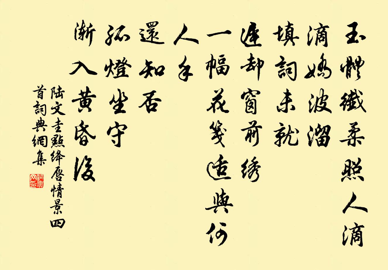 詩詞名句歷史字典書法欣賞書法字典國語詞典說文解字康熙字典古漢語字典標 題 作 者 詩 句 點絳唇 情景四首作者:陸文圭 朝代:元代點絳唇 情景四首原文玉體纖柔,照人滴滴嬌波溜。填詞未就。遲卻窗前繡。一幅花箋,適與何人手。還知否。孤燈坐守。漸入黃昏後。詩詞問答問:點絳唇 情景四首的作者是誰?答:陸文圭問:點絳唇 情景四首寫於哪個朝代?答:元代問:點絳唇 情景四首是什麼體裁?答:詞陸文圭點絳唇 情景四首書法欣賞點絳唇 情景四首書法作品詩詞推薦九懷春遊高似孫〔宋代〕君之來兮鞭潮,令冰夷兮毋驕。撫余車兮安驅,海難填兮魂銷。龍翼輈兮既東,旌翠昏兮生埃。蛟抗刃兮婆赤,咽借榻趙處澹〔宋代〕簾卷薰風透骨香,月移花影上迴廊。客游不作安居計,漫借高齋一榻涼。陪元允大受游天寧寺三首郭印〔宋代〕拉客游蕭寺,徘徊及暮還。自非歸沐假,那得片時閒。閱世真成夢,為官只強顏。老僧應笑我,何日遠塵寰。答章伯和問疾王諶〔宋代〕伏枕屢經旬,醫庸藥不靈。自從春意動,才覺病魂醒。露洗桃心赤,風揩柳眼青。勞君相憶夢,每夜到岩扃。舉季申信道自光化復入鄧書事四首陳與義〔宋代〕城西望城南,十日九相隔。何如三枝杖,共踏江上石。門前流水過,春意滿渠碧。遙知千頃江,如今好顏色。再和十首蘇轍〔宋代〕天為多才故欲禁,府門摧落漲江深。鼎新翠壁排精鐵,湧出飛樓直百金。和林處士梅詩八首劉學箕〔宋代〕年年江上見梅時,憶著西湖處士詩。香暗影疏清到骨,水邊籬下雪融枝。可知寒谷先回律,會是東皇肯與私。竹逕酬李司兵直夜見寄皇甫冉〔唐代〕江城聞鼓角,旅宿復何如。寒月此宵半,春風舊歲餘。徒雲資薄祿,未必勝閒居。見欲扁舟去,誰能畏簡書。應天長顧夐〔唐代〕瑟瑟羅裙金線縷,輕透鵝黃香畫袴。垂交帶,盤鸚鵡,裊裊翠翹移玉步。背人勻檀注,慢轉嬌波偷覷。斂黛春情暗滿庭芳王丹桂〔元代〕四業三彭,七情六慾,終宵永日教唆。輸他圈*,難出黑風波。起盡慳貪嫉妒,生機狡、無限張羅。堪嗟處,從今和趙生二首胡寅〔宋代〕遍游南北與西東,欲訪人間國士風。處世甚疎皆笑我,宅心無累獨奇公。詩才自愧非三上,酒聖相從又一中。芍藥橫山堂三章葛立方〔宋代〕陽羨之居兮宅淼茫,辛夷閨兮薜荔牆。建芳馨兮廡門,爛昭昭兮未央。橫山老人兮獨處廓,十七地兮三一屋。龍馳眼病寄同官王建〔唐代〕天寒眼痛少心情,隔霧看人夜裡行。年少往來常不住,牆西凍地馬蹄聲。水龍吟 題簫史圖 孫氏書鈔趙孟頫〔元代〕倚天簾百尺高台簾,雕簾畫棟簾撐雲表。簾夜靜無塵,秋魂萬里,月明如掃。誰憑欄乾,玉簫聲起,乘鸞人到。信失調名佚名〔宋代〕語燕飛來繞畫梁。和立齋荔子樓韻王柏〔宋代〕我久抱離索,加子憂患薰。血氣日以耗,話別難為情。之子行邁邁,徵車從仁兄。閩嶺在何處,目斷遮行雲。素□酬伯氏再用前韻王洋〔宋代〕自方國小難回袖,不畏秦強欲奏盆。遙想調琴堂上日,仁風曾使滿千門。極相思佚名〔宋代〕一番雨過橫塘。和王適寒夜讀書蘇轍〔宋代〕久從市井役,百事廢不理。感君讀書篇,惜此寒夜晷。殷勤附燈燭,黽勉就圖史。逡巡揖虞夏,汗漫馳劉李。斯文送劉寰北歸劉商〔唐代〕南巢登望縣城孤,半是青山半是湖。知爾素多山水興,此回歸去更來無。名句推薦勞苦之事則爭先,饒樂之事則能讓。荀子《荀子·修身》 時見幽人獨往來,縹緲孤鴻影。蘇軾《卜運算元·黃州定慧院寓居作》 朝真暮偽何人辨,古往今來底事無。白居易《放言五首·其一》 百囀無人能解,因風飛過薔薇。黃庭堅《清平樂·春歸何處》 不如隨分尊前醉,莫負東籬菊蕊黃。李清照《鷓鴣天·寒日蕭蕭上瑣窗》 輕輕飛動,把賣花人搧過橋東王和卿《醉中天·詠大蝴蝶》 得言不可以不察。數傳而白為黑,黑為白。呂不韋《呂氏春秋·論·慎行論》 時有滿虛,事有利害,物有生死。韓非及後人《韓非子·觀行》 上無威,下生亂。來俊臣《羅織經·治下卷第三》 野店垂楊步,荒祠苦竹叢。范成大《寒食郊行書事》
