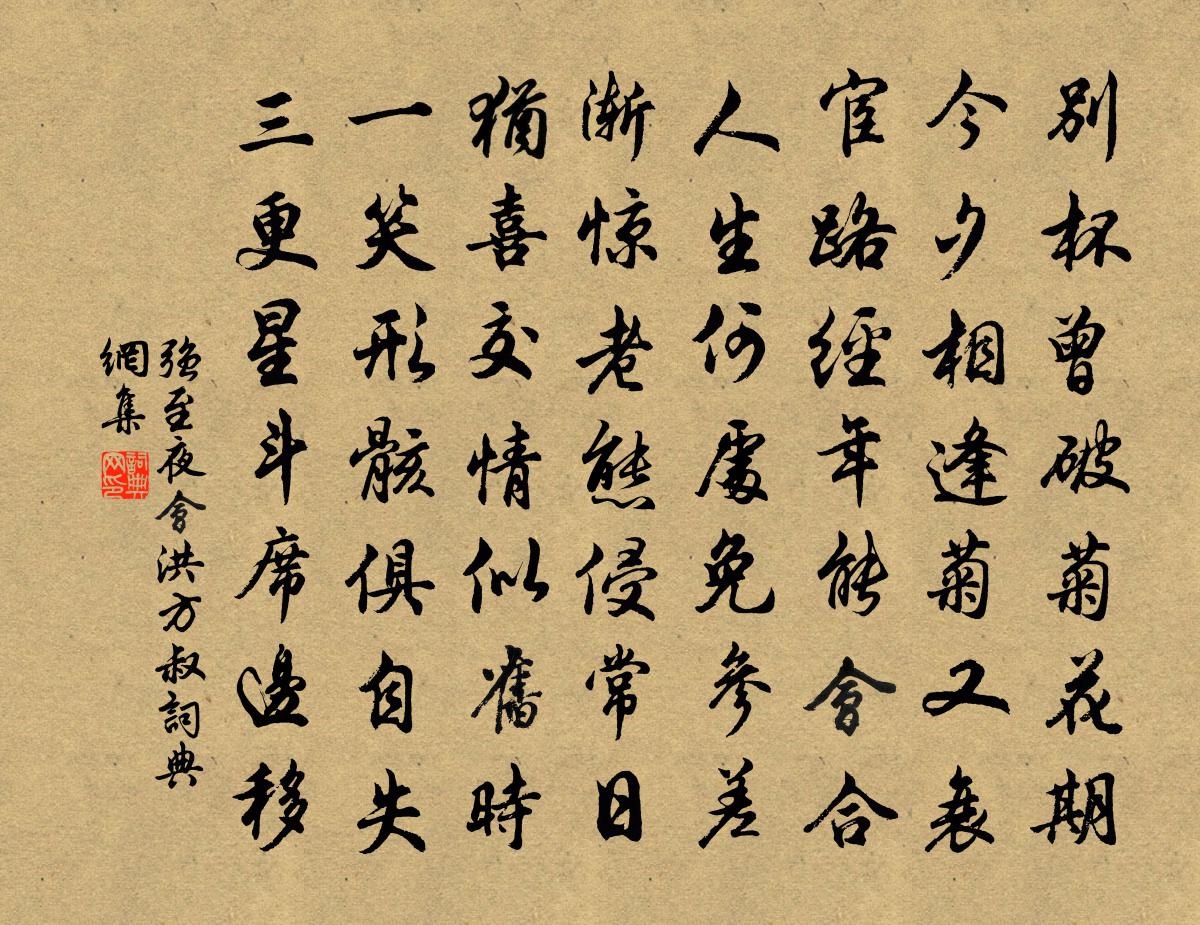 詩詞名句歷史字典書法欣賞書法字典國語詞典說文解字康熙字典古漢語字典標 題 作 者 詩 句 夜會洪方叔作者:強至 朝代:宋代夜會洪方叔原文別杯曾破菊花期,今夕相逢菊又衰。宦路經年能會合,人生何處免參差。漸驚老態侵常日,猶喜交情似舊時。一笑形骸俱自失,三更星斗席邊移。詩詞問答問:夜會洪方叔的作者是誰?答:強至問:夜會洪方叔寫於哪個朝代?答:宋代強至夜會洪方叔書法欣賞夜會洪方叔書法作品詩詞推薦文宣王及其弟子贊宋高宗〔宋代〕夫孝要道,周訓群生。以綱百行,以通神明。因子侍師,答問成經。事親之實,代為儀刑。董邦達西湖圖乾隆〔清代〕昔傳西湖比西子,但聞其名知其美,夷光千古以上人,豈有真容遺後世。未見顏色貴耳食。浪以湖山相比擬,湖山春日秦觀〔宋代〕一夕輕雷落萬絲,霽光浮瓦碧參差。有情芍藥含春淚,無力薔薇臥曉枝。始皇錢惟演〔宋代〕天極周環百二都,六王鍾鋸接劉蘇。金椎漫築甘泉道,匕首還隨督亢圖。已覺副車驚博浪,更攜連弩望蓬壺。不將射覆巾子佚名〔唐代〕近來好裹束,各自競尖新。秤無三五兩,因何號一斤。沁園春(壽徐知院)李敬則〔宋代〕南渡盛時,壬寅之秋,生此偉人。是皇家柱石,端平君子,吾儒宗主,意一先生。自起丹山,晉登紫府,天下欣然日出東南隅行陸機〔魏晉〕扶桑升朝暉。照此高台端。高台多妖麗。濬房出清顏。淑貌耀皎日。惠心清且閒。美目揚玉澤。蛾眉象翠翰。鮮膚送謝庭玉二首王炎〔宋代〕話舊情非淺,遄歸意謂何。杜門元簡出,命駕特相過。黃鵠仙翁逝,青衿子姓多。屬渠勤肄業,歲月易蹉跎。潛鶴鼓馬之純〔宋代〕板木為腔冒以皮,其中寧有鶴來棲。如何音響聞西洛,未必源流自會稽。既被兵人都擊破,卻雲禽鳥不鳴嘶。分明自方廣過高台張栻〔宋代〕兩寺清聞磬,群峰石作城。風生雲影亂,猿嘯月華明。香火遠公社,江湖鷗鳥盟。是中俱不著,俯仰見平生。點絳唇(雪香梨)王十朋〔宋代〕春色融融,東風吹散花千樹。雪香飄處。寒食江村暮。左掖看花,多少詞人賦。花無語。一枝春雨。惟有香山句。省試湘靈鼓瑟錢起〔唐代〕善鼓雲和瑟,常聞帝子靈。馮夷空自舞,楚客不堪聽。苦調淒金石,清音入杳冥。蒼梧來怨慕,白芷動芳馨。流水雙蝶陸游〔宋代〕庭草何離離,清晨露猶濕。草頭兩黃蝶,為我小佇立。秋光亦已晚,行見霜霰集。方春不盡狂,汝悔尚何及!吾生送孔秀才遊河北歐陽修〔宋代〕吾始未識子,但聞楊公賢。及子來叩門,手持贈子篇。賢愚視所與,不待交子言。又文諧律呂,子行潔琅玕。行矣千頃山吳珩〔宋代〕松檜陰中六月清,異花靈草不知名。路從瓊液山前過,人在水晶宮上行。千尺翠嵐分月色,一軒寒籟動潮聲。登臨采蘩佚名〔先秦〕於以采蘩?於沼於沚。於以用之?公侯之事。於以采蘩?於澗之中。於以用之?公侯之宮。被之僮僮,夙夜在公。和楊明府早秋遊法華寺皎然〔唐代〕釋事出縣閤,初聞茲山靈。寺扉隱天色,影剎遙丁丁。碧峰委合沓,香蔓垂蓂苓。清景為公有,放曠雲邊亭。秋賞戲瞻相薛能〔唐代〕失意蹉跎到舊遊,見吹楊柳便遮羞。瞻相趙女休相拽,不及人前詐擺頭。尉遲將軍劉威〔唐代〕天仗擁門希授鉞,重臣入夢豈安金。江河定後威風在,社稷危來寄託深。扶病暫將弓試力,感恩重與劍論心。明妃鉅鹿贈李少府高適〔唐代〕李侯雖薄宦,時譽何籍籍。駿馬常借人,黃金每留客。投壺華館靜,縱酒涼風夕。即此遇神仙,吾欣知損益。名句推薦天地玄黃,宇宙洪荒。周興嗣《千字文·全文》 可憐白骨攢孤冢,盡為將軍覓戰功。張蠙《吊萬人冢》 上謀臣以勢,勢不濟者以術。來俊臣《羅織經·謀劃卷第九》 夜來小雨新霽,雙燕舞風斜。万俟詠《訴衷情·送春》 萬里辭家事鼓鼙,金陵驛路楚雲西。劉長卿《送李判官之潤州行營》 方而不割,廉而不劌,直而不肆,光而不耀。老子《老子·德經·第五十八章》 借得山東煙水寨,來買鳳城春色施耐庵《念奴嬌·天南地北》 惡人自有惡人磨。施耐庵《水滸傳·第三十回》 為學日益,為道日損。損之又損,以至於無為。老子《老子·德經·第四十八章》 中山孺子倚新妝,鄭女燕姬獨擅場。李夢陽《汴京元夕》