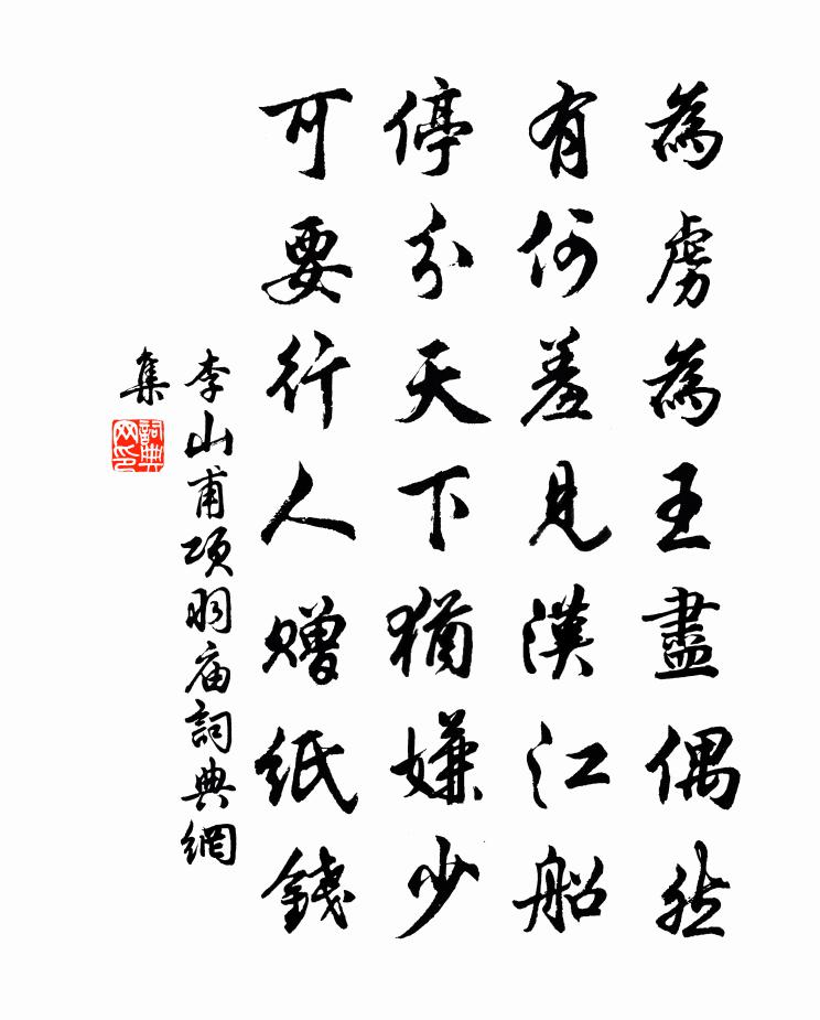 詩詞名句歷史字典書法欣賞書法字典國語詞典說文解字康熙字典古漢語字典標 題 作 者 詩 句 項羽廟作者:李山甫 朝代:唐代項羽廟原文為虜為王盡偶然,有何羞見漢江船。停分天下猶嫌少,可要行人贈紙錢。詩詞問答問:項羽廟的作者是誰?答:李山甫問:項羽廟寫於哪個朝代?答:唐代問:項羽廟是什麼體裁?答:七絕李山甫項羽廟書法欣賞項羽廟書法作品注釋全唐詩:卷643-48詩詞推薦水閣納涼王鎡〔宋代〕雲碧紗廚水閣中,鴛鴦花冷枕玲瓏。描金團扇無人用,一陣荷香一陣風。鳳銜杯晏殊〔宋代〕柳條花纇惱青春。更那堪、飛絮紛紛。一曲細清脆、倚朱唇。斟綠酒、掩紅巾。追往事,惜芳唇。暫時間、留住行幽居吟金朋說〔宋代〕種竹為垣護草堂,面山臨水納幽芳。從容泉石無牽絆,不似從前志廟廊。寄吳元初道錄仇遠〔宋代〕桃花兩度見青春,夢裡玄都隔幾塵。升斗自憐為客久,舟車每惜寄書頻。君如當日陶弘景,我亦他時賀季真。東望偈十六首釋行瑛〔宋代〕朔風如刀,痛利人骨。千山萬山,雪映寒日。心知春氣來,目睹梅花發。遊子南方歸不歸,曉堂閒卻龜毛拂。歸故山路逢鄰居隱者錢起〔唐代〕握手雲棲路,潸然恨幾重。誰知綠林盜,長占彩霞峰。心死池塘草,聲悲石徑松。無因芳杜月,琴酒更相逢。宿灃曲僧舍溫庭筠〔唐代〕東郊和氣新,芳靄遠如塵。客舍停疲馬,僧牆畫故人。沃田桑景晚,平野菜花春。更想嚴家瀨,微風盪白蘋。小飛來亭二首楊長孺〔宋代〕陰森古木石心栽,清澈寒溪鏡面開。鬥起孤峰三百尺,從今喚作小飛來。次韻史才孺詠雪四首郭印〔宋代〕怪得天飛雪,寒成曉不同。練光鋪迥野,玉屑下長空。片片梅花雨,團團柳絮風。人間呈瑞應,還喜兆年豐。君子吟邵雍〔宋代〕君子與義,小人與利。與義日興,與利日廢。君子尚德,小人尚力。尚德樹恩,尚力樹敵。君子作福,小人作威。木蘭花慢 陪安參政宴吳山盛氏樓張野〔元代〕愛吳山佳處,凝望際,眼增明。正簾卷江濤,屏開罨畫,境接蓬瀛。中朝相君寬厚,領太平、歌吹宴簪纓。巧囀雛四紋四時楊冠卿〔宋代〕輕風透幕羅衾薄,滿萼嬌紅綴小桃。明月對愁縈錦字,斷弦空暗紫檀槽。次韻不浮弟自金陵相過高斯得〔宋代〕老夫睡眼方昏花,夢中忽聞歌隸華。暮春逢此晴雨好,足慰飄零少陵老。知君重踏東華塵,先訪雪堂老師兄。大篇隱者居周文璞〔宋代〕密竹緣坡便當籬,野泉入戶自成池。床頭一卷 * 易,更有寒山拾得詩。春寒楊萬里〔宋代〕陣陣風寒樹樹斜,不容老子出檐牙。繡簾半卷門偏啟,深倚胡床遠看花。百花台曾鞏〔宋代〕煙波與客同樽酒,風月全家上采舟。莫問台前花遠近,試看何以武陵游。滕王閣釋晦機〔宋代〕檻外長江去不回,檻前楊柳後人栽。當時唯有西山在,曾見滕王歌舞來。江氏園呂希純〔宋代〕北渚南津路不遙,嗚騶喜過定川橋。竹間水榭涵虛碧,林外山堂對泬漻。地占上游真{左王右爽}塏。門通禪苑離聽雨沈說〔宋代〕耳根聽不歇,滴滴冷於秋。疑是山翁醉,岩前枕瀑流。素馨花鄭域〔宋代〕妙香真色得之天,羞御鉛華學女妍。只向溫柔鄉里活,怕寒不許上林傳。名句推薦知章騎馬似乘船,眼花落井水底眠杜甫《飲中八仙歌》 蘭陵美酒鬱金香,玉碗盛來琥珀光。李白《客中行 / 客中作》 謾道愁須殢酒,酒未醒、愁已先回秦觀《滿庭芳·碧水驚秋》 含愁獨倚閨幃,玉爐煙斷香微。毛熙震《清平樂·春光欲暮》 山中無甲子,寒盡不知年。吳承恩《西遊記·第一回》 採蓮時,小娘紅粉對寒浪。溫庭筠《荷葉杯·鏡水夜來秋月》 憑高遠望,見家鄉、只在白雲深處。王瀾《念奴嬌·避地溢江書於新亭》 三代之得天下也以仁,其失天下也以不仁。孟子《孟子·離婁章句上·第三節》 一年春又盡,倚杖對斜暉。左緯《春晚》 九華山路雲遮寺,清弋江村柳拂橋。杜牧《宣州送裴坦判官往舒州時牧欲赴官歸京》