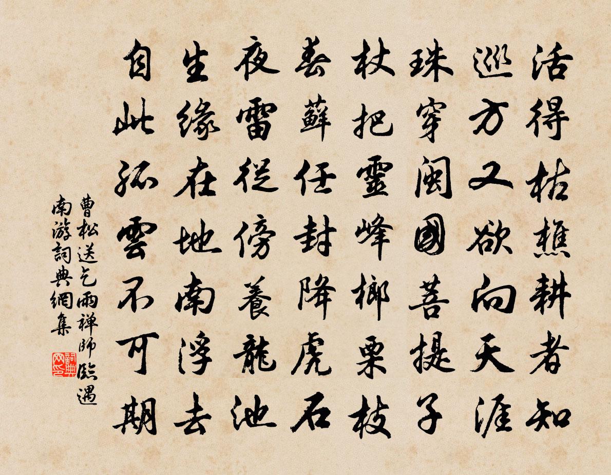 詩詞名句歷史字典書法欣賞書法字典國語詞典說文解字康熙字典古漢語字典標 題 作 者 詩 句 送乞雨禪師臨遇南遊作者:曹松 朝代:唐代送乞雨禪師臨遇南遊原文活得枯樵耕者知,巡方又欲向天涯。珠穿閩國菩提子,杖把靈峰榔栗枝。春蘚任封降虎石,夜雷從傍養龍池。生緣在地南浮去,自此孤雲不可期。詩詞問答問:送乞雨禪師臨遇南遊的作者是誰?答:曹松問:送乞雨禪師臨遇南遊寫於哪個朝代?答:唐代問:送乞雨禪師臨遇南遊是什麼體裁?答:七律曹松送乞雨禪師臨遇南遊書法欣賞送乞雨禪師臨遇南遊書法作品注釋全唐詩:卷717-52詩詞推薦悶題華岳〔宋代〕此心忠義出天資,奴隸兒童莫強為。燕雀不知鴻鵠志,牛羊徒節虎狼皮。事當桀石吠堯日,書在塞鴻歸漢時。拔劍句釋希晝〔宋代〕芳樹侵雲老,孤泉落石危。胡公疏示祖擇之盧氏石詩和之梅堯臣〔宋代〕遠州太守蓬山客,來過盧家尋怪石。盧家百物今已空,唯石難移留舊跡。埋沒尚存三四分,雨淋日炙如皴皵。太守晚晴董嗣杲〔宋代〕空庭斷履跡,江色搖籬門。夕陽雨忽收,晴意回乾坤。水零鷗鷺光,煙淡蘆葦痕。遠客此棲遲,敢昧元造恩。青衫送仙知客總侍者釋道璨〔宋代〕對面相看千里隔,手持史君招隱檄。一條拄杖兩人扶,面帶東湖秋水碧。口裡只安三寸匙,平生懶病無藥醫。菜羹又次韻王珪〔唐代〕吟邊莫放酒杯乾,玉樹瓊樓不奈寒。授簡誰當梁苑賦,泛舟聊作剡溪看。但知盈尺占豐歲,豈為無氊笑冷官。想得蘇幕遮 七返還丹,在人先須,煉己待時潛真子〔元代〕七返功,人難會。返本還元,七轉收歸兌。陽九但行陰六位。何慮三峰,雪裡安然睡。在人修,鬚髮志。烹煉依時早發漁浦潭孟浩然〔唐代〕東旭早光芒,渚禽已驚聒。臥聞漁浦口,橈聲暗相撥。日出氣象分,始知江湖闊。美人常晏起,照影弄流沫。飲水和李屯田西湖尋春宋祁〔宋代〕把酒同尋湖畔春,賞心何況更良辰。留陰岸雨溥紅杏,送暖汀風惱綠蘋。低寫臥虹橋齒密,小裝文鷁舫頭新。聚星轉調鬥鵪鶉王哲〔元代〕一個靈明,作仙子材。響徹瑤宮,*金自開。為忒玲瓏出蓬萊。降下來。謫在凡間,托生俗胎。只恐身便,灑色氣和韋承慶過義陽公主山池其五杜審言〔唐代〕賞玩期他日,高深愛此時。池分八水背,峰作九山疑。地靜魚偏逸,人閒鳥欲欺。青溪留別興,更與白雲期。頌古三十二首釋明辯〔宋代〕打起黃鶯兒,莫教枝上啼。幾回驚妾夢,不得到遼西。對雪二首再用前韻王之道〔宋代〕同雲晝暗空,孤城早休市。行人失道路,賀客擁階砌。翻縞語亦工,飛絮思爭媚。飄飄何所似,想見六銖袂。盈尺正月十日夜大雷震范成大〔宋代〕人言有物司鼓,春到揚桴發聲。但要蟄蟲啟戶,何須一許震驚?汴京紀事二十首 其二十劉子翬〔宋代〕輦轂繁華事可傷,師師垂老過湖湘。縷衣檀板無顏色,一曲當時動帝王。南鄉子佚名〔宋代〕凜冽苦寒時。萬木凋枯力漸衰。昨夜前村深雪裡,春回。庾嶺南枝綻早梅。映月與清輝。驛使加鞭喜探回。風送馨織女蟲黃大受〔宋代〕灝氣逼星河,佳期匝眼過。草間聞織急,天上想寒多。燭里顰挑錦,邊頭冷枕戈。終宵弄機杼,柰此月明何。雪後三首趙蕃〔宋代〕松竹夜枕聽,窗扉朝起看。雖成見晛喜,敢廢履冰難。照映形知穢,噓呵詩故寒。要難窮極覽,安得振飛翰。同魯山韓丞觀女靈廟前險石晃沖之〔宋代〕群不見魯陽之西兩山麓,十里連岡寫平陸。青林白晝暗古祠,雀啅虛檐蛛綱屋。屋子邊怪石何瑰奇,鳳筋上黃連肌贈陳守道蘇軾〔宋代〕一氣混淪生復生,有形有心即有情。共見利慾飲食事,各有爪牙頭角爭。爭時怒發霹靂火,險處直在嵌岩坑。人偽名句推薦欲寫彩箋書別怨。淚痕早已先書滿。晏幾道《蝶戀花· * 開時傷聚散》 亂山殘雪夜,孤燭異鄉人。崔塗《除夜 / 巴山道中除夜書懷 / 除夜有懷》 待人寬一分是福,利人實利己的根基。洪應明《菜根譚·概論》 一葉度春風,芳芳自相接。蕭衍《芳樹》 空山梵唄靜,水月影俱沉。納蘭性德《水調歌頭·題西山秋爽圖》 甚荒唐,到頭來都是為他人作嫁衣裳!曹雪芹《紅樓夢·第一回》 以正治國,以奇用兵,以無事取天下。老子《老子·德經·第五十七章》 只解沙場為國死,何須馬革裹屍還。徐錫麟《出塞》 蜀天常夜雨,江檻已朝晴。杜甫《水檻遣心二首》 發言玄遠,口不臧否人物。房玄齡《晉書·列傳·第十九章》