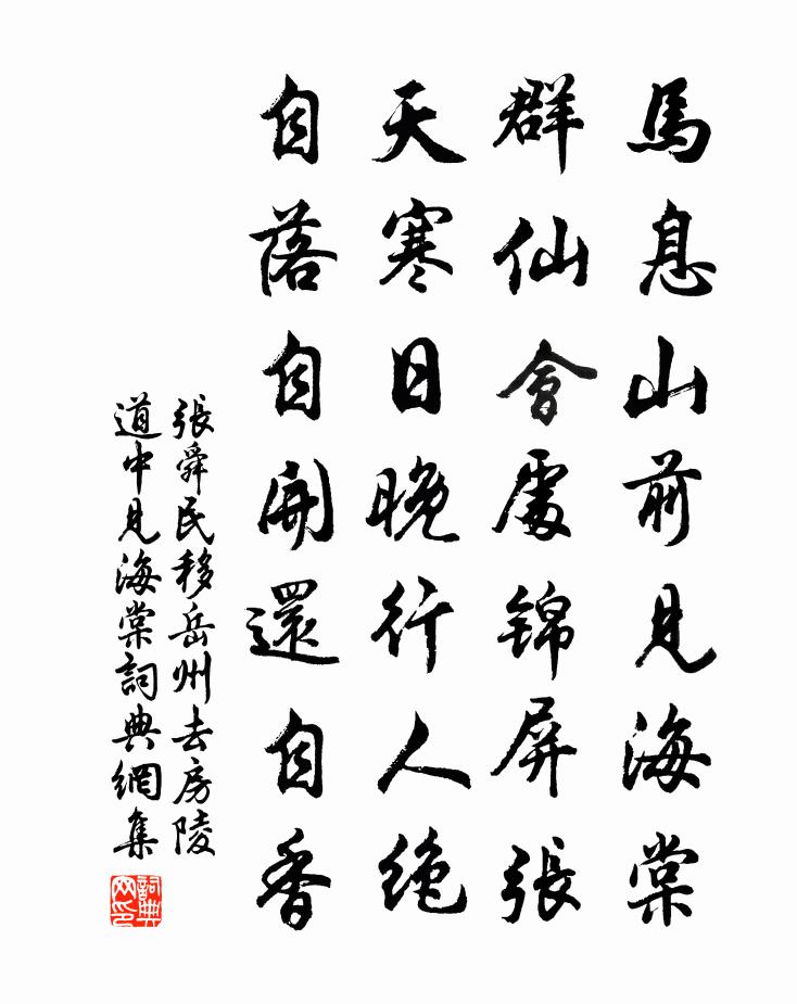 詩詞名句歷史字典書法欣賞書法字典國語詞典說文解字康熙字典古漢語字典標 題 作 者 詩 句 移岳州去房陵道中見海棠作者:張舜民 朝代:宋代移岳州去房陵道中見海棠原文馬息山前見海棠,群仙會處錦屏張。天寒日晚行人絕,自落自開還自香。詩詞問答問:移岳州去房陵道中見海棠的作者是誰?答:張舜民問:移岳州去房陵道中見海棠寫於哪個朝代?答:宋代張舜民移岳州去房陵道中見海棠書法欣賞移岳州去房陵道中見海棠書法作品詩詞推薦遊仙詞三十三首王鎡〔宋代〕龍樓鳳閣起霞光,闕下排班待玉皇。惟有欒巴來得晚,滿身猶帶酒痕香。處和有詩欲過小圃曹勛〔宋代〕小園花木暖成圍,況復軒窗倚翠微。一檻海堂雲錦展,四邊山色曉煙飛。春風爛熳何妨醉,濁酒淋漓任滿衣。甚喜一百五日官舍作宋祁〔宋代〕晉歌本自傳幽憤,楚俗緣何作勝游。宴豆雕文夸瀹卵,俠場星影斗飛毬。光翻蘋吹都無力,暖著花煙不肯流。擣杏摸魚兒 同上李治〔元代〕為多情、和天也老,不應情遽如許。請君試聽雙蕖怨,方見此情真處。誰點注。香瀲灩、銀塘對抹胭脂露。藕絲幾還京樂楊 * 〔宋代〕春光至,欲訪清歌妙舞重為理。念鶯輕燕怯媚容,百斛明珠須費。算枕前盟誓。深誠密約堪憑委。意正美,嬌眼又三君詠狄梁公(仁傑)高適〔唐代〕梁公乃貞固,勛烈垂竹帛。昌言太后朝,潛運儲君策。待賢開相府,共理登方伯。至今青雲人,猶是門下客。南劍州伏虎岩請師開山請贊釋慧開〔宋代〕個樣村僧,也甚奇怪。身如椰子,膽似天大。蟒蛇窟里安禪,猛虎穴中劄寨。無端於微塵國里,轉 * ,聲 * 讀書多所廢忘宋庠〔宋代〕舊學紛無幾,幽懷斷復尋。蒼茫萬機論,零落九州箴。枉嗜韋編讀,猶依槁簡吟。時無袁伯叢,孤陋任年侵。丁寓田家有贈王維〔唐代〕君心印尚棲隱,印久欲傍歸印路。在朝印每為言,解印果成趣。晨雞鳴鄰里,群動從所務。農夫行餉田,閨妾起縫攝山秋夕作屈大均〔清代〕秋林無靜樹,葉落鳥頻驚。一夜疑風雨,不知山月生。松門開積翠,潭水入空明。漸覺天雞曉,披衣念遠征。奉和春日途中喜雨應詔魏知古〔唐代〕皇輿向洛城,時雨應天行。麗日登岩送,陰雲出野迎。濯枝林杏發,潤葉渚蒲生。絲入綸言喜,花依錦字明。微臣韓康公輓詞三首蘇轍〔宋代〕師曠聞弦日,相如作賦年。雖慚眾人後,貪值主文賢。北道初聞召,南江正遠遷。平生闕親近,遺恨屬新阡。下第東歸別友人杜荀鶴〔唐代〕不得同君住,當春別帝鄉。年華落第老,岐路出關長。芳草緣流水,殘花向夕陽。懷親暫歸去,非是釣滄浪。雪中狂言五首張耒〔宋代〕今春齊安大疾疫,閭里老弱死籍籍。篾繩蘆席肩兩夫,繞郭累累瘞千百。玄冥一日行正令,癘氣入地應千尺。異鄉阮郎歸楊端臣〔宋代〕□□今日那人家。瑣窗紅影斜。髻雲散亂不勝花。偷勻殘臉霞。梁燕老,石榴花。佳期今已差。憑闌思想入天涯。晚出湖上葛紹體〔宋代〕雲樹依稀自作行,煙波浩渺別為鄉。漁人不識閒吟客,撒網鳴榔卻斗花。早朝白居易〔唐代〕鼓動出新昌,雞鳴赴建章。翩翩穩鞍馬,楚楚健衣裳。宮漏傳殘夜,城陰送早涼。月堤槐露氣,風燭樺煙香。雙闕婦嘲李新〔宋代〕歲晚隨君色色無,嫁時我自有瓊琚。借令值客休捫虱,幸未詩勿中專驢。寧與漁樵安舊隱,莫言封禪著新書。夜寒驀山溪(趙昌父賦一丘一壑,格律高古,因效其體)辛棄疾〔宋代〕飯蔬飲水,客莫嘲吾拙。高處看浮雲,一丘壑、中間甚樂。功名妙手,壯也不如人,今老矣,尚何堪,堪釣前溪月頌古釋曇密〔宋代〕崔顥曾題黃鶴樓,長沙拈起當風流。大千國土俱家業,諸佛何曾有地頭。名句推薦夫君子之行,靜以修身,儉以養德。諸葛亮《誡子書》 大丈夫當雄飛,安能雌伏!范曄《後漢書·列傳·宣張二王杜郭吳承鄭趙列傳》 翠葆參差竹徑成。新荷跳雨淚珠傾。周邦彥《浣沙溪·翠葆參差竹徑成》 殘螢棲玉露,早雁拂金河。許渾《早秋三首·其一》 不信妾腸斷,歸來看取明鏡前。李白《長相思三首》 博觀而約取,厚積而薄發蘇軾《稼說送張琥》 暮從碧山下,山月隨人歸。李白《下終南山過斛斯山人宿置酒》 卓眾來東下,金甲耀日光。蔡琰《悲憤詩》 逍遙以針勞,談笑以藥倦劉勰《文心雕龍·養氣》 願月常圓,休要暫時缺。趙佶《醉落魄·預賞景龍門追悼明節皇后》