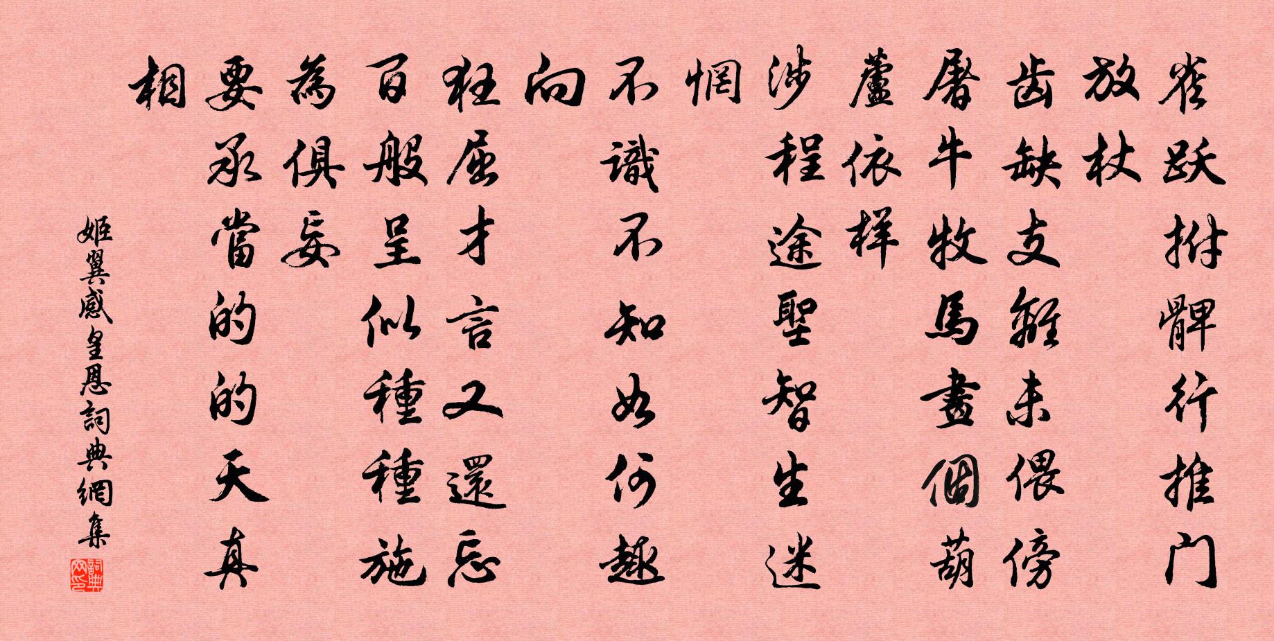 詩詞名句歷史字典書法欣賞書法字典國語詞典說文解字康熙字典古漢語字典標 題 作 者 詩 句 感皇恩作者:姬翼 朝代:元代感皇恩原文雀躍拊髀行,推門放杖。齒缺支離未偎傍。屠牛牧馬,畫個葫蘆依樣。涉程途聖智、生迷惘。不識不知,如何趣向。狂屈才言又還忘。百般呈似,種種施為俱妄。要承當的的、天真相。詩詞問答問:感皇恩的作者是誰?答:姬翼問:感皇恩寫於哪個朝代?答:元代問:感皇恩是什麼體裁?答:詞姬翼感皇恩書法欣賞感皇恩書法作品詩詞推薦偈頌一百六十首釋宗杲〔宋代〕三 * 於大千,其輪本來常清淨。天人得道此為證,三寶於是現世間。近況鄧林〔宋代〕近況只如此,深山無見聞。二中猶學道,三上漫攻文。芸葉春繙日,梨花曉夢雲。添香仍煮茗,嚴敬事天君。筍蔣華子〔宋代〕頭角嶄嶄露,江南四月時。定應孤竹子,未脫老萊衣。怒長搘苔石,旁行過棘籬。不來能幾日,漸學翠鸞飛。張耆年教授置酒官舍環碧散步上園煎桃花茶曾幾〔宋代〕何許清尊對物華,廣文官舍似僧家。向人只合供談笑,領客猶能辦咄嗟。光動杯盤環碧水,香隨珠履上園花。公如法喜寺王安石〔宋代〕門前白道自縈迴,門下青莎間綠苔。雜樹繞花鶯引去,壞檐無幕雁歸來。寂寥誰共樽前酒,牢落空留案上杯。我憶嘲蔣蟠金丹佚名〔宋代〕張鵠只消千馱絹,蔣蟠惟用一丸丹。郊行潘牥〔宋代〕擬欲尋詩取次行,東風放出十分晴。花時酒旆家家有,蠶月繅車處處鳴。乍可腰鐮從父老,何能手板事公卿。他年李翱見藥山圖贊釋紹曇〔宋代〕天本藏雲,瓶元貯水。不會看經。那堪指示。寄語唐朝李相公,只須著眼聽松風。贈幽谷老人蔡向〔宋代〕芒鞋踏破兩淮塵,夢斷鄲邯鄲跡未陳。唳鶴啼猿猶有恨,岩花澗草總相新親。三生頓悟舊緣在,一笑還驚熟處新。岳鄂王墓趙孟頫〔元代〕鄂王墓上草離離,秋日荒涼石獸危。南渡君臣輕社稷,中原父老望旌旗。英雄已死嗟何及,天下中分遂不支。莫向送程秀才下第歸蜀姚鵠〔唐代〕鶯遷與鶂退,十載泣岐分。蜀道重來老,巴猿此去聞。曉程侵嶺雪,遠棧入谿雲。莫滯趨庭戀,榮親只待君。和仲巽山行蘇頌〔宋代〕天險限南北,迴環千里山。客亭依斗絕,故地信偏慳。伴月驅行傳,緣雲度故關。林泉雖勝賞,無奈霫奚間。春詞毛滂〔宋代〕靧面桃花有意開,光風轉蕙日徘徊。昭陽天近知春早,玉琯東風破雪來。得報狀邸吏緘至朝堂八月月單有感而作三首岳珂〔宋代〕十月蒼龍闕,三朝 * 樽。無囊持塞吏,有匭達民言。故事尋常略,遺風萬一存。獨憐記廷諍,斷報說開元。雜詩李復〔宋代〕猗蘭生幽林,秀葉凝綠滋。含芬靜不發,默與清風期。美人閒婉孌,遺世從雲螭。袖中雙珠明,照人冰玉姿。群動送潘翠谷方逢辰〔宋代〕無屋住僧廬,無菜挑野草。野草風味長,僧廬人跡少。剝剝誰扣扃,訪予事幽討。錢唐有騷翁,自號翠谷老。疋馬下水船黃庭堅〔宋代〕總領神仙侶。齊到青雲歧路。丹禁風微,咫尺諦聞天語。盡榮遇。看即如龍變化,一擲靈梭風雨。真游處。上苑尋趙君寶宣慰別三十五年矣末由再晤近張倩仲實牟巘五〔宋代〕伯子堯夫豪傑人,四時佳致四時春。靜能觀動一機活,會復乘元千克淳。造物生生還化化,世情故故又新新。不妨寒夜與伯氏晏坐宋祁〔宋代〕對擁圓爐坐,蕭然念變衰。樹鳴餘葉亂,燈戰暗花危。罇酒伯仲雅,園荊兄弟枝。陶陶且相樂,低月半遙帷。武陵春晏幾道〔宋代〕煙柳長堤知幾曲,一曲一魂消。秋水無情天共遙,愁送木蘭橈。薰香繡被心情懶,期信轉迢迢。記得來時倚畫橋,名句推薦尊卑失序,如冠履倒置;富貴不歸,如錦衣夜行。程登吉《幼學瓊林·卷二·衣服》 竹深樹密蟲鳴處,時有微涼不是風。楊萬里《夏夜追涼》 潭潭大度如臥虎,邊頭耕桑長兒女黃庭堅《送范德孺知慶州》 順天者昌,逆天者亡。毋逆天道,則不失所守。佚名《黃帝四經·十大經·姓爭》 舉棋不定,不勝其耦。左丘明《左傳·襄公·襄公二十五年》 正西望長安,下見江水流。李白《秋浦歌十七首》 怕歌愁舞懶逢迎。妝晚托春酲。陸游《朝中措·代譚德稱作》 兩鬢可憐青,只為相思老。晏幾道《生查子·關山魂夢長》 當事者迷,旁觀者清。佚名《增廣賢文·下集》 寒蟬鳴處,回首斜陽暮。趙彥端《點絳唇·途中逢管倅》