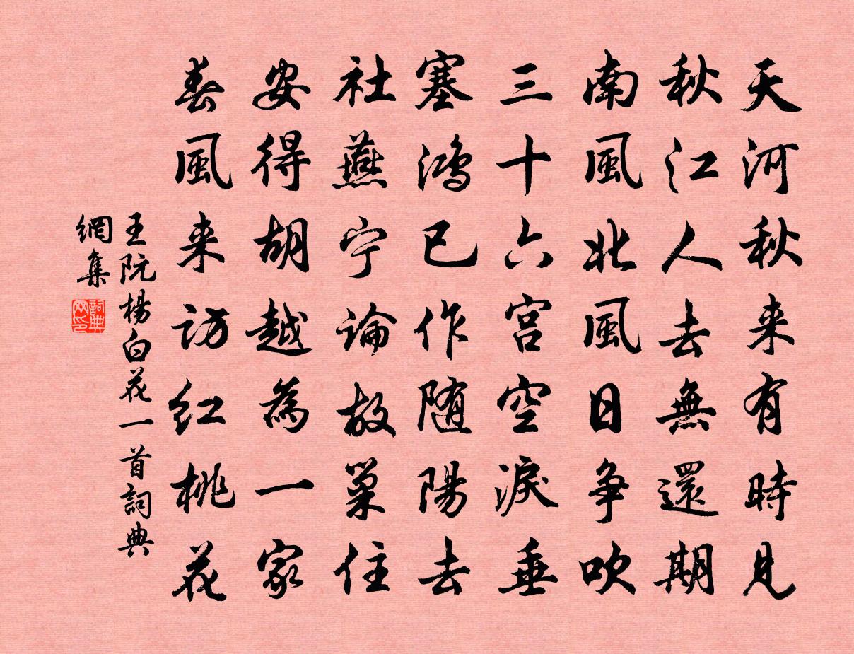 詩詞名句歷史字典書法欣賞書法字典國語詞典說文解字康熙字典古漢語字典標 題 作 者 詩 句 楊白花一首作者:王阮 朝代:宋代楊白花一首原文天河秋來有時見,秋江人去無還期。南風北風日爭吹,三十六宮空淚垂。塞鴻已作隨陽去,社燕寧論故巢住。安得胡越為一家,春風來訪紅桃花。詩詞問答問:楊白花一首的作者是誰?答:王阮問:楊白花一首寫於哪個朝代?答:宋代王阮楊白花一首書法欣賞楊白花一首書法作品詩詞推薦村居陸游〔宋代〕鵯鵊穿林語,(左可右鳥)鵝並水鳴。饋漿憐道喝,裹飯助鄰耕。零落橋危斷,欹斜屋半傾。君毋笑偷惰,猶足盡清心鏡 贈靈陽子李大乘馬鈺〔元代〕靈陽子,來告別。送行不似,相迎時節。聽予囑、遊必有方,待孀毋緊切。我人除,煙火滅。莫忘初志,旋添決烈鹹淳五年天下都散漢許月卿飲無算醉後吟詩秉許月卿六〔宋代〕達旦吟詩達旦飲,半生信直半生貧。睡魔猶侮汪梅叟,何況悠悠俗累人。練波曲徐照〔宋代〕素練平鋪吹不起,夜來垂下天孫機。愁看百尺千尺長,不作遊子寒時衣。飲酒二十首同蘇翰林先生次韻追和陶淵明四晁補之〔宋代〕園林日夕好,花繁時鳥飛。少年玩芳物,不飲成坐悲。只今未白髮,念昔已依依。紛華戰吾道,決勝當有歸。挫銳游梅坡席上雜酬李彌遜〔宋代〕醉帽迎風落,春衣日徑斜。花梢密藏路,隱約見山家。題寒江釣雪圖釋敬安〔清代〕垂釣板橋東,雪壓蓑衣冷。 江寒水不流,魚嚼梅花影。金剛隨機無盡頌非說所說分第二十一釋印肅〔宋代〕即自謗如來,何因得辨才。和風三二月,花發為誰開。泊趙屯孔武仲〔宋代〕憶昨省觀趨{左氵右霝}川,萊衣擁綠方少年。艱難險阻俱未歷,孟浪勇決唯爭先。舟發趙屯猶未飯,有風北起空夜坐薦福寺次王成之韻裘萬頃〔宋代〕鞭鸞未暇相追逐,且向只園止君宿。清談待得月華生,窗戶明明耿殘燭。誰令泉石墮吾前,洗淨人間絕與竹。風帆游毛公洞六首王之道〔宋代〕徘徊銀穴送斜暉,散遣長須上翠微。青鳥似知予意確,故傳仙語傍人飛。蜜梅堯臣〔宋代〕燕銜芹根泥,蜂掇花上蕊。帶雨兩股飛,所取日能幾。調和露與英,凝甘滑於髓。天寒百蟲蟄,割房霜在匕。燕已晚泊慈姥磯下二首陸游〔宋代〕山斷峭崖立,江空翠靄生。漫多來往客,不盡古今情。月碎知流急,風高覺笛清。兒曹笑老子,不睡待潮平。上雲樂李白〔唐代〕金天花之西,白花日所沒。康老胡雛,生彼月窟。巉岩容儀,戍削風骨。碧玉炅炅雙目瞳,黃金拳拳兩鬢紅。華花山中即事李曾伯〔宋代〕手挼岩菊嗅寒香,陡覺輕飈透薄裳。自是蒼官添老色,不因青女眩寒妝。新篘未熟啜茶去,晚稻才收種麥忙。原學贈林秀才葉適〔宋代〕乃翁掩親醵州里,自雲先世曾如此。汝今謀葬無置錐,況有滿族喪累累。春風未回萬山赤,秋霜忽至凋寸碧。鴟鳶郊廟歌辭。漢宗廟樂舞辭。顯仁舞佚名〔唐代〕運極金行謝,天資水德隆。禮神鄜畤館,布政未央宮。詰旦備明祀,登歌答茂功。雲軒臨降久,星俎薦陳豐。靄靄游山陽十首陳造〔宋代〕故人不復倒奚囊,但有荒阡蔭白楊。魂定可招吾得已,試吟楚些命巫陽。蚊對方孝孺〔明代〕天台生困暑,夜臥絺帷中,童子持翣颺於前,適甚就睡。久之,童子亦睡,投翣倚床,其音如雷。生驚寤,以為風負薪行許宣平〔唐代〕負薪朝出賣,沽酒日西歸。路人莫問歸何處,穿入白雲行翠微。名句推薦夫尚賢者,政之本也。墨子《墨子·08章 尚賢(上)》 遊子春衫已試單,桃花飛盡野梅酸。吳濤《絕句·遊子春衫已試單》 爭奈愁來,一日卻為長賀鑄《行路難·縛虎手》 凡軍欲其眾也,心欲其一也,三軍一心則令可使無敵矣。李昉、李穆、徐鉉《太平御覽·兵部·卷二》 故國三千里,深宮二十年。張祜《宮詞·故國三千里》 五月雖熱麥風清,檐頭索索繰車鳴。王建《田家行》 記問之學,不足以為人師。戴聖《禮記·學記》 夜月一簾幽夢,春風十里柔情。秦觀《八六子·倚危亭》 漠漠秋雲起,稍稍夜寒生。白居易《微雨夜行》 憶昔花間相見後,只憑縴手,暗拋紅豆。歐陽炯《賀明朝·憶昔花間相見後》
