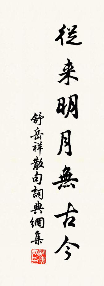 詩詞名句歷史字典書法欣賞書法字典國語詞典說文解字康熙字典古漢語字典標 題 作 者 詩 句 句作者:舒岳祥 朝代:宋代句原文從來明月無古今。詩詞問答問:句的作者是誰?答:舒岳祥問:句寫於哪個朝代?答:宋代舒岳祥句書法欣賞句書法作品詩詞推薦至靈吟邵雍〔宋代〕至靈之謂人,至貴之謂君。明則有日月,幽則有鬼神。曲遊春(清明湖上)施岳〔宋代〕畫舸西泠路,占柳陰花影,芳意如織。小楫衝波,度麴塵扇底,粉香簾隙。岸轉斜陽隔。又過盡、別船簫笛。傍斷偈頌一百一十七首釋紹曇〔宋代〕書載五雲,繡添一線。剝盡群陰,天心復見。惟有龜毛拂,今古無遷變。松根石上笑談空。切忌隨他語脈轉。送覺兄歸洞庭釋如淨〔宋代〕覺盡還源見本心,洞庭無蓋碧沈沈。衲僧不作這伎倆,浪急風高意轉深。琴曲歌辭。蔡氏五弄。幽居弄顧況〔唐代〕苔衣生,花露滴,月入西林盪東壁。扣商占角兩三聲,洞戶谿窗一冥寂。獨去滄洲無四鄰,身嬰世網此何身。關情東陵赴京道病東歸寓居開元寺寄盧員外宋魏二先輩許渾〔唐代〕西風吹雨雁初時,病寄僧齋罷獻書。萬里鹹秦勞我馬,四鄰松桂憶吾廬。滄洲有約心還靜,青漢無媒跡自疏。不是謁闕里高詡〔宋代〕帝王而下幾興亡,銷盡繁華作戰場。惟有東家詩禮在,子孫萬古讀書堂。六經不幸火於秦,日月曾何礙片雲。用舍跨金鸞 嗚鶴餘音卷四牛真人〔元代〕錦堂春,瓊仙朝列瓊筵。遇良辰、名香共*,吐氤氳、瑞藹祥煙。慶三真、重陽五祖,願當今、聖主遐延。昔有軒句諶祜〔宋代〕燕尚有情迎社到,蜨空無夢過時休。永和清都觀謝道士童顏鬒髮問其年生於丙子蓋蘇軾〔宋代〕鏡湖敕賜老江東,未似西歸玉局翁。羈枕未容春夢斷,清都宛在默存中。每逢佳境攜兒去,試問流年與我同。自笑張太博亨泉洪咨夔〔宋代〕公家老博望,手斲扶桑根。騎之泛溟渤,飄然泝崑崙。直到析木津,細問黃河源。玉繩澹碧落,機杼閒天孫。北斗舜廟懷古劉熊渠〔兩漢〕游湘有餘怨,豈是聖人心。竹路猿啼古,祠宮蔓草深。素風傳舊俗,異跡閉荒林。巡狩去不返,煙雲怨至今。有懷半山老人再次韻二首黃庭堅〔宋代〕啜羹不如放麑,樂羊終愧巴西。欲問老翁歸處,帝鄉無路雲迷。虎丘寺路宴留別諸妓白居易〔唐代〕銀泥裙映錦障泥,畫舸停橈馬簇蹄。清管曲終鸚鵡語,紅旗影動潑汗嘶。漸銷醉色朱顏淺,欲語離情翠黛低。莫忘書齋夜坐二首楊萬里〔宋代〕棐凡吹燈丈室虛,隔窗雨點響階除。胡床枕手昏昏著,臥聽兒童讀漢書。黃均州輓詞項安世〔宋代〕乾道淳熙首尾年,相從江漢麗譙邊。主方壯歲才沖斗,客亦兒時氣剌天。故舊彫零真老矣,城門重到輒潸然。最憐酌貪泉因吊吳隱之三首白玉蟾〔宋代〕晉人相扇以清名,何事因泉始立清。清到饑寒妻子地,此清太不近人情。捕蝗-刺長吏也白居易〔唐代〕捕蝗捕蝗誰家子,天熱日長飢欲死。興元兵後傷陰陽,和氣蠱蠹化為蝗。始自兩河及三輔,薦食如蠶飛似雨。雨飛尋劉處士皇甫曾〔唐代〕幾年人不見,林下掩柴關。留客當清夜,逢君話舊山。隔城寒杵急,帶月早鴻還。南陌雖相近,其如隱者閒。九日歸自南山方回〔宋代〕山寒小雨晴,落葉獻秋聲。酒可諸僧共,詩須此老評。鉤簾修竹淨,辟戶遠江橫。相送依依意,丹青畫不成。名句推薦雲橫秦嶺家何在?雪擁藍關馬不前。韓愈《左遷至藍關示侄孫湘》 篳路藍縷,以啟山林。左丘明《左傳·宣公·宣公十二年》 久在樊籠里,復得返自然。陶淵明《歸園田居·其一》 斗萬花樣巧,深染蜂黃。吳文英《惜黃花慢·菊》 守真志滿,逐物意移。周興嗣《千字文·全文》 那年離別日,只道住桐廬。劉采春《囉嗊曲·那年離別日》 不管三七二十一馮夢龍《醒世恆言·卷一》 綠葉素榮,紛其可喜兮。屈原《九章》 西風烈,長空雁叫霜晨月。 * 《憶秦娥·婁山關》 智者不倍時而棄利,勇士不怯死而滅名,忠臣不先身而後君。劉向《戰國策·齊六·燕攻齊取七十餘城》