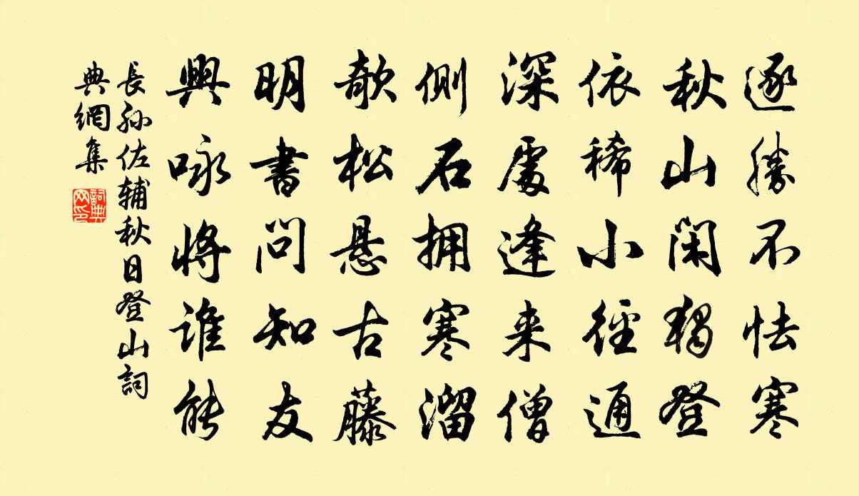 詩詞名句歷史字典書法欣賞書法字典國語詞典說文解字康熙字典古漢語字典標 題 作 者 詩 句 秋日登山作者:長孫佐輔 朝代:唐代秋日登山原文逐勝不怯寒,秋山閒獨登。依稀小徑通,深處逢來僧。側石擁寒溜,欹松懸古藤。明書問知友,興詠將誰能。詩詞問答問:秋日登山的作者是誰?答:長孫佐輔問:秋日登山寫於哪個朝代?答:唐代問:秋日登山是什麼體裁?答:五古長孫佐輔秋日登山書法欣賞秋日登山書法作品注釋全唐詩:卷883-24詩詞推薦白駒佚名〔先秦〕皎皎白駒,食我場苗。縶之維之,以永今朝。所謂伊人,於焉逍遙?皎皎白駒,食我場藿。縶之維之,以永今夕。和續古謝送墨洪咨夔〔宋代〕黑月黳雲脫太清,海風吹上筆頭輕。瑣窗冷透芙蕖碧,定有新銘到九成。塞下許渾〔唐代〕夜戰桑乾北,秦兵半不歸。朝來有鄉信,猶自寄征衣。重傷小女子白居易〔唐代〕學人言語憑床行,嫩似花房脆似瓊。才知恩愛迎三歲,未辨東西過一生。汝異下殤應殺禮,吾非上聖詎忘情。傷心水亭陸游〔宋代〕水亭不受俗塵侵,葛帳筠床弄素琴。一片風光誰畫得:紅蜻蜓點綠荷心。偈二首釋清旦〔宋代〕三世諸佛不知有,一一面南看北斗。狸奴白牯卻知有,雲外金毛正哮吼。箇中隱顯現全身,頭頭透脫無前後。撥轉語松竹韋莊〔唐代〕庭前芳草綠於袍,堂上詩人慾二毛。多病不禁秋寂寞,雨松風竹莫騷騷。曾英發運乾頃攜二詩相過今復寄贈大篇且惠漢周必大〔宋代〕屢空不擬論錢神,多病惟思對藥臣。驟獲斷碑勝與縞,徐觀妙語可書紳。起予字字興三嘆,集古駸駸訪九垠。欲寄女道士王昭儀仙遊詞汪元量〔宋代〕吳國生如夢,幽州死未寒。金閨詩卷在,玉案道書閒。苦霧蒙丹旐,酸風射素棺。人間無葬地,海上有仙山。渡興樂江望祝融林用中〔宋代〕今日溪雲迷小槎,層層錦浪映晴霞。須臾直至前村去,遙望群峰真可夸。問雪晁說之〔宋代〕此雪問誰偏最喜,羯胡得意逞天驕。黃河穩渡魚龍靜,白馬增光劍甲豪。我有玉鈐今震疊,爾看瑤璧莫呼號。何妨句薛純〔宋代〕郡閣訟稀秋正爽,佇攜書劍一相過。次韻張守王勉夫二首陳造〔宋代〕世味平時蟲臂輕,獨留意氣與君傾。向來繾綣資磨玷,擬話分攜已愴情。盛際功名方策足,他年車笠肯渝盟。漢廷句陳襄〔宋代〕世有斯文屬孔顏。次韻許唐臣丈王灼〔宋代〕目斷揚州淚似江,龍輿半夜狩南邦。徒聞四野方多壘,可惜黃旗漫繞槓。濁酒有神磨歲月,愁山無賴入軒窗。青萍巳未春日山居雜興十二解楊萬里〔宋代〕今歲春遲雨亦然,生愁無水打秧田。不消三日如麻腳,線樣溪流浪拍天。呈徐仲車張耒〔宋代〕朝日照高檐,夜霜猶在瓦。纖纖牆邊柳,春色已可把。殘年能幾何,奔駛刻湍瀉。雖無功名求,衰暮亦悲咤出門問沉黎四首李石〔宋代〕蜀相披荒壘,唐人拓密林。四川襟帶重,六詔霧雲深。鹽米成民業,珠犀作吏箴。官閒無一事,閉合念親心。春晚山莊率題盧照鄰〔唐代〕顧步三春晚,田園四望通。遊絲橫惹樹,戲蝶亂依叢。竹懶偏宜水,花狂不待風。唯餘詩酒意,當了一生中。奉和送金城公主適西蕃應制薛稷〔唐代〕天道寧殊俗,慈仁乃戢兵。懷荒寄赤子,忍愛鞠蒼生。月下瓊娥去,星分寶婺行。關山馬上曲,相送不勝情。名句推薦元方難為兄,季方難為弟。劉義慶《世說新語·德行》 良醫之門多病人。荀子《荀子·法行》 豆雨聲來,中間夾帶風聲。蔣捷《聲聲慢·秋聲》 不言之教,無為之益,天下希及之。老子《老子·德經·第四十三章》 人去空流水,花飛半掩門。秦觀《南歌子·香墨彎彎畫》 百二禁兵辭象闕,三千宮女下龍舟。許渾《汴河亭》 待到黃昏月上時,依舊柔腸斷。程垓《卜運算元·獨自上層樓》 不義而富且貴,於我如浮雲。孔子弟子《論語·述而篇》 成人不自在,自在不成人。曹雪芹《紅樓夢·第八十二回》 黃河西來決崑崙,咆哮萬里觸龍門。李白《公無渡河》