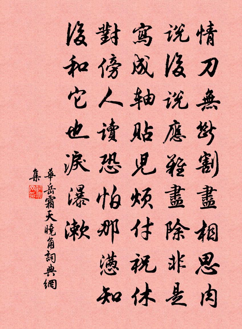 詩詞名句歷史字典書法欣賞書法字典國語詞典說文解字康熙字典古漢語字典標 題 作 者 詩 句 霜天曉角作者:華岳 朝代:宋代霜天曉角原文情刀無斷。割盡相思肉。說後說應難盡,除非是、寫成軸。貼兒煩付祝。休對傍人讀。恐怕那懣知後,和它也淚瀑漱。詩詞問答問:霜天曉角的作者是誰?答:華岳問:霜天曉角寫於哪個朝代?答:宋代華岳霜天曉角書法欣賞霜天曉角書法作品詩詞推薦送昭遠兄歸陝司馬光〔宋代〕種種親頭白,帝城難少留。倚門應有望,列鼎本無求。清夜多歸夢,紅塵厭久游。此行殊捧檄,轅下五驊騮。題城南書院三十四詠張栻〔宋代〕曉來天氣便清新,獨倚闌乾正暮春。花落花開鶯自語,東風吹水細鱗鱗。賦墨雁圖分得宿雁趙希桐〔宋代〕漠漠秋汀起晚煙,半欹寒影立風前。月明應有蘆花夢,飛遍江湖萬里天。荔枝龍眼二絕劉克莊〔宋代〕食觀本草豈非痴,二果甘滋可養脾。耄智自知無益處,肉身安得有輕時。和褚縣丞韻李曾伯〔宋代〕喔松之去爭能誦,載月而歸取甚廉。誨掖尚我忘後進,典刑真不愧前瞻。新詩慰藉知三復,雅意勤渠示一謙。原問水調歌頭(吳制置獵生日)魏了翁〔宋代〕世界要扶助,人物載耆英。茫茫四海,誰識今代有寵臣。萬頃青湖佳氣,一片紫岩心事,天付與斯人。聳聳鐵冠吏曉乘大霧訪仲固胡寅〔宋代〕稚金不耐老火鑄,有烈秋陽尚驕倨。汗流亭午憶淒風,氣應佳辰欣白露。朝來開窗迷眼界,霧色無邊莽回互。誰為送暕上人遊春李端〔唐代〕獨將支遁去,欲往戴顒家。晴野人臨水,春山樹發花。松源和尚贊釋智遇〔宋代〕水庵室里爭鋒,一撐打得耳聾。從芘喚鍾作瓮,滅卻楊岐正宗。自謂水庵可入,卻言不識中峰。解語花(雪)劉子寰〔宋代〕龍沙殿臘,兔苑留寒,花照冰壺夜。亂山平野。裝珠樹滿眼, * 無價。牆頭苑下。渾不見、桃夭杏冶。疑趁風、新定望湖樓張伯玉〔宋代〕龍盤山影倒寒流,十里屏風翠入樓。畫筆肯歸涵碧手,湖光疑對涌金秋。主翁愛客排三雅,漁父忘機任直鉤。為訪送張郎中還蜀歌盧綸〔唐代〕秦家御史漢家郎,親專兩印征殊方。功成走馬朝天子,伏檻論邊若流水。曉離仙署趨紫微,夜接高儒讀青史。瀘南江行第八十九文天祥〔宋代〕朔風飄胡雁,江城帶素月。安得覆八溟,滂沱洗吳越。擬魏太子鄴中集詩 劉楨謝靈運〔南北朝〕卓犖偏人,而文最有氣,所得頗經奇。貧居晏里閈,少小長東平。河兗當衝要,淪飄薄許京。廣川無逆流,招納廁飯後獨立寺門頗見搖落之境欲收以詩大費彈壓趙蕃〔宋代〕作詩無遠到,佇立有深思。集此溪山趣,充吾耳目資。唐虞紫微論,蘇李少陵詩。落落心雖在,茫茫力已疲。新渡寺送任仲微蘇軾〔宋代〕春陰欲落雪,野氣方升雲。我游清潁尾,想見翠被君。古來聚散地,與子復言分。倦遊安稅駕,瘦田失歸耘。獨宿頌古三十一首釋安永〔宋代〕入草親尋草裹人,重重有路掌中平。不遇大商空突曉,日高猶聽打三更。仙跡岩題詩二十三首飛玉亭佚名〔宋代〕閒亭清憩覺情優,四顧嵐光景色幽。湍玉飛簾侵座冷,璇源本自接天流。山叟釋紹曇〔宋代〕不褒紅塵有利名,閒聽幽鳥靜看雲。羲皇世上無窮樂,曝背茅檐策幾勛。題蕪湖雄觀亭陳造〔宋代〕大江來東南,旁客群壑輸。下驛峽下窄,積水陡下百尺餘。勢如千鼓駴萬馬,闛{外門內沓}齧蹙崩騰排軋爭危塗名句推薦春已歸來,看美人頭上,裊裊春幡。辛棄疾《漢宮春·立春日》 兩岸桃花烘日出,四圍高柳到天垂。一尊心事百年期。姜彧《浣溪沙·山滴嵐光水拍堤》 總是愁媒,欲訴誰消遣蘇軾《蝶戀花·蝶懶鶯慵春過半》 一重山,兩重山。山遠天高煙水寒,相思楓葉丹。李煜《長相思·一重山》 傷心秦漢,生民塗炭,讀書人一聲長嘆。張可久《賣花聲·懷古》 紗廚藤簟,玉人羅扇輕縑。白樸《天淨沙·夏》 寒蟬淒切,對長亭晚,驟雨初歇。柳永《雨霖鈴·寒蟬淒切》 一條藤徑綠,萬點雪峰晴。李白《冬日歸舊山》 愁雲淡淡雨瀟瀟。暮暮復朝朝。石孝友《眼兒媚·愁雲淡淡雨蕭蕭》 三冬暫就儒生學,千耦還從父老耕。陸游《觀村童戲溪上》