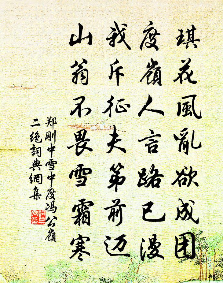 詩詞名句歷史字典書法欣賞書法字典國語詞典說文解字康熙字典古漢語字典標 題 作 者 詩 句 雪中度馮公嶺二絕作者:鄭剛中 朝代:宋代雪中度馮公嶺二絕原文琪花風亂欲成團,度嶺人言路已漫。我斥征夫第前邁,山翁不畏雪霜寒。詩詞問答問:雪中度馮公嶺二絕的作者是誰?答:鄭剛中問:雪中度馮公嶺二絕寫於哪個朝代?答:宋代鄭剛中雪中度馮公嶺二絕書法欣賞雪中度馮公嶺二絕書法作品詩詞推薦次韻師厚雨中晝寢憶江南餅麴酒黃庭堅〔宋代〕雨砌無車馬,風簾灑靜便。忽思江外酒,準擬醉時眠。隱几惟觀化,開書屢絕編。遙知煙渚夢,遣騎喚漁船。西江月石孝友〔宋代〕歌徹秋娘金縷,醉扳織女雲車。而今誰復薦相如。拔劍茫然四顧。好景憑詩斷送,閒愁著酒消除。鏡中絲髮莫驚呼和秉國芙蓉五章司馬光〔宋代〕但見涉江求水際,豈知緣木采霜中。微紅未肯全衰歇,正似酡顏鶴髮翁。憶昔陸游〔宋代〕憶自梁州下益州,身閒處處醉紅樓。早知虛起彈冠意,悔不常為秉燭游。詩思已慚馳陣馬,目光猶覺射車牛。蓮峰浸碧亭月夜葛紹體〔宋代〕夜半橫空一片雲,雲邊明月帶疎星。松關露重驚飛鵲,荷渚風輕低度螢。粟綴嫩黃懷老圃,酒篘新綠見虛亭。秋吟題木刻屏風乾隆〔清代〕誰氏園林擇勝開,山環抱復水瀠洄。川橫橋喜路不斷,岸轉船如峰自回。意入敞亭趣有永,目游高閣望無埃。分明送禪者釋智圓〔宋代〕祖意曾明萬事閒,誰雲方外與人間。卷衣江上秋來別,處處禪心朵朵山。過司空曙村居盧綸〔唐代〕南北與山鄰,蓬庵庇一身。繁霜疑有雪,枯草似無人。遂性在耕稼,所交唯賤貧。何言張掾傲,每重德璋親。讀史羅公升〔宋代〕太初結繩制自好,庖犧倉頡計益疏。拓跋小羌行國字,鐘山丞相著新書。永嘉曹君贈詩次韻一首劉克莊〔宋代〕開卷沉吟首屢搔,想提詩律比戎韜。清於學士茶烹雪,壯似將軍弩射濤。再茜三纁由染漬,久泉卷石可深高。蝸廬酬李相公喜歸鄉國自鞏縣夜泛洛水見寄劉禹錫〔唐代〕鞏樹煙月上,清光含碧流。且無三已色,猶泛五湖舟。鵬息風還起,鳳歸林正秋。雖攀小山桂,此地不淹留。和子瞻同王勝之游蔣山王安石〔宋代〕金陵限南北,形勢豈其然。楚役六千里,陳亡三百年。江山空幕府,風月自觥船。主送悲涼岸,妃埋想故蓮。台傾謝袁起岩侍郎送盆梔奉老母樓鑰〔宋代〕翠綃飛蓋擁生香,冰雪精神試晚妝。鶴髮慈親俄一笑,玉人何事晚升堂。留雲門山中張良臣〔宋代〕僑裝結束爛花衣,采藿蘭娘釂翠卮。三五二八月皎皎,東西南北草離離。非君之故豈妄集,對酒不狂無乃痴。口住念奴嬌侯置〔宋代〕競春台榭,媚東風、迤邐繁紅成簇。方霽溪南簾繡卷,和氣充盈華屋。金暖香彝,玉鳴舞佩,春筍調絲竹。烏衣宴黃魯直催繡詞帖贊岳珂〔宋代〕詞以寓意,何適非理。遊戲翰墨,亦或張弛。此篇所傳,觀蠟之比。樂而不淫,庶幾在此。醉吟五首方回〔宋代〕竊評先民詩,尚復有長短。後進與茲事,我意終不滿。語言豈不工,良欠旨意遠。音節混淫哇,氣習泥季晚。顧於山中對紫薇花書感馬廷鸞〔宋代〕輕盈插向膽瓶中,看到山林禁御同。閣下天葩秋月黯,樓頭奎畫曉雲空。高攀玉樹扶斑白,靜掃蒼苔拾墮紅。三十至節前一日六首方回〔宋代〕征羌漢將趙充國,賜履齊侯周太公。虛叟紀年亦云爾,五湖四海一詩窮。寄吳恕齋侍郎劉克莊〔宋代〕幾年病臥禪床上,一旦名標御札中。收召東都無處士,記憐北谷有愚公。依然晚景垂衰白,勝似天街踏軟紅。多謝名句推薦先到為君,後到為臣。佚名《增廣賢文·上集》 邊月隨弓影,胡霜拂劍花。李白《塞下曲六首》 黃河遠上白雲間,一片孤城萬仞山。王之渙《涼州詞二首·其一》 一夕輕雷落萬絲,霽光浮瓦碧參差。秦觀《春日》 斜倚畫闌嬌不語,暗移梅影過紅橋,裙帶北風飄。納蘭性德《望江南·詠弦月》 梅子留酸軟齒牙,芭蕉分綠與窗紗。楊萬里《閒居初夏午睡起》 傷心千古,秦淮一片明月!薩都剌《念奴嬌·登石頭城次東坡韻》 一朵芙蕖,開過尚盈盈。蘇軾《江神子·江景》 昔我往矣,楊柳依依。佚名《採薇》 燕燕飛來,問春何在,唯有池塘自碧。姜夔《淡黃柳·空城曉角》