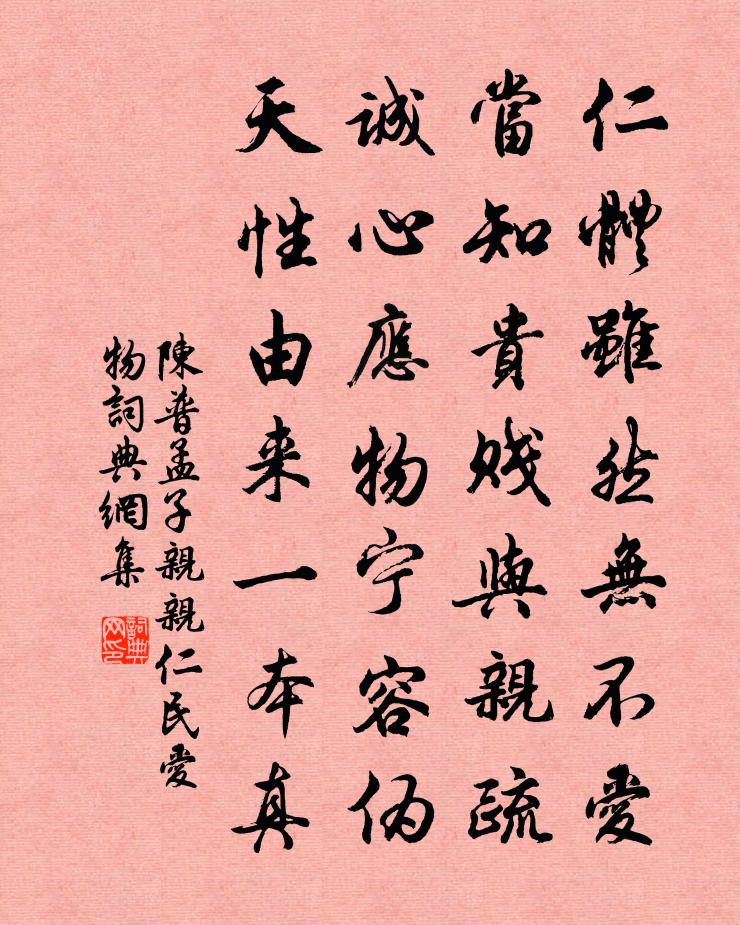 詩詞名句歷史字典書法欣賞書法字典國語詞典說文解字康熙字典古漢語字典標 題 作 者 詩 句 孟子親親仁民愛物作者:陳普 朝代:宋代孟子親親仁民愛物原文仁體雖然無不愛,當知貴賤與親疏。誠心應物寧容偽。天性由來一本真。詩詞問答問:孟子親親仁民愛物的作者是誰?答:陳普問:孟子親親仁民愛物寫於哪個朝代?答:宋代陳普孟子親親仁民愛物書法欣賞孟子親親仁民愛物書法作品詩詞推薦題暇亭釋文珦〔宋代〕人與山同靜,亭巡紫翠間。無時臨鏡水,終日見南山。子敬心猶雜,淵明意自閒。坐來輕世事,薄暮鳥飛還。太常引趙孟頫〔元代〕水風吹樹晚蕭蕭。散發醉 * 。塵事苦如毛。要洗耳、時聽舜韶。舊遊何處,瓊山銀海,宮殿郁ㄖΞ。誰與共游遨賀新郎(紫元席上作)葛長庚〔宋代〕飛盡桃花片。倚東風、高吟大嘯,開懷消遣。芍藥牡丹開未遍。不道韶華如電。無心向、小庭幽院。秉燭夜遊雖不九日會王修竹西樓預坐者七人以落霞與孤鶩齊黃庚〔宋代〕冉冉五雲深,山西日光薄,登樓集群賢,縱目天宇廓。落木悲徂年,寒光照杯酌。浩歌興悠然,意行非澗壑。緬懷送關都官致仕陳襄〔宋代〕鴻鳥于飛,歸戾於澤。君子于田,亦適維則。旅力不愆,曷雲其極。清平樂 和可行梅竹韻三首許有壬〔元代〕平生愛竹。到處縈心曲。一日相違人便俗。栽滿水邊茅屋。誰知歲晚空山。佳人能慰荒寒。莫論和羹結實,且看高題梅山雲悅樓李君式〔宋代〕無心出岫道人閒,身在虛無縹渺間。可惜雲霓人在望,卷將雲雨入梅山。菩薩蠻·畫船捶鼓催君去舒亶〔宋代〕畫船捶鼓催君去。高樓把酒留君住。去住若為情。西江潮欲平。江潮容易得。只是人南北。今日此尊空。知君何日熙寧祀皇地祗十二首佚名〔宋代〕純誠昭融,芳美嘉玉。肅將二精,以享以奠。休光四棄,靈祗來燕。其祥伊何,永世錫義。秋懷十首汪莘〔宋代〕一帶青巒失舊青,荻花楓葉夕陽明。閒思天上多官府,自是幽人道未成。漢州王大錄事宅作杜甫〔唐代〕南溪老病客,相見下肩輿。近發看烏帽,催蓴煮白魚。宅中平岸水,身外滿床書。憶爾才名叔,含淒意有餘。雜吟黃庭堅〔宋代〕城中蛾眉女,珂佩響珊珊。鸚鵡花間弄,琵琶月下彈。長歌三日繞,短舞萬人看。未必長如此,芙蓉不耐寒。贈別顯上人釋紹嵩〔宋代〕兩浙尋山遍,依稀三十秋。征塵添老色,藜杖賦歸休。落葉隨杯渡,殘虹帶夕收。不知從此去,能寄短書不。吳長文新得顏公壞碑王安石〔宋代〕魯公之書既絕倫,歲久更為所珍。荒壇壞冢朽崖屋,剝落風雨埋煨塵。斷碑數尺誰所得,點畫入紙完如新。延陵公端午貼子詞皇太后閣六首周麟之〔宋代〕皋月乘天數,慈闈奉母儀。靈芝三萬歲,樂府有新詞。論語絕句一百首張九成〔宋代〕須知有慾不為剛,血氣乘之反類狂。所以孟軻言直養,要令無助亦無忘。久雨喜晴檢閱計院紀以舂容之篇敬用韻為謝吳潛〔宋代〕樂天何愛詠,堯夫非好吟。愧乏康濟術,粗懷饑溺心。彌旬雨翻屋,耄倪泣蒼{左昏右頁}。微臣職芻牧,癢痛入送別嚴希孟史聲〔宋代〕歲暮送行舟,寒煙古渡頭。渚禽沖客起,野水帶冰流。經史探深趣,江山屬壯遊。莫將和氏璧,輕向暗中投。次韻劉淳叟見寄二首喻良能〔宋代〕九萬垂雲翼,胡為乃倦飛。丘園聊偃息,岩阜故因依。蝶栩新酣睡,鷗馴久息機。只應與風景,相賞莫相違。予行蜀漢間道出潭毒關下每憩羅漢院山光軒今陸游〔宋代〕山光軒上幾閒遊,潭毒關前又小留。麥隴雪苗寒剡剡,柘林風葉暮颼颼。馬行劍閣從今始,門泊吳船亦已謀。醉眼名句推薦美色不同面,皆佳於目;悲音不共聲,皆快於耳王充《論衡·卷三十·自紀篇》 共看明月應垂淚,一夜鄉心五處同。白居易《望月有感》 啼號升斗抵千金,凍雀飢鴉共一音。范成大《雪中聞牆外鬻魚菜者求售之聲甚苦有感》 粉黛暗愁金帶枕,鴛鴦空繞畫羅衣,那堪辜負不思歸!顧敻《浣溪沙·雲淡風高葉亂飛》 畫閣朱樓盡相望,紅桃綠柳垂檐向。王維《洛陽女兒行》 忽大風起,塵氣莽莽然,城市依稀而已。蒲松齡《山市》 名無固實,約之以命實,約定俗成,謂之實名。荀子《荀子·正名》 神閒氣靜,智深勇沉,此八字是幹大事的本領。王永彬《圍爐夜話·第一七六則》 秋天一夜靜無雲,斷續鴻聲到曉聞。張仲素《秋閨思二首》 最喜小兒亡賴,溪頭臥剝蓮蓬。辛棄疾《清平樂·村居》