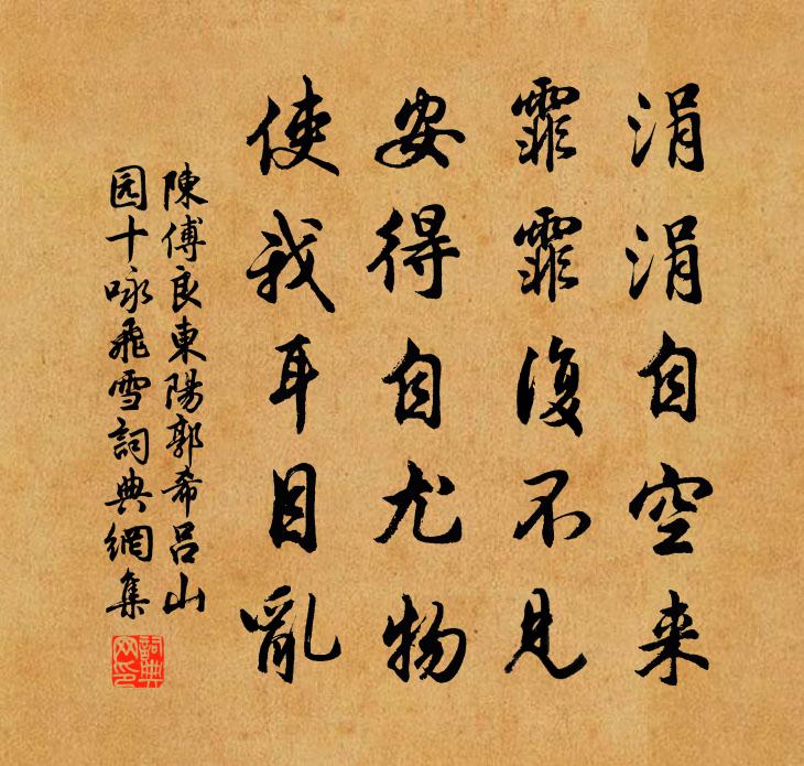 詩詞名句歷史字典書法欣賞書法字典國語詞典說文解字康熙字典古漢語字典標 題 作 者 詩 句 東陽郭希呂山園十詠飛雪作者:陳傅良 朝代:宋代東陽郭希呂山園十詠飛雪原文涓涓自空來,霏霏復不見。安得自尤物,使我耳目亂。詩詞問答問:東陽郭希呂山園十詠飛雪的作者是誰?答:陳傅良問:東陽郭希呂山園十詠飛雪寫於哪個朝代?答:宋代陳傅良東陽郭希呂山園十詠飛雪書法欣賞東陽郭希呂山園十詠飛雪書法作品詩詞推薦明發陳公徑過摩舍那灘石峰下十首楊萬里〔宋代〕後顧江已遠,前睨山若寒。棹進岸自回,天水未有極。簾欣入絕巘,舟愕觸潛石。東暾澹未熹,北吹寒更寂。岸草汝州郡樓望嵩山許棠〔唐代〕不共眾山同,岧嶢出迥空。幾層高鳥外,萬仞一樓中。水落難歸地,雲籬便逐風。唯應霄漢客,絕頂路方通。金縷曲 姜西溟言別,賦此贈之納蘭性德〔清代〕誰復留君住?嘆人生、幾翻離合,便成遲暮。最憶西窗同翦燭,卻話家山夜雨。不道只、暫時相聚。袞袞長江蕭蕭題薦福寺楊萬里〔宋代〕千山底里著樓台,半夜松風萬岳哀。曉起巡檐看題壁,雨聲一片隔林來。臨江仙蔡伸〔宋代〕繁杏枝頭蜂蝶亂,香風闔坐微聞。靚妝濃艷任東君。無情風雨,春事已平分。珍重主人留客意,夜闌秉燭開尊。何樂章五曲李復〔宋代〕刻花圓楹青玉趺,高堂{左車右獻}{左車右獻}雲錦舒。兩階納陛先登巫,近前神喜巫歌呼。揚桴兮拊鼓,金鳴殢人嬌張擴〔宋代〕多少胭脂,勻成點就。千枝亂、攢紅堆繡。花無長好,更光陰去驟。對景憶良朋,故 * 手。曾記年時,花間把酒句高載〔宋代〕擬約滄光異姓兄。闕題釋文珦〔宋代〕吾生本不識字,人謂吾詩入微。篇章聊復爾耳,止觀然猶庶幾。武昌銅劍歌(並敘)蘇軾〔宋代〕供奉官鄭文,嘗官於武昌。江岸裂,出古銅劍,文得之以遺余。冶鑄精巧,非鍛冶所成者。雨餘江清風卷沙,雷公冬至和適莊即事韻王柏〔宋代〕跛躄廢人事,來投大士家。清談半窗月,澹坐一杯茶。燕豆來霜果,鴝瓶浸臘花。葭浮才一日,芳思已無涯。依韻和胡武平懷京下游好梅堯臣〔宋代〕南國易悲愁,西風起高樹。枯荷復送雨,度雁寧知數。欲問北來音,系書復若故。冥飛杳無跡,弋者徒有慕。況在懷古二首王安石〔宋代〕長者一床室,先生三徑園。非無飯滿缽,亦有酒盈樽。不起華邊坐,常開柳際門。漫知談實相,欲辯已忘言。鷓鴣天惠洪〔宋代〕蜜燭花光清夜闌。粉衣香翅繞團團。人猶認假為真實,蛾豈將燈作火看。方嘆息,為遮攔。也知愛處實難拚。忽然答人書意邵雍〔宋代〕仲尼言正性,子輿言踐形。二者能自得,殆不為虛生。所交若以道,所感若民誠。雖三軍在前,而莫得之凌。納涼范成大〔宋代〕雨洗新秋夜氣清,悴肌無汗葛衣輕。畫檐分月下西壁,絡緯飛來庭樹鳴。贈田叟李商隱〔唐代〕荷筱衰翁似有情,相逢攜手繞村行。燒畬曉映遠山色,伐樹暝傳深谷聲。鷗鳥忘機翻浹洽,交親得路昧平生。撫躬遊宦十年於外歸自浙東睹西山先塋周圍林木氣虞儔〔宋代〕萬畝墳山遍野陰,幾年樵採到如今。藩籬有限重加護,斤斧無端免見侵。缺處更須頻檢校,暇時何惜一登臨。先君句鄭文寶〔宋代〕失意慣中遷客酒,多年不見侍臣花。題丁適之菊莊方回〔宋代〕令威舊主芙蓉城,上帝謂此職未清。敕賜別業非菽粟,屈餐陶采余秋英。菊莊先生拜新號,掌管黃花躬播耕。莊田名句推薦雲盡月如練,水涼風似秋。歐陽詹《荊南夏夜水樓懷昭丘直上人云夢李莘》 壯志飢餐胡虜肉,笑談渴飲匈奴血。岳飛《滿江紅·寫懷》 雲壓西村茅舍重,怕他榾柮同燒。陳維崧《臨江仙·寒柳》 恨人間、會少離多,萬古千秋今夕。張埜《奪錦標·七夕》 黃河曲里沙為岸,白馬津邊柳向城。高適《夜別韋司士》 雁引愁心去,山銜好月來。李白《與夏十二登岳陽樓》 誠者,天之道也;思誠者,人之道也。至誠而不動者,未之有也;不誠,未有能動者也。孟子《孟子·離婁章句上·第十二節》 郎騎竹馬來,繞床弄青梅。李白《長干行二首》 小來思報國,不是愛封侯。岑參《送人赴安西》 鴻雁來時,無限思量。晏殊《訴衷情·芙蓉金菊斗馨香》