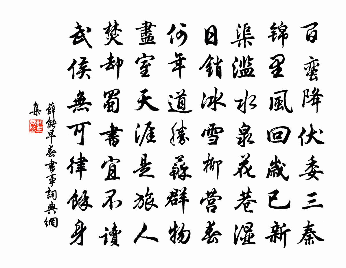 詩詞名句歷史字典書法欣賞書法字典國語詞典說文解字康熙字典古漢語字典標 題 作 者 詩 句 早春書事作者:薛能 朝代:唐代早春書事原文百蠻降伏委三秦,錦里風回歲已新。渠濫水泉花巷濕,日銷冰雪柳營春。何年道勝蘇群物,盡室天涯是旅人。焚卻蜀書宜不讀,武侯無可律余身。詩詞問答問:早春書事的作者是誰?答:薛能問:早春書事寫於哪個朝代?答:唐代問:早春書事是什麼體裁?答:七律薛能早春書事書法欣賞早春書事書法作品注釋全唐詩:卷559-17詩詞推薦已巳歲除夜有感宋庠〔宋代〕明晦互推斥,中都芳歲蘭。星回迫舊次,籥暖送餘寒。來辰繭有緒,去境環無端。天運故相易,人心那獨安。懷此吉老手刃凶人為母報仇詩以紀之喻良能〔宋代〕臥冰叱馭全忠孝,王氏多賢今古同。公乎孝行驚創見,落落豈特漢晉風。凶人夜半發丘隴,敢爾 * 不畏公。古來秋登張明府海亭孟浩然〔唐代〕海亭秋日望,委曲見江山。染翰聊題壁,傾壺一解顏。歌逢彭澤令,歸賞故園間。予亦將琴史,棲遲共取閒。鄧國太夫人輓歌宋之問〔唐代〕鸞死鉛妝歇,人亡錦字空。悲端若能減,渭水亦應窮。秋意劉子翬〔宋代〕又見庭梧一葉飛,物華心事兩差池。百年未半老相逼,四序平分秋獨悲。過岸山川雲漠漠,殘燈院落雨絲絲。客懷七言四韻十六首張伯端〔宋代〕人生雖有百年期,壽夭窮通莫預知。昨日街頭猶走馬,今朝棺內已眠屍。妻財遺下非君有,罪業將行難自欺。大藥六月十五日詣水公庵雨作朱熹〔宋代〕雲起欲為雨,中川分晦明。才驚橫嶺斷,已覺疏林鳴。空際旱塵滅,虛堂涼思生。頹檐滴瀝余,忽作流泉傾。況此素馨花傅伯成〔宋代〕昔日雲鬟鎖翠屏,只今煙冢伴荒城。香魂斷續無人問,空有幽花獨擅名。巫山高文同〔宋代〕巫山高,高凝煙,十二碧簪寒插天。危岩絕壁已飛動,況復下壓萬丈之蒼淵。波衝浪激作深井,虎眼徹底一漩。長舟次彭澤李中〔唐代〕飄泛經彭澤,扁舟思莫窮。無人秋浪晚,一岸蓼花風。鄉里夢漸遠,交親書未通。今宵見圓月,難坐冷光中。靈苑寺錢朝隱〔宋代〕馬前山色連天起,竹外溪聲動地來。試過溪橋訪山寺,清風為我拂塵埃。贈萬年陸郎中孟郊〔唐代〕天子憂劇縣,寄深華省郎。紛紛風響珮,蟄蟄劍開霜。舊事笑堆案,新聲唯雅章。誰言百里才,終作橫天梁。江鴻寇恂徐鈞〔宋代〕王郎百萬肆憑陵,誰集漁陽上谷兵。一剪妖氛河北定,中興從此創基成。送友人兄弟赴省馮時行〔宋代〕書劍一門去,由來得主盟。峨冠雖合沓,再鼓已聾盲。風急鴒原起,雲高雁序橫。天衢在咫尺,去去任飛鳴。力疾馬上走筆司空圖〔唐代〕釀黍長添不盡杯,只憂花盡客空回。垂楊且為晴遮日,留遇重陽即放開。謝韜光上人贈百齡藤杖姚合〔唐代〕衰病近來行少力,光公乞我百齡藤。閒來杖此向何處,過水緣山只訪僧。出塞喬備〔唐代〕沙場三萬里,猛將五千兵。旌斷冰溪戍,笳吹鐵關城。陰雲暮下雪,寒日晝無晶。直為懷恩苦,誰知邊塞情。風入松(遠山橫)韓淲〔宋代〕小樓春映遠山橫。綠遍高城。望中一片斜陽靜,更萋萋、芳草還生。疏雨冷煙寒食,落花飛絮清明。數聲弦管忍重覽鄰幾重遊西池兼簡和叔韓維〔宋代〕積雨淹連騎,新波灩廣池。喜聞重到客,更作復游詩。逐水無留絮,飄空有斷絲。送春吾得地,一問故人期。再和十首蘇轍〔宋代〕一官疏散自疑仙,三考應成醉日千。早病固須閒地著,多憂長被達人憐。名句推薦木蘭舟上,何處吳娃越艷:藕花紅照臉。孫光憲《河傳·風颭》 灼灼野花香,依依金柳黃。佚名《菩薩蠻·霏霏點點回塘雨》 陽關萬里道,不見一人歸。庾信《重別周尚書》 允恭克讓,光被四表,格於上下。佚名《尚書·虞書·堯典》 柏台霜威寒逼人,熱海炎氣為之薄。岑參《熱海行送崔侍御還京》 門外垂楊岸側,畫橋誰系蘭舟。万俟詠《木蘭花慢·恨鶯花漸老》 悵望倚危欄,紅日無言西下。張昪《離亭燕·一帶江山如畫》 墦間人散後,烏鳥正西東。范成大《清明日狸渡道中》 人而無信,不知其可也。孔子弟子《論語·為政篇》 淒涼寶劍篇,羈泊欲窮年。李商隱《風雨》