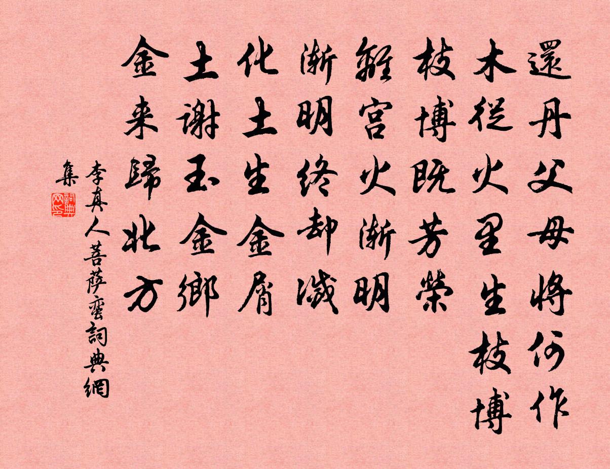 詩詞名句歷史字典書法欣賞書法字典國語詞典說文解字康熙字典古漢語字典標 題 作 者 詩 句 菩薩蠻作者:李真人 朝代:元代菩薩蠻原文還丹父母將何作。木從火里生枝博。枝博既芳榮。離宮火漸明。漸明終卻滅。化土生金屑。土謝玉金鄉。金來歸北方。詩詞問答問:菩薩蠻的作者是誰?答:李真人問:菩薩蠻寫於哪個朝代?答:元代問:菩薩蠻是什麼體裁?答:詞李真人菩薩蠻書法欣賞菩薩蠻書法作品詩詞推薦紫荷車范成大〔宋代〕綠英吐弱線,翠葉抱修莖。矗如青旄節,草中立亭亭。根有卻老藥,鱗皺友松苓。長生不暇學,聊冀病身輕。次陳剛父見簡韻黃文雷〔宋代〕讀書知姓名,心死蜚貌敬。昭回不在小,中天揭西柄。空山三木榻,綠滿風雨徑。歲寒毋忘我,細意匡山詠。中原民謠過沃州周麟之〔宋代〕過沃州,停車聽我遺民謳。茲為名邦古趙地,皇家得姓基鴻休。自胡雜居民在鼎,民心不改千年並。一日天開神火春陽台陳岩〔宋代〕富貴風吹一鬨埃,春陽留得舊時台。老松偃蹇山前立,曾是昔人歌舞來。即事謝公表二絕句晁說之〔宋代〕碧嵩青潁肯相從,萬事茅堂醉夢中。出到人前羞欲死,歸輪不必問何從。偈頌十二首釋如淨〔宋代〕半年喫飯坐鞔峰,鎖斷煙雲千萬重。忽地一聲轟霹靂,帝鄉春色杏花紅。狗馬辭楊維楨〔元代〕狗有烏龍癘馬有的盧,的盧徇主兮烏龍食奴。於呼交之借兮無解,孤之託兮無嬰。吁嗟烏龍兮狗之解,吁嗟的盧兮經漂母墓劉長卿〔唐代〕昔賢懷一飯,茲事已千秋。古墓樵人識,前朝楚水流。渚蘋行客薦,山木杜鵑愁。春草茫茫綠,王孫舊此游。南坡口號十八首鄭清之〔宋代〕記得兒時誦古詩,其甘如薺謂吾欺。淡交休恨相知晚,攜向晶盤笑殺伊。早寒陸游〔宋代〕沔鄂猶殘暑,荊巫已早寒。潦收灘正白,霜重葉初丹。節物元非惡,情懷自鮮歡。暮年更世事,唯有醉江乾。次王仲信食粥李洪〔宋代〕太白狂歌力士鐺,未如食粥魯公清。從教過午飢腸轉,政坐喔詩青眼橫。奇怪爭觀出月脅,詼諧猶足助言鯖。臥聽酬趙二侍御使西軍贈兩省舊僚之作張九齡〔唐代〕石室先鳴者,金門待制同。操刀嘗願割,持斧竟稱雄。應敵兵初起,緣邊虜欲空。使車經隴月,征旆繞河風。忽枉五用出郊韻三首吳潛〔宋代〕寄語頭銜水利官,隄防莫作等閒看。田疇雖幸收成早,溝澮猶疑灌溉殘。勸課農桑心獨苦,丁寧父老吻應乾。米從菩薩蠻孫洙〔宋代〕樓頭上有三冬鼓。何須抵死催人去。上馬苦匆匆。琵琶曲未終。回頭腸斷處。卻更廉纖雨。漫道玉為堂。玉堂今夜春夜雪再用韻十首楊公遠〔宋代〕東風怒撼樹梢鳴,凍住頑雲黯不明。兀坐爐邊閒側耳,春蟲撩亂撲窗聲。紹興祀岳鎮海瀆四十三首佚名〔宋代〕蹇兮紛紛,神實戾止。以飲以食,以享以祀。{左日右幼}兮冥冥,神亦歸止,以醉以飽,以錫爾祉。廣化遇雨張耒〔宋代〕浮雲蔽高峰,台殿延晚色。風聲轉谷豪,雨腳射山白。東樓瞰虛明,龍甲排松柏。蕭森異人境,坐視動神魄。撞鐘春日西湖作齊己〔唐代〕一水繞孤島,閒門掩春草。曾無長者轍,枉此問衰老。山中喜崔補闕見尋劉言史〔唐代〕鹿袖青藜鼠耳巾,潛夫豈解拜朝臣。白屋藜床還共入,山妻老大不羞人。元石吳文震〔宋代〕卷石之中有道存,岩岩氣象峻於天。巍乎近取舜為法,早爾如群孔在前。跨六鰲頭觀戴極,出群龍首要承乾。聖門名句推薦今日山城對垂淚,傷心不獨為悲秋。李益《上汝州郡樓》 誰知萬里客,懷古正躊躕。陳子昂《峴山懷古》 青春幾何時,黃鳥鳴不歇。李白《江南春懷》 早是他鄉值早秋,江亭明月帶江流。王勃《秋江送別二首》 夫治身與治國,一理之術也。呂不韋《呂氏春秋·覽·審分覽》 正江令恨別,庾信愁賦劉辰翁《蘭陵王·丙子送春》 群居防口,獨坐防心。佚名《增廣賢文·下集》 孤雲與歸鳥,千里片時間。馬戴《落日悵望》 愁一箭風快,半篙波暖,回頭迢遞便數驛周邦彥《蘭陵王·柳》 雨前初見花間蕊,雨後兼無葉里花。王駕《雨晴》