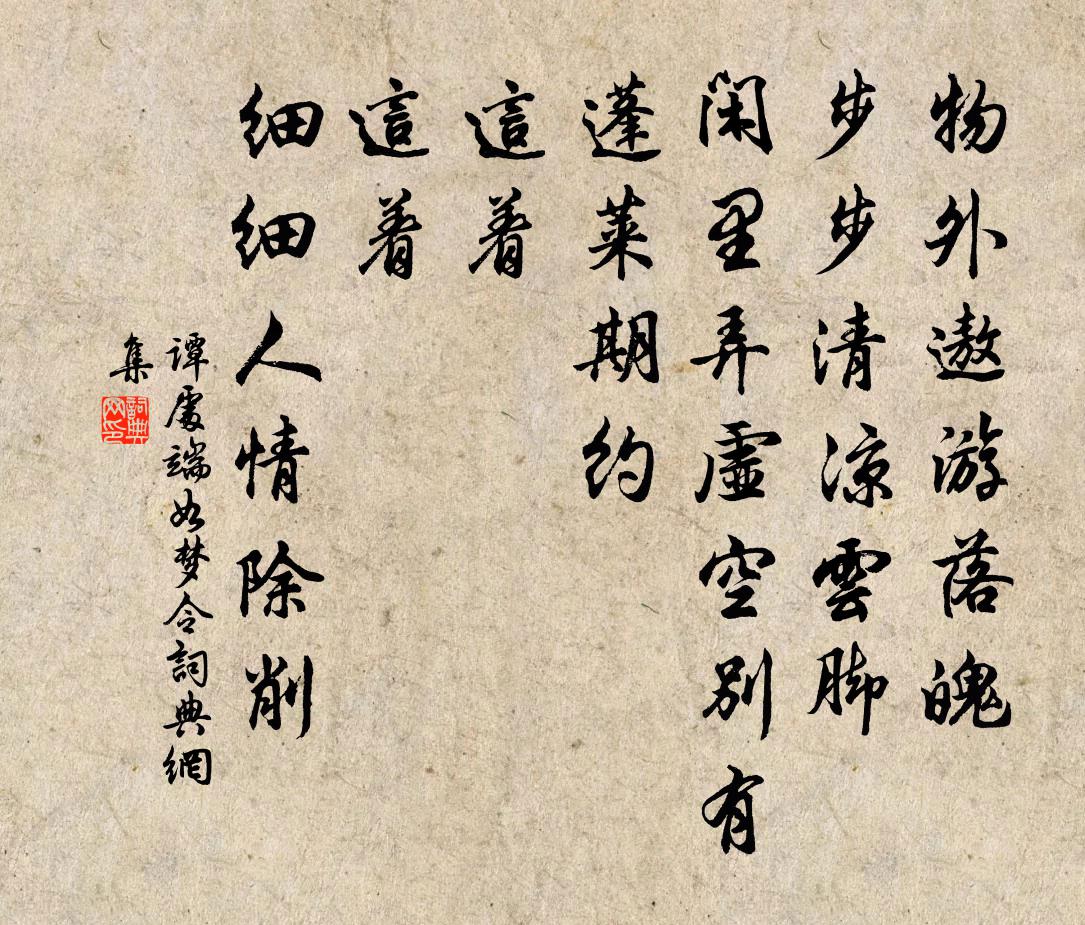 詩詞名句歷史字典書法欣賞書法字典國語詞典說文解字康熙字典古漢語字典標 題 作 者 詩 句 如夢令作者:譚處端 朝代:元代如夢令原文物外遨遊落魄。步步清涼雲腳。閒里弄虛空,別有蓬萊期約。這著。這著。細細人情除削。詩詞問答問:如夢令的作者是誰?答:譚處端問:如夢令寫於哪個朝代?答:元代問:如夢令是什麼體裁?答:詞譚處端如夢令書法欣賞如夢令書法作品詩詞推薦春詞劉克莊〔宋代〕人競迎新歲月,儂方餞舊年。雛鶯又畫百囀,高柳忽三眠。王持中讀余近詩跋以五絕因次其韻吳則禮〔宋代〕禿髮敢言文字工,半生端在覉旅中。君詩底物似妙麗,墮蕊起舞春蒙蒙。待家釀未至,且買姜店村酒楊萬里〔宋代〕奔走人都倦,檐檠酒未來。那能待竹葉,隨喜喚茅柴。蘆菔仍多煮,庵摩帶淺煨。深村市無囪,草草兩三杯。寄酇里張嵲〔宋代〕長江依舊循荒壘,零落遺民有幾家。莫伐城邊舊桃李,為憐曾發亂前花。效徐陵體贈更衣李商隱〔唐代〕密帳真珠絡,溫幃翡翠裝。楚腰知便寵,宮眉正斗強。結帶懸梔子,繡領刺鴛鴦。輕寒衣省夜,金斗熨沈香。右軍復尅二書帖贊岳珂〔宋代〕書摹於唐,故不當印以貞觀。然而涸筆天成,書名雲爛,殆不止於真之亂。彼無別者,徒欲侈其真而汩以贗。石汰夜坐觀書廖行之〔宋代〕風露氣淒清,秋堂燈火夕。開編對聖賢,窮理貫今昔。豈無侯門裾,俛仰無顏色。豈無終南路,矯詐虧名實。萃耕齊天樂周密〔宋代〕東風又入江南岸,年年漢宮春早。寶屑無痕,生香有韻,消得何郎花惱。孤山夢繞。記路隔金沙,那回曾到。夜月寄和邢子屑孫肖之始春見寄王銍〔宋代〕海山雪後海天寬,群玉參差萬里寒。岩谷無人共清夜,倚欄獨向月中看。虞美人(邢子友會上)陳與義〔宋代〕超然堂上閒賓主。不受人間暑。冰盤圍坐此州無。卻有一瓶和露、玉芙蕖。亭亭風骨涼生牖。消盡尊中酒。酒闌明下第游金明池鄭獬〔宋代〕騎殺青都白玉麟,歸來狂醉後池春。人間得喪尋常事,不避郎君走馬塵。水調歌頭(蒲制帥以喜雨韻為壽,和以謝之)李曾伯〔宋代〕兩歲是六帙,萬里客他州。一眉新月西掛,又報桂花秋。想見吳中稚子,已辦秫田數頃,更種橘千頭。堪笑新亭酒賀新郎(六用韻。敘謫仙為宮教兄壽)劉克莊〔宋代〕鵬賦年猶少||。晚飄蓬、夜郎秋浦,漁歌猿嘯||。駿馬名姬俱散去,參透南華微妙。斂萬丈、光芒迥照。妃子送蜀客雍陶〔唐代〕劍南風景臘前春,山鳥江風得雨新。莫怪送君行較遠,自緣身是憶歸人。挽京口使君豐郎中十首劉宰〔宋代〕開邊為計苦匆匆,淮水東流戰血紅。軍令一申人百勇,議郎當日佐元戎。題金陵雜興詩後十八首李璉〔宋代〕夜過江左從鸞旗,從此靈君著漢衣。春到陰山花似雪,望鄉台上鷓鴣飛。北帳書事蘇頌〔宋代〕北海蓬蓬氣怒號,厲聲披拂晝兼宵。百重沙漠連空暗,四向茅檐捲地飄。與日過河流水涸,行天畜物密雲遙。輶軒醉翁操(七月上浣游裴園)樓鑰〔宋代〕茫茫。蒼蒼。青山繞、千頃波光。新秋露風荷吹香。悠颺心地然,生清涼。古岸搖垂楊。時有白鷺飛來雙。隱君如寄徐明叔郎中王洋〔宋代〕雪釀寒漿凍結醅,獨謠興懶自持杯。聊憑書詰徐居士,許折梅花不寄來。至白湖驛寄四弟孔武仲〔宋代〕江頭言別頗匆匆,暮止荒陂破屋中。散盡煙雲無夜雨,喚驚鳧雁有春風。卻思僧舍一少會,坐卷香醪百盞空。薄祿名句推薦不忍覆余觴,臨風淚數行納蘭性德《菩薩蠻·催花未歇花奴鼓》 審定有無與其實虛,隨其嗜欲以見其志意。王詡《鬼谷子·捭闔》 念故人,千里至此共明月。寇準《踏莎行·寒草煙光闊》 洞門高閣靄餘輝,桃李陰陰柳絮飛。王維《酬郭給事 / 贈郭給事》 何日功成名遂了,還鄉,醉笑陪公三萬場。蘇軾《南鄉子·和楊元素時移守密州》 吹燈窗更明,月照一天雪。袁枚《十二月十五夜》 今又重陽,戰地黃花分外香。 * 《採桑子·重陽》 精於物者以物物,精於道者兼物物。荀子《荀子·解蔽》 童子解吟長恨曲,胡兒能唱琵琶篇。李忱《吊白居易》 片帆西去,一聲誰噴霜竹。辛棄疾《念奴嬌·登建康賞心亭呈史致道留守》