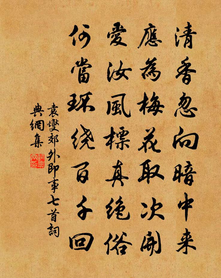 詩詞名句歷史字典書法欣賞書法字典國語詞典說文解字康熙字典古漢語字典標 題 作 者 詩 句 郊外即事七首作者:袁燮 朝代:宋代郊外即事七首原文清香忽向暗中來。應為梅花取次開。愛汝風標真絕俗,何當環繞百千回。詩詞問答問:郊外即事七首的作者是誰?答:袁燮問:郊外即事七首寫於哪個朝代?答:宋代袁燮郊外即事七首書法欣賞郊外即事七首書法作品詩詞推薦古人名詩權德輿〔唐代〕藩宣秉戎寄,衡石崇勢位。年紀信不留,弛張良自愧。樵蘇則為愜,瓜李斯可畏。不顧榮官尊,每陳豐畝利。家林木山引水二首蘇轍〔宋代〕檐下枯槎拂荻梢,山川迤邐費公瓢。幽泉細細流岩鼻,盆水瀰瀰漲海潮。但愛堅如湖上石,誰憐收自灶中焦。蒼崖楊柳枝詞九首·其一劉禹錫〔唐代〕塞北梅花羌笛吹,淮南桂樹小山詞。請君莫奏前朝曲,聽唱新翻楊柳枝。祇園寺綦毋潛〔唐代〕寶坊求往跡,神理駐沿洄。雁塔酬前願,王身更後來。加持將暝合,朗悟豁然開。兩世分明見,餘生復幾哉。送冽寺主之京迎禪和尚靈一〔唐代〕禪門居此地,瞻望在虛空。水國月未上,蒼生如夢中。上人知機士,瓶錫慰樊籠。彼土諸梵眾,嗟君揚道風。訪僧不遇崔道融〔唐代〕尋僧已寂寞,林下鎖山房。松竹雖無語,牽衣借晚涼。題處士居鄭獬〔宋代〕高臥太湖石,自嫌名利腥。網羅當道路,鴻鵠出青冥。氣貯秋琴淡,心蟠古劍靈。我來閒劇論,山鬼不須聽。越二年正旦又會宿猿洞程師孟〔宋代〕夜半春歸曉始驚,郁然佳氣入山亭。千門喜慶逢元日,一座光華見使星。難得同時傳壽斝,合將新句勒詩屏。漁郎曉思陸游〔宋代〕暮年多感愴,孤夢久不成。殘燈暗無焰,宿雨滴有聲。食少夜常飢,展轉空腸鳴。老雞雖三號,山窗終未明。默誦明發西館晨炊藹岡四首楊萬里〔宋代〕也知水碓妙通神,長聽春聲不見人。若要十分無漏逗,莫將戽斗鎮隨身。題新定郡齋寄孝叔二首右後池荷張伯玉〔宋代〕主人今向日邊歸,猶有清香滿謝池。為囑西風莫搖落,不禁憔悴夕陽時。華亭百詠東庵異跡許尚〔宋代〕地勝風雷吼,人疑涌海潮。將軍英爽在,何物敢興妖。京口行皇甫明子〔宋代〕京口兵可用,酒可飲。一語參差族成血,忠賊相持各凜凜。豈知好醜隔形骸,父為孔鸞子為鴆。人眾天定理則那,吟社遞至詩卷足十四韻以答之為梅水村發也趙必象〔宋代〕水月一聯詩,桃杏不敢近,卷錦歸之梅,梅花無可遜。和周濤見寄金君卿〔宋代〕薄宦留連未得歸,思親懷舊兩依依。嶺頭梅信憑誰去,枕上鴻聲到此稀。君喜及瓜催北嚮,我嗟垂翅倦南飛。何時白賦息耕釋智愚〔宋代〕葉深煙氣暖,杭軟骨毛香。巢許垂清節,臨流不爾忘。春望吳錫疇〔宋代〕春事今如此,憑高興未闌。半簾疏雨過,一院落花閒。草色迷幽逕,禽聲出晚山。東風能育物,不改鬢毛斑。餞謝文學離夜詩沈約〔南北朝〕漢池水如帶。巫山雲似蓋。瀄汩背吳潮。潺湲橫楚瀨。一望沮漳水。寧思江海會。以我徑寸心。從君千里外。蓬萊莫不是長老請贊釋智遇〔宋代〕啐吸這機,臨岩一拶。虎嘯龍吟,二九十八。宣禪自是惡冤家,學伊豈止頂門瞎。萊孫求墨並以詩與之劉子翬〔宋代〕何年老鳥龍,排山折其角。漁人網得之,澄淵起雷雹。異物世常猜,神光夜潛覺。流傳歲月深,質槁紋斑剝。漆簡名句推薦獨有宦遊人,偏驚物候新。杜審言《和晉陵陸丞早春遊望》 焉有君子而可以貨取乎?孟子《孟子·公孫丑章句下·第三節》 燕燕輕盈,鶯鶯嬌軟,分明又向華胥見。姜夔《踏莎行·自沔東來丁未元日至金陵江上感夢而作》 一上一上又一上,一上直到高山上。唐寅《登山詩》 憶年十五心尚孩,健如黃犢走復來。杜甫《百憂集行》 若得山花插滿頭,莫問奴歸處。嚴蕊《卜運算元·不是愛風塵》 潮打三更瓜步月,雨荒十里紅橋火。鄭燮《滿江紅·思家》 長恨此身非我有,何時忘卻營營。蘇軾《臨江仙·夜飲東坡醒復醉》 寒山吹笛喚春歸,遷客相看淚滿衣。李益《春夜聞笛》 庸愚之覆事,猶為小咎;而精明之覆事,必見大凶。王永彬《圍爐夜話·第五九則》
