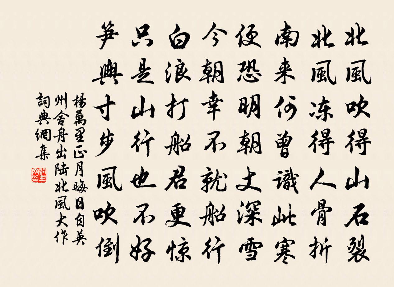 詩詞名句歷史字典書法欣賞書法字典國語詞典說文解字康熙字典古漢語字典標 題 作 者 詩 句 正月晦日,自英州舍舟出陸,北風大作作者:楊萬里 朝代:宋代原文北風吹得山石裂,北風凍得人骨折。南來何曾識此寒,便恐明朝丈深雪。今朝幸不就船行,白浪打船君更驚。只是山行也不好,筍輿寸步風吹倒。詩詞問答問:《正月晦日,自英州舍舟出陸,北風大作》的作者是誰?答:楊萬里問:該詩寫於哪個朝代?答:宋代問:楊萬里的名句有哪些?答:楊萬里名句大全書法欣賞正月晦日,自英州舍舟出陸,北風大作書法作品詩詞推薦千葉紅梨花歐陽修〔宋代〕紅梨千葉愛者誰,白髮郎官心好奇。徘徊繞樹不忍折,一日千匝看無時。夷陵寂寞千山里,地遠氣偏紅節異。愁煙次韻潘都乾菊花六首項安世〔宋代〕霜神亦有丰韻,未可尋常等夷。赤盡紅頭楓葉,卻能偏護花肌。勸農即事孟點〔宋代〕阡陌躬行謹邵農,平郊快馬蹴東風。土膏流潤雨初足,花錦喧晴春正中。旗陣折旋知路曲,樂聲遞響覺山空。長官隴頭水送別儲光羲〔唐代〕相送隴山頭,東西隴水流。從來心膽盛,今日為君愁。暗雪迷征路,寒雲隱戍樓。唯餘旌旆影,相逐去悠悠。因游支硎寺寄邢端公皎然〔唐代〕大廈資多士,掄材得豫章。清門推問望,早歲騁康莊。作用方開物,聲名久擅場。丹延分塞郡,宿昔領戎行。始馭菩薩蠻(新秋)李彌遜〔宋代〕涼飈輕散餘霞綺。疏星冷浸明河水。欹枕畫檐風。秋生草際蛩。雁門離塞晚。不道衡陽遠。歸恨隔重山。樓高莫憑扇詩張舜民〔宋代〕扇子解招風,本要熱時用。秋來掛壁間,卻被風吹動。次韻趙道夫待制放魚之作李彌遜〔宋代〕出門忽見腥城市,脫爾寧捐一粒貲。就使烹鮮真可口,誰能結網更臨池。斜風逆浪回頳尾,淺水平沙走素鰭。勿謂仲鹹借多海魚圖觀罷有詩因和王禹偁〔宋代〕偶費霜縑與彩毫,海魚圖畫滿波濤。搘床難死慚龜殼,把酒狂歌憶蟹螯。鯧蚱腳多垂似帶,鋸鯊齒密利如刀。何當宋永兄見和春懷再賦仍約秉彝兄尋春西郊黃公度〔宋代〕朱轂常懷蹉跌憂,蓽門長苦鬥升謀。此生幸不貧到骨,未死何妨酒入喉。北里人隨春漸老,西郊地與興俱幽。憑君始背洛城秋郊矚目奉懷台中諸侍御蘇味道〔唐代〕薄游忝霜署,直指戒冰心。荔浦方南紀,蘅皋暫北臨。山晴關塞斷,川暮廣城陰。場圃通圭甸,溝塍礙石林。野童和無盡居士牧牛頌釋子淳〔宋代〕頭角崢嶸未兆前,亂支深處任安眠。不隨芳草遙山去,何用芒童更著鞭。孟子仁不可為眾陳普〔宋代〕天下最強惟理義,英雄顛倒莫能為。依依一樓人心在,天命於斯自不違。長安春日章碣〔唐代〕春日皇家瑞景遲,東風無力雨微微。六宮羅綺同時泊,九陌煙花一樣飛。暖著柳絲金蕊重,冷開山翠雪棱稀。輸他薄媚 西子詞董穎〔宋代〕自笑平生,英氣凌雲,凜然萬里宣威。那知此際。熊虎塗窮,來伴麋鹿卑棲。既甘臣妾,猶不許,何為計。爭若都文宣王及其弟子贊宋高宗〔宋代〕文學之目,名重一時。為君子儒,作魏侯師。不要後禮,始可言詩。假蓋小嫌,聖亦不疵。次韻孔文仲舍人酴醾蘇轍〔宋代〕蒼蛇面凍不死,面輕素暖仍面歸。落蕊面時吹面,繁香自撲幃。光凝真照夜,枝軟或牽衣。似厭風霾苦,應思霧雨送嵩上人住庵釋正覺〔宋代〕禪腹須來竹篾纏,好看水牯自耕田。布單不賣三千里,樹耳誰疑二十年。一句合頭尊旅會,十方坐斷正偏圓。它時還司即事文天祥〔宋代〕幙燕方如寄,屠羊忽復旋。霜枝空獨立,雪窖已三遷。漂泊知何所,逍遙付自然。庭空誰共語,拄頰望青天。秋聲和鍾漕汝強四首胡寅〔宋代〕雲自高閒水自深,此間誰契不傳音。倦飛偶作歸田賦,高臥時為梁甫吟。為己宮牆當獨詣,過門車馬肯相臨。惟公名句推薦才道莫傷神,青衫濕一痕。納蘭性德《菩薩蠻·新寒中酒敲窗雨》 滿載一船秋色,平鋪十里湖光。張孝祥《西江月·阻風山峰下》 草春榮而冬枯,至於極枯,則又生矣王永彬《圍爐夜話·第六九則》 偶然值林叟,談笑無還期。王維《終南別業 / 初至山中 / 入山寄城中故人》 別有幽愁暗恨生,此時無聲勝有聲。白居易《琵琶行 / 琵琶引》 試問梅花何處好,與君藉草攜壺。張孝祥《臨江仙·試問梅花何處好》 露蓼香涇,記年時相識吳文英《尾犯·甲辰中秋》 玉露金風報素秋,穿針樓上獨含愁。德容《七夕二首·其一》 雨余溪水掠堤平,閒看村童謝晚晴。陸游《觀村童戲溪上》 燕子來時新社,梨花落後清明。晏殊《破陣子·春景》