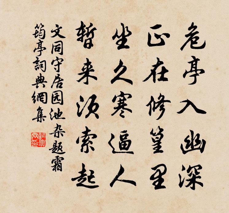 詩詞名句歷史字典書法欣賞書法字典國語詞典說文解字康熙字典古漢語字典標 題 作 者 詩 句 守居園池雜題霜筠亭作者:文同 朝代:宋代守居園池雜題霜筠亭原文危亭入幽深,正在修篁里。坐久寒逼人,暫來須索起。詩詞問答問:守居園池雜題霜筠亭的作者是誰?答:文同問:守居園池雜題霜筠亭寫於哪個朝代?答:宋代文同守居園池雜題霜筠亭書法欣賞守居園池雜題霜筠亭書法作品詩詞推薦了觀師繡觀音贊黃庭堅〔宋代〕六合內外,若有不觀音處。則此絲縷,不能堅固。橫此三十二應,共此一光明聚。了觀觀音,自知金針落處。知落送黃殿丞通判潤州梅堯臣〔宋代〕前年江州飛火龍,樓殿化盡山將熔。今聞榱棟復華壯,大閣渠渠出波上。南徐別乘簡且閒,下馬岸傍呼畫舫。永日湖陵與劉生別陳師道〔宋代〕觸寒歷險來特特,愧無以當欣有得。向來憂患不相舍,知子用心堅鐵石。人畏有心事無難,此語雖鄙理則然。君今和樂天以鏡換酒劉禹錫〔唐代〕把取菱花百鍊鏡,換他竹葉十旬杯。嚬眉厭老終難去,蘸甲須歡便到來。妍醜太分迷忌諱,松喬俱傲絕嫌猜。校量和虛齋勸農十詩鄭清之〔宋代〕迢遞層陰曉自開,仙丹花底問瀛萊。文章太守非游衍,為省春耕物地來。出邑劉黻〔宋代〕出邑欣逢友,不知三嶺遙。雲深山失樹,月上海生潮。縣小官租急,年荒酒戶銷。且尋僧舍泊,第一免喧囂。讀林逋魏野二處士詩陸游〔宋代〕君復仲先真隱淪,筆端亦自斡千鈞。閒中一句終難道,何況市朝名利人!臨安春雨初霽陸游〔宋代〕世味年來薄似紗,誰令騎馬客京華。小樓一夜聽春雨,深巷明朝賣杏花。矮紙斜行閒作草,晴窗細乳戲分茶。素衣三和項安世〔宋代〕老子於此不淺,先師教我資深。但使發乎情性,何愁嘔出肝心。擬白樂天題贈定光上人晃逈〔宋代〕孟子四十心不動,定光四十心離塵。我到明年加一倍,如何此際尚因循。已喜自逃名宦網,猶患長隨造化鈞。記得送尉侄劉克莊〔宋代〕忽有先驅至,相迎看武夷。尉尤去民近,汝勿嘆管卑。不必求三步,惟當戒四知。要令人刮眼,雲是挺之兒。招葉致遠王安石〔宋代〕白下長乾一水間,竹雲新筍已斑斑。明朝若有扁舟興,落日潮生尚可還。湘潭道中贈送丁碧眼相士文天祥〔宋代〕自詭衡山道士孫,至今句法有軒轅。世人未見題堯廟,盡把昌黎作寓言。收拾衡雲作羽衣,便如屈子遠遊歸。離騷客有折秋香來桂隱者喜成七言呈以道張鎡〔宋代〕半紀移居野水旁,年年嘗為木樨忙。若非老樹從頭髮,安得西風徹骨香。數朵折來猶甚愛,滿林開後得無狂。今番從子淮過省寄伯中弟樓鑰〔宋代〕我家伯父德餘輝,吾弟風標具體微。七葉欣聞五爭奮,四人先喜一雄飛。忍貧老尚甘簞食,教子今方擢省闈。他日啄木兒 啄木兒共五首,第一首前多出數句似王哲〔元代〕自知自知。只此分明是。自此自此。得一併無四。在虛空里。撒金蕊。萬道霞光通表里。復元初、見本始。要練正題畫四首唐寅〔明代〕烏柏經霜葉已紅,東南樓閣足秋風。畫成此景還堪詠,煉在先生短句中。次韻吉老十小詩黃庭堅〔宋代〕學似斲輪扁,詩如飯顆山。室中餘一劍,無氣鬥牛間。湖學別蘇召叟劉過〔宋代〕失學老無成,寧不心自慊。子聊生吾後,逸俟眼未見。委身入罏錘,顧此金百鍊。有如頑鈍質,豈可便磨劃。看君洞仙歌王安中〔宋代〕深庭夜寂,但涼蟾如晝。鵲起高槐露華透。聽曲樓玉管,吹徹伊州,金釧響,軋軋朱扉暗扣。迎人巧笑道,好個今名句推薦江南憶,最憶是杭州。白居易《憶江南詞三首》 君子欲訥於言而敏於行。孔子弟子《論語·里仁篇》 織婦何太忙,蠶經三臥行欲老。元稹《織婦詞》 浮雲柳絮無根蒂,天地闊遠隨飛揚。韓愈《聽穎師彈琴》 紅葉晚蕭蕭,長亭酒一瓢。許渾《秋日赴闕題潼關驛樓 / 行次潼關逢魏扶東歸》 天下有道則見,無道則隱。孔子弟子《論語·泰伯篇》 不知何歲月,得與爾同歸?韋承慶《南中詠雁詩》 惠遠祠前晉溪水,翠葉銀花清見底。元好問《過晉陽故城書事》 誰憐旅愁荏苒。謾長門夜悄,錦箏彈怨。張炎《解連環·孤雁》 聞之而不見,雖博必謬;見之而不知,雖識必妄;知之而不行,雖敦必困。荀子《荀子·儒效》