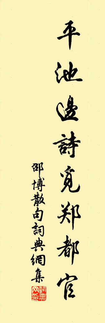 詩詞名句歷史字典書法欣賞書法字典國語詞典說文解字康熙字典古漢語字典標 題 作 者 詩 句 句作者:邵博 朝代:宋代句原文平池邊詩覓鄭都官。詩詞問答問:句的作者是誰?答:邵博問:句寫於哪個朝代?答:宋代邵博句書法欣賞句書法作品詩詞推薦梅花張問陶〔清代〕野鶴閒雲寄此生,暗香真到十分清。轉憐桃李無顏色,獨抱冰霜有性情。贈我詩難應束手,笑他人俗也知名。開遲和劉後村梅花百詠方蒙仲〔宋代〕彩葉如雲觀瑒蕊,金盆照日品桃花。安知尤物真瑰特,落在西湖處士家。挽銅里葉提點洪咨夔〔宋代〕養性居士白,用心承事黃。春風花竹墅,秋雨膾蓴鄉。簡淡趨真諦,廉平絜義方。志幽無長語,手墨粲琳琅。登城歌張鎡〔宋代〕二月二十八,花開滿林鶯恰恰。春光誰遣插翅飛,雪 * 知添鬢髮。暄風隨我登古城,遠樹如簇山如縈。一川渺瀰分韻送胡丈歸建安汪應辰〔宋代〕先生高臥武夷巔,一旦趨朝豈偶然。報國自期如皦日,歸田曾不待來年。懷鉛共嘆楊雄老,鞭馬今輸祖逖先。冊府新嫁娘詞三首王建〔唐代〕鄰家人未識,床上坐堆堆。郎來傍門戶,滿口索錢財。錦幛兩邊橫,遮掩侍娘行。遣郎鋪簟席,相併拜親情。三日滿庭芳 重陽真人升霞之前馬鈺〔元代〕重陽師父,遇呂真人。養成神內之神。心起慈悲不住,開闡良因。時時出神入夢,化人人、要出迷津。登州北,有荷花楊時〔宋代〕照眼紅雲斗晚霞,重重青蓋半傾斜。會須直跨三千仞,移取峰頭十丈花。橘二首趙與□〔宋代〕野色煙波外,西風橘柚香。湖光杳無際,山色忽深藏。塔古燈猶照,壇余灶已荒。何當蛻塵鞅,從此訪漁郎。鎖宿余半月得讀書喜而有賦程公許〔宋代〕日月疾跳丸,簡篇浩煙海。弓旌誤誘去,歡息可中悔。望京謠劉子翬〔宋代〕雙鑾窗北狩淹歸窗轂,寂寞窗梁園春草綠。猶傳故老守孤城,官軍不到黃河曲。遲雲樓櫓已灰爐,更倚窗扉防箭鏃早食鐵佛寺孔武仲〔宋代〕破壁題名滿,往還如置郵。山河萬里道,車馬片時休。白日初騰曉,涼蟬已喚秋。便添山野興,咫尺帝王州。房陵十首陳造〔宋代〕翁媼同圍老瓦盆,倒篘新酒雜清渾。梘南梘北皆春社,且放烏犍臥晏溫。寄終南真空禪師馬戴〔唐代〕閒想白雲外,瞭然清淨僧。松門山半寺,夜雨佛前燈。此境可長住,浮生自不能。一從林下別,瀑布幾成冰?瑣窗寒楊無咎〔宋代〕柳暗藏鴉,花深見蝶,物華如繡。情多思遠,又是一番清瘦。憶前回、庭榭來春,個人預約同攜手。恨遲留,載酒辛酉大雪戲成二詩以千山鳥飛絕萬逕人蹤滅為周麟之〔宋代〕舊聞沙漠寒,磧鹵一丈雪。誰憐牧羝人,白首持漢節。朝延背顧憂,歲晚不忍說。寄言上林雁,何事音信絕。登樓歌王維〔唐代〕聊上君兮高樓,飛甍鱗次兮在下。俯十二兮通衢,綠槐參差兮車馬。卻瞻兮龍首,前眺兮宜春。王畿郁兮千里,山洞仙歌 辛巳歲燕城初度張翥〔元代〕功名利達,任紛紛奔競。縱使得來也僥倖。老眼看多時,鐘鼎山林,須信道、造物安排有命。人生行樂耳,對月臨送盧山人二首楊萬里〔宋代〕有欠牛眠子為尋,剩將朽胔換華簪。家阡只免牛羊到,此外窮通得上心。踏雲行 贈楊德遠王丹桂〔元代〕道號安閒,法名德遠。法名道號開方便。安閒常要性逍遙,悟其德遠歸真善。外貌如愚,內通修煉。下功進火猶爭名句推薦人間有味是清歡。蘇軾《浣溪沙·細雨斜風作曉寒》 幼敏悟過人,讀書輒成誦。歐陽修《畫地學書》 名不徒生,而譽不自長。功成名遂。墨子《墨子·02章 修身》 黃雲萬里動風色,白波九道流雪山。李白《廬山謠寄盧侍御虛舟》 枕前何事最傷情?梧桐葉上,點點露珠零。尹鶚《臨江仙·深秋寒夜銀河靜》 烽火平安夜,歸夢到家山。崔與之《水調歌頭·題劍閣》 年來腸斷秣陵舟,夢繞秦淮水上樓王士禎《秦淮雜詩二十首·其一》 芳樹籠秦棧,春流繞蜀城。李白《送友人入蜀》 問世間,情是何物,直教生死相許?元好問《摸魚兒·雁丘詞 / 邁陂塘》 月出驚山鳥,時鳴春澗中。王維《鳥鳴澗》
