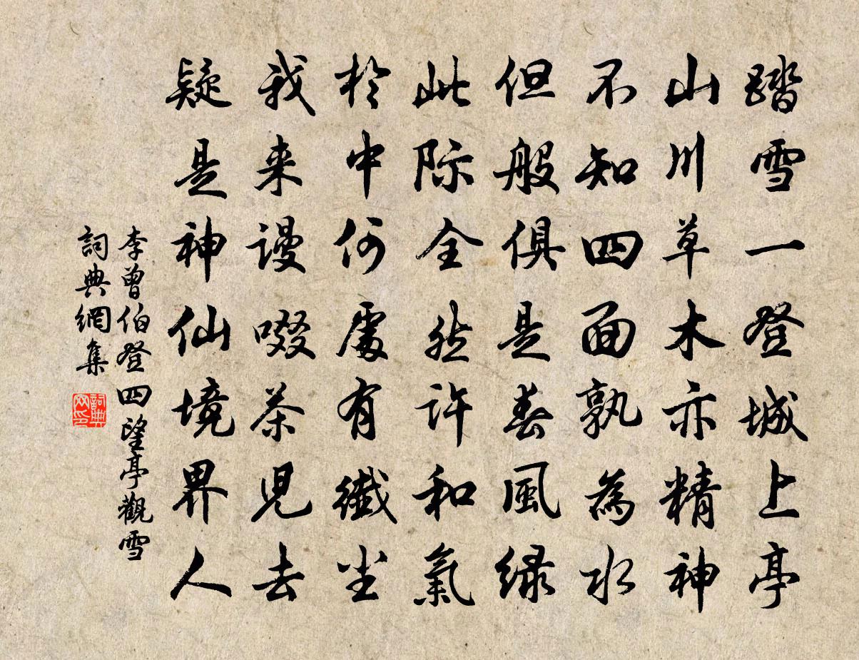 詩詞名句歷史字典書法欣賞書法字典國語詞典說文解字康熙字典古漢語字典標 題 作 者 詩 句 登四望亭觀雪作者:李曾伯 朝代:宋代登四望亭觀雪原文踏雪一登城上亭,山川草木亦精神。不知四面孰為水,但般俱是春風綠。此際全然許和氣,於中何處有纖塵。我來謾啜茶兒去,疑是神仙境界人。詩詞問答問:登四望亭觀雪的作者是誰?答:李曾伯問:登四望亭觀雪寫於哪個朝代?答:宋代李曾伯登四望亭觀雪書法欣賞登四望亭觀雪書法作品詩詞推薦野飲仇遠〔宋代〕土岡之西,竹樹之下。板屋三間,娛此隱者。塒有肥雞,廏有羸馬。豈無佳菊,采不盈把。且漉我酒,放浪林野。和簡文帝賽漢高帝廟詩徐陵〔南北朝〕山宮類牛首。漢寢若龍川。玉盌無秋酎。金燈滅夜煙。丹帷迫靈岳。紺席下羣仙。堂虛沛築響。釵低戚舞妍。何殊和子瞻沿牒京口憶西湖寒食出遊見寄二首陳襄〔宋代〕春陰漠漠燕飛飛,可惜春光與子違。半嶺煙霞紅旆入,滿湖風月畫船歸。緱笙一闋人何在,遼鶴重來事已非。猶憶許州留別頓主簿蘇轍〔宋代〕洛寺相從不出門,繞城空復記名園。程文堆案晨興早,竹簞連床夜雨喧。歸路逢僧暫容與,登山無力強扳援。遙知辨才少白師歸天台宋祁〔宋代〕壤色擁行肩,南方應有緣。歸艎素車浪,寶戺赤城天。宴樹春園密,談花畫祴鮮。憑師無閡智,呵黜二宗禪。贈續芸朱繼芳〔宋代〕誰謂芸居死,余香解返魂。六丁將不去,孤子續猶存。科斗三生債,蟫魚再世冤。向來詩作祟,揮涕對人言。送王恪郎中知襄州蘇轍〔宋代〕魏公德業冠當年,汝守威名竦漢邊。將相傳家俱未遠,子孫到處各推賢。風流最喜君真似,符竹連分政得專。峴首涿州王安石〔宋代〕涿州沙上望桑乾,鞍馬春風特地寒。萬里如今持漢節,卻尋此路使呼韓。偈二首釋文禮〔宋代〕此力分明在不欺,不欺能有幾人知。要明象兔全提句,看取升階正笏時。比梅/如夢令張輯〔宋代〕深夜沉沉尊酒。酒醒客衾寒透。城角挾霜飛,吹得月如清晝。僝僽。僝僽。比著梅花誰瘦。和清叟奉御大都陳普〔宋代〕帝里春深草木苞,御河滾滾浪翻桃。萬千紅紫跡如掃,九十青皇壽已高。南國江山歸夢遠,東宮松桂書陰交。丘園輦下贈屯田何員外徐夤〔唐代〕封章頻得帝咨嗟,報國唯將直破邪。身到西山書幾達,官登南省鬢初華。廚非寒食還無火,菊待重陽擬泛茶。內翰高宗皇帝輓詞五首宋孝宗〔宋代〕揖遜光堯德,重華愧有虞。居然將菲質,正爾紹皇圖。履燾兼君父,文明炤典謨。大恩渾未報,血淚一時俱。橋西劉克莊〔宋代〕昔飲橋西歲月多,梨花深處待郎過。垂鞭欲訪湔裙約,奈此蕭蕭鬢雪何。和蒲左丞有美座上觀雪二首陳師道〔宋代〕破曉初驚失舊山,瑤台化出坐中寒。江心凍合愁蛟蜃,匣里冰生吼鏌千。門閉洛陽人跡絕,指穿東郭履痕乾。鳳池山居三首廖行之〔宋代〕貴賤孰欣孰戚,窮通何損何加。成毀舉同墮甑,妍媸不屬鉛華。離亂後寄九峰和尚二首貫休〔唐代〕亂後知深隱,庵應近石樓。異香因雪歇,仙果落池浮。詩老全拋格,心空未到頭。還應嫌笑我,世路獨悠悠。蕭灑立春日雪和趙端質韻王之道〔宋代〕春寒有信不逾期,肯為衰顏獨見欺。白雪已輸梅斗早,綠樽尤與火相宜。擷來野蔌和萱草,分得江魚貫柳枝。刺史贈方山人二首吳芾〔宋代〕故山久已辦菟裘,得去欣聞止在秋。涉世安能長戚戚,收心只欲罷休休。次王巡檢韻三首陳造〔宋代〕每愧銅盤走柘丸,忽驚檀軸卷絲闌。真成敝帚千金享,笑喚諸雛掛壁看。名句推薦一朵江梅春帶雪。玉軟雲嬌,姑射肌膚潔。趙鼎《蝶戀花·一朵江梅春帶雪》 臣子恨,何時滅!駕長車,踏破賀蘭山缺。岳飛《滿江紅·寫懷》 滿園花菊鬱金黃,中有孤叢色似霜。白居易《重陽席上賦白菊》 萬里雲間戍,立馬劍門關。崔與之《水調歌頭·題劍閣》 亂則國危,治則國安。荀子《荀子·王霸》 砌下落花風起,羅衣特地春寒。馮延巳《清平樂·雨晴煙晚》 見肝之病,知肝傳脾,當先實脾張仲景《金匱要略·卷上·藏府經絡先後病脈證一》 青山如黛遠村東,嫩綠長溪柳絮風。高珩《春日雜詠》 漠漠帆來重,冥冥鳥去遲。韋應物《賦得暮雨送李胄 / 賦得暮雨送李曹》 漫惹爐煙雙袖紫,空將酒暈一衫青。納蘭性德《浣溪沙·伏雨朝寒愁不勝》