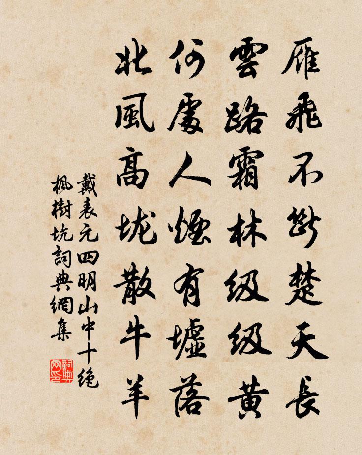 詩詞名句歷史字典書法欣賞書法字典國語詞典說文解字康熙字典古漢語字典標 題 作 者 詩 句 四明山中十絕楓樹坑作者:戴表元 朝代:宋代四明山中十絕楓樹坑原文雁飛不斷楚天長,雲路霜林級級黃。何處人煙有墟落,北風高壠散牛羊。詩詞問答問:四明山中十絕楓樹坑的作者是誰?答:戴表元問:四明山中十絕楓樹坑寫於哪個朝代?答:宋代戴表元四明山中十絕楓樹坑書法欣賞四明山中十絕楓樹坑書法作品詩詞推薦題惠崇小景扇二首吳則禮〔宋代〕惠崇桃塢鵝鴨,春老不畫風煙。看取團團璧月,中吞萬里江天。挽鬍子瑞孫應時〔宋代〕三十年間事,論交踵父兄。叩門時下榻,話舊各傷情。我亦華雙鬢,君仍隔九京。滯留違一慟,腸斷暮雲橫。李延年歌李延年〔兩漢〕北方有佳人。絕世而獨立。一顧傾人城。再顧傾人國。寧不知傾城與傾國。佳人難再得。居延汪元量〔宋代〕憶昔蘇子卿,持節入異域。淹留十九年,風霜毒顏色。齧氈曾牧羝,跣足涉沙磧。日夕思漢君,恨不生羽翼。一朝餞江東繡使庸齋趙玉堂二首徐元傑〔宋代〕天上玉堂辭寵榮,卻持玉節按江城。惟刑之恤民不悅,不怒而威吏膽驚。有腳春來陶化日,無心雲出雨蒼生。箇中春行賈島〔唐代〕去去行人遠,塵隨馬不窮。旅情斜日後,春色早煙中。流水穿空館,閒花發故宮。舊鄉千里思,池上綠楊風。九日同王月溪訪紫陽有詩次韻楊公遠〔宋代〕西風淒緊未成霜,拄杖橫拖訪紫陽。繞郭溪山千古勝,泛杯萸菊一時香。鬢邊有雪身還健,筆底無塵句不狂。佳節詠衡岳禹柏李曾伯〔宋代〕我來衡山下,古梵見老柏。森然星野分,亶有神明力。風霜飽更練,雨露富培埴。岳靈共長久,造化與訊息。本盛寄黃子耕趙蕃〔宋代〕野寺已黃昏,高軒辱過門。交遊夫豈乏,情義獨能敦。我已家聲愧,君今風氣存。一官何未試,多雞亦成屯。詩本寄袁州陳智周沈廷瑞〔唐代〕名山相別後,別後會難期。金鼎銷紅日,丹田老紫芝。訪君雖有路,懷我豈無詩。休羨繁華事,百年能幾時。張生示予詠菊詩且古之作者遲晚之意頗同體狀魏野〔宋代〕正當搖落獨芳妍,向晚吟看露泫然。還似六宮人競怨,幾多珠淚濕金鈿。春晝醉眠劉兼〔唐代〕朱欄芳草綠纖纖,攲枕高堂卷畫簾。處處落花春寂寂,時時中酒病懨懨。塞鴻信斷雖堪訝,梁燕詞多且莫嫌。自有病起荊江亭即事十首黃庭堅〔宋代〕翰墨場中老伏波,菩提坊里病維摩。近人積水無鷗鷺,時有歸牛浮鼻過。菩薩蠻·人人盡說江南好韋莊〔唐代〕人人盡說江南好,遊人只合江南老。春水碧於天,畫船聽雨眠。壚邊人似月,皓腕凝霜雪。未老莫還鄉,還鄉須斷燕巢洪咨夔〔宋代〕華堂橫架晴虹壯,來鳳結巢長一丈。中間贔屓譙樓勢,兩旁坡陀翼城樣。相攸爾居莫此樂,得意鳴聲相下上。同時送台州沈虞卿使君入朝孫應時〔宋代〕東南數十州,今惟本根地。因乃軍國須,支吾亦良費。簿書高沒人,大率非古意。先生海邦來,歷歷眼中事。誠心戲作野興陸游〔宋代〕擾擾亭中客,悠悠局上棋。所遭元有命,自苦竟何為?馮衍深尤婦,陶潛過責兒。奇文雖可貴,寱語豈非痴。採桑子·荷花開後西湖好歐陽修〔宋代〕荷花開後西湖好,載酒來時。不用旌旗,前後紅幢綠蓋隨。畫船撐入花深處,香泛金卮。煙雨微微,一片笙歌醉里長相思·長相思晏幾道〔宋代〕長相思,長相思,若問相思甚了期。除非相見時。長相思,長相思,欲把相思說似誰。淺情人不知。劉裸卿送筍章甫〔宋代〕俗子貪錢如食蜜,幽人愛竹如種玉。君家大隱城一隅,萬個深圍數間屋。陽春不住長兒孫,犢角貓頭還滿目。卻恐名句推薦年方少,勿飲酒。飲酒醉,最為醜。李毓秀《弟子規·謹》 日長籬落無人過,惟有蜻蜓蛺蝶飛。范成大《四時田園雜興·其二》 鎖離愁,連綿無際,來時陌上初熏。韓縝《鳳簫吟·鎖離愁》 路遙知馬力,日久見人心。佚名《增廣賢文·上集》 呼兒將出換美酒,與爾同銷萬古愁。李白《將進酒》 西風多少恨,吹不散眉彎。納蘭性德《臨江仙·寒柳》 莫信直中直,須防仁不仁。佚名《增廣賢文·上集》 黃河之水天上來,奔流到海不復回。李白《將進酒》 仍憐故鄉水,萬里送行舟。李白《渡荊門送別》 老圃好栽培,菊花五月開。顧太清《菩薩蠻·端午日詠盆中菊》
