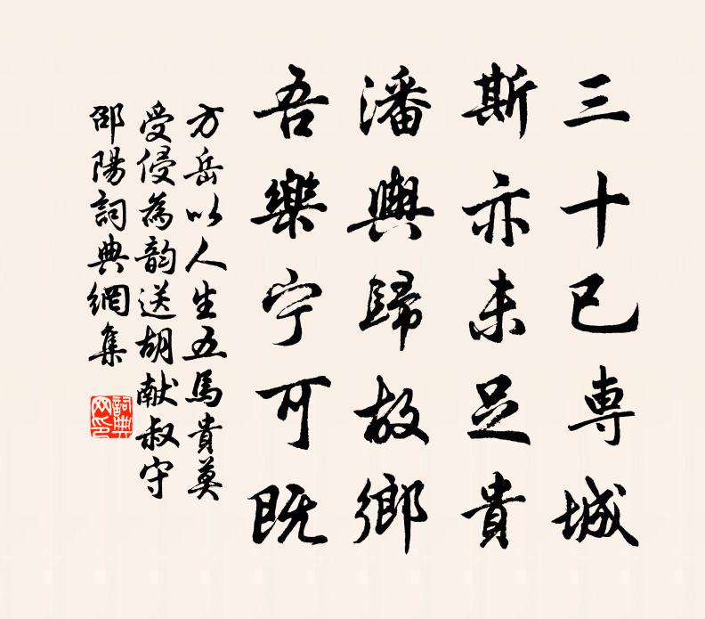 詩詞名句歷史字典書法欣賞書法字典國語詞典說文解字康熙字典古漢語字典標 題 作 者 詩 句 以人生五馬貴莫受侵為韻送胡獻叔守邵陽作者:方岳 朝代:宋代原文三十已專城,斯亦未足貴。潘輿歸故鄉,吾樂寧可既。詩詞問答問:《以人生五馬貴莫受侵為韻送胡獻叔守邵陽》的作者是誰?答:方岳問:該詩寫於哪個朝代?答:宋代書法欣賞以人生五馬貴莫受侵為韻送胡獻叔守邵陽書法作品詩詞推薦到任交權州事筵致語口號陳造〔宋代〕假印侯封付繼承,教條久已洽山城。政成何異徵黃霸,日接寧惟拜水衡。春酒入杯紅浪漲,晚花薦座靚妝明。良辰石城館酬王將軍郎士元〔唐代〕誰能繡衣客,肯駐木蘭舟。連雁沙邊至,孤城江上秋。歸帆背南浦,楚塞入西樓。何處看離思,滄波日夜流。金蓮出玉花 自述丘處機〔元代〕蓬頭垢面。不管形骸貧與賤。抱朴頤神。恬淡無憂樂本真。冰姿玉體。到了難趨沉土底。子羽潘安。泉下骷髏總一和子瞻次韻陶淵明勸農詩蘇轍〔宋代〕我歸無時,視汝長久。孰為沮溺,風雨相耦。築室車皋,取足南畝。后稷為烈,夫豈一手。宴齊雲/南歌子賀鑄〔宋代〕境跨三千里,樓侵尺五天。碧鴛鴦瓦晝生煙。未信西山台觀、壓當年。野色分禾黍,秋聲入管弦。閒揮彈麈襞吟箋鷓鴣天向子諲〔宋代〕召埭初逢兩妙年。遙林玉樹倚風前。疏梅影里春同醉,紅芰香中月一船。長悵恨,短因緣。空餘蝴蝶夢相連。誰知哭崖山文天祥〔宋代〕寶藏如山席六宗,樓船千疊水晶宮。吳兒進退尋常事,漢氏存亡頃刻中。諸老丹心付流水,孤臣血淚灑南風。早來賦向伯共五老小山六言五絕胡寅〔宋代〕頭法想應得髓,好奇那復忘疲。此石未同瓦礫,耆年直是兒嬉。醉蓬萊(重明節丙辰長汝)趙師俠〔宋代〕正金風零露,玉宇生涼,晚秋天氣。華渚流虹,應生商佳瑞。電繞神樞,慶綿宗社,御寶圖宸極。脫屣塵凡,游心偈頌一百零一首釋慧性〔宋代〕方挹新春,又迎朱夏。山不為高,水下為下。梅雨連綿,虛空貼卦。浸爛石鳥龜,黃梅添話欛。鳥牙峰頂浪滔天,中秋京師對月強至〔宋代〕今夜皇州月,秋光共幾分。未全成皓魄,猶勝隔浮雲。白髮愁偏照,清樽喜獨醺。遙憐江國弟,北望首殷勤。寒食懷公藻幾道陳棣〔宋代〕灑落陶彭澤,風流陳太丘。別來添夕夢,歸日負春遊。已改枯榆火,寧污寒具油。不知行樂地,能話野人不。柳梢青蔡伸〔宋代〕數聲鶗鴂。可憐又是,春歸時節。滿院東風,海棠鋪繡,梨花飄雪。丁香露泣殘枝,算未比、愁腸寸結。自是休文病中酬趙季茂岳珂〔宋代〕雪窗病惱獨支頤,不解隨人舉酒卮。驚辨有時欺白羽,解圍無婦蔽青絲。驪珠滿袖勾吟興,鹿氅看山戀藥糜。莫訝字說一首劉克莊〔宋代〕半山字說行,精義極貫穿。世好鴉蚓書,誰識蟲魚篆。【中呂】朝天子_箏手愛卿丹張可久〔元代〕箏手愛卿丹山鳳鳴,黃雲雁影,笙歌罷簾幃靜。纖纖香玉扣紅冰,一曲伊川令。院體瓊瓊,秋水盈盈,不由人不愛寄吳明輔秘丞戴復古〔宋代〕吾鄉幸有吳夫子,星斗網羅文字胸。百鳥收聲聽鳴鳳,千山落木秀孤松。旁通滄海江山水,高壓雲城帢幘峰。每見題徑山大覺禪師影堂張祜〔唐代〕超然彼岸人,一徑謝微塵。見相即非相,觀身豈是身。空門性未滅,舊里化猶新。謾指堂中影,誰言影似真。次韻和禮部盧侍郎(一作郎中,一本又多一極字)鄭谷〔唐代〕盧郎到處覺風生,蜀郡留連亞相情。亂後江山悲庾信,夜來煙月屬袁宏。夢歸蘭省寒星動,吟向莎洲宿鷺驚。未脫子產不毀鄉校頌韓愈〔唐代〕我思古人,伊鄭之僑。以禮相國,人未安其教;游於鄉之校,眾口囂囂。或謂子產:“毀鄉校則止。”曰:“何患名句推薦況是清明好天氣,不妨游衍莫忘歸。程顥《郊行即事》 發短愁催白,顏衰酒借紅。陳師道《除夜對酒贈少章》 長堤春水綠悠悠,畎入漳河一道流。王之渙《宴詞》 空山松子落,幽人應未眠。韋應物《秋夜寄邱員外 / 秋夜寄丘二十二員外》 澗影見松竹,潭香聞芰荷。孟浩然《夏日浮舟過陳大水亭 / 浮舟過滕逸人別業》 洛陽城東西,長作經時別。范雲《別詩》 何日平胡虜,良人罷遠征。李白《子夜吳歌·秋歌》 還將兩行淚,遙寄海西頭。孟浩然《宿桐廬江寄廣陵舊遊》 美人慵翦上元燈,彈淚倚瑤瑟。朱敦儒《好事近·春雨細如塵》 提籠忘采葉,昨夜夢漁陽。張仲素《春閨思》