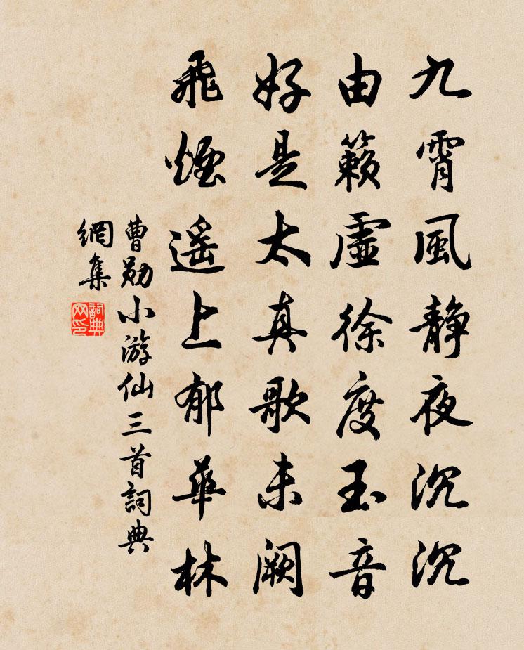 詩詞名句歷史字典書法欣賞書法字典國語詞典說文解字康熙字典古漢語字典標 題 作 者 詩 句 小遊仙三首作者:曹勛 朝代:宋代小遊仙三首原文九霄風靜夜沉沉,由籟虛徐度玉音。好是太真歌未闕,飛煙遙上郁華林。詩詞問答問:小遊仙三首的作者是誰?答:曹勛問:小遊仙三首寫於哪個朝代?答:宋代曹勛小遊仙三首書法欣賞小遊仙三首書法作品詩詞推薦【雙調】河西六娘子佚名〔元代〕駿馬雙翻碧玉蹄,青絲黃金羈,入秦樓將在垂楊下系。花壓帽檐低,風透繡羅衣,裊吟鞭月下歸。寄題鄭尚明煮茶軒三首劉子翬〔宋代〕一點春回枯卉,萬家譟動寒墟。鳳餅龍團玉食,傷心半入穹廬。任適尉烏程梅堯臣〔宋代〕俛作程鄉尉,折腰還自甘。卞峰晴照黛,霅水曉澄藍。葑上春田辟,蘆中走吏參。到時苹葉長,柳惲在江南。贈張琪君章晃沖之〔宋代〕春風頗清識,評議登草木。燕麥與菟葵,種種承標目。如何桃李姿,結根滯空谷。我將俎豆之,折泄恐不欲。君且乳燕飛/賀新郎佚名〔宋代〕指點金蕉葉。倩雙成、十分為注,九天瓊液。中有玉梅風露氣,持壽卯金仙伯。聽賤子、歌翻新闋。不作尋常兒女句陳堯佐〔宋代〕供帳開天苑,傳呼度國門。呂宣徽輓歌二首司馬光〔宋代〕奕世台衡貴,盈門拔冕榮。遐方流惠化,殊俗讋威聲。宥密資忠力,安平寄老成。遽騎箕尾去,何以慰蒼生。詠月喻良能〔宋代〕何年玉斧巧修成,半似明生半魄生。易使飛烏來匝繞,難將老蚌較虧盈。宴興化池亭送白二十二東歸聯句裴度〔唐代〕東洛言歸去,西園告別來。白頭青眼客,池上手中杯。 ——裴度離瑟殷勤奏,仙舟委曲回。征輪戲城中故人王安石〔宋代〕城郭山林路半分,君家塵土我家雲。莫吹塵土來污我,我自有雲持寄君。脫窗間蜂有感二首錢時〔宋代〕病體今朝尚怯風,北窗深坐思融融。莫言袖手無勳業,頃刻窗間救十蜂。頌七賢女游屍陀林釋文禮〔宋代〕七珍八寶任君需,三物從來的是無。若向無中拈得出,不須見佛問何知。送廣州劉叔治倅欽州兼守事樂雷發〔宋代〕天涯亭較擁提屏,丹荔黃柑滿去程。皂蓋卻迎新別駕,碧幢應憶老先生。象蹄印雨歸蠻國,鯨鬣掀潮撼海城。曾是朝梳怨曹彥約〔宋代〕朝梳和疊雲,到暮不成雨。一日變千絲,只作愁機杼。愁至雲成幕,小雨和絲落。愁去臉成霞,雨霽庭下花。折花觀採茶作歌乾隆〔清代〕前日餅采餅我不喜,率緣供覽官經理;今日采餅我愛觀,吳民生計勤自然。雲棲取近跋山路,都非吏備清蹕處,無十二時行孝文白居易〔唐代〕食時辰,居家治務最須懃。無事等閒莫外宿,歸來勞費父嫌憎。簡陳監倉二首張鎡〔宋代〕自到南湖日,鄰翁識長方。一官甘寂寞,萬事絕思量。疎見只緣懶,頻來政不妨。松林渾似舊,相伴踞胡床。九日書懷王冕〔元代〕玉露霏涼木漸酡,每逢佳節惜年華。青山疊疊多歸夢,白髮蕭蕭不在家。觸景漫思千古事,無錢空對一籬花。相知耘村麥熟朱翌〔宋代〕君不見五經紛綸井大春,不得已見陰將軍。將軍故為設麥飯,推去去不食言非誠。又不見劉懷慰作齊太守,簾吏籍上王侯重九前蠲不濟寺債陳宓〔宋代〕史君救弊知原本,民賴浮屠產力寬。保障便為今日計,功名留與百年看。喜聞白紙租都放,不飲黃花酒亦歡。晨起名句推薦何處它年寄此生,山中江上總關情。虞集《院中獨坐》 不虛美,不隱惡司馬光《資治通鑑·唐紀·唐紀十三》 淡薄之士,必為濃艷者所疑洪應明《菜根譚·概論》 榮所眾羨,亦引眾怨。來俊臣《羅織經·固榮卷第六》 霖雨泥我塗,流潦浩縱橫。曹植《贈白馬王彪·並序》 幸於始者怠於終,繕其辭者嗜其利。曹雪芹《紅樓夢·第五十六回》 時霎清明,載花不過西園路。吳文英《點絳唇·時霎清明》 低頭獨長嘆,此嘆無人喻。白居易《買花 / 牡丹》 身後有餘忘縮手,眼前無路想回頭。曹雪芹《紅樓夢·第二回》 腳踏車欲問邊,屬國過居延。王維《使至塞上》