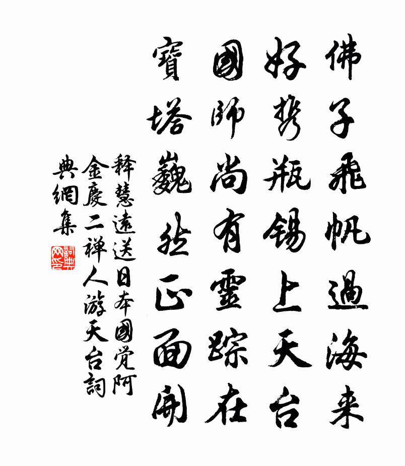 詩詞名句歷史字典書法欣賞書法字典國語詞典說文解字康熙字典古漢語字典標 題 作 者 詩 句 送日本國覺阿金慶二禪人游天台作者:釋慧遠 朝代:宋代原文佛子飛帆過海來,好攜瓶錫上天台。國師尚有靈蹤在,寶塔巍然正面開。詩詞問答問:《送日本國覺阿金慶二禪人游天台》的作者是誰?答:釋慧遠問:該詩寫於哪個朝代?答:宋代書法欣賞送日本國覺阿金慶二禪人游天台書法作品詩詞推薦碧瓦李商隱〔唐代〕碧瓦銜珠樹,紅輪結綺寮。無雙漢殿鬢,第一楚宮腰。霧唾香難盡,珠啼冷易銷。歌從雍門學,酒是蜀城燒。柳暗詩一首胡銓〔宋代〕夜讀文公猛虎詩,云何虎死忽悲啼。人生未省向來事,虎死方羞前所為。昨日猶能食熊豹,今朝無計奈狐狸。我曾梅花喜神譜爛熳二十八枝宋伯仁〔宋代〕繒殼爛緗枝,夏果收新綠。玉真望甘鮮,不管郵兵哭。定林寺家之巽〔宋代〕老屋三門山徑幽,中藏無限古今愁。新詩吟罷春雲合,塔里金仙笑點頭。田家留客王建〔唐代〕人家少能留我屋,客有新漿馬有粟。遠行僮僕應苦飢,新婦廚中炊欲熟。不嫌田家破門戶,蠶房新泥無風土。行人還余朝綱雜編陳棣〔宋代〕胸中渾渾乏新奇,虛辱熊羆百萬師。較藝昔嘗窮五技,還書今復墮三痴。退飛頗愧一為甚,盡銳那知再愈衰。自計觀仲靈久雨詩且道余與公濟吟從之意輒次韻奉強至〔宋代〕吟思那知歲月新,初鶯啼雨早經旬。娟娟野竹通寒水,洗洗江梅冷照人。鷲嶺並游勞夢寐,虎溪一笑尚參辰。千金寄趙景周撫乾二首洪咨夔〔宋代〕罨畫春樹碧,逢迎系行舟。酒盡可以起,更作須臾留。我方鶴投籠,君已鷹脫鞲。相期在歲晏,贈之珊瑚鉤。是夕雨大作復呈潘提舉趙蕃〔宋代〕雲行方陸離,月出重蔽虧。旋聽隱其響,已見沛然馳。信有誰能御,那雲鼓再衰。天瓢快傾瀉,旱魃勇鞭笞。臥想戊午生朝和居厚弟五絕劉克莊〔宋代〕□□□□□□□,□□□□□□□。□□□□□□從,晚福全輸於少公。玉蓮堂董嗣杲〔宋代〕仙根曾就華峰移,淨引湘波出浴妃。龍護先皇三字在,燕居舊尹一清非。風檐搖影涼姿媚,月檻 * 冷艷肥。平展代小子廣孫寄翁翁孔平仲〔宋代〕爹爹來密州,再歲得兩子。牙兒秀且厚,鄭鄭已生齒。翁翁尚未見,既見想歡喜。廣孫讀書多,寫字輒兩紙。三三冬日登江樓孟貫〔唐代〕高樓臨古岸,野步晚來登。江水因寒落,山云為雪凝。遠村雖入望,危檻不堪憑。親老未歸去,鄉愁徒自興。又口占小詩五首李壁〔宋代〕四海同心閻貳卿,兩公相對眼長青。從今太史靈台夜,定奏梁州聚德星。以魯直露溼何郎試湯餅為韻賦酴醿七首舒邦佐〔宋代〕倚窗春睡覺,折玉滿手香。篸雲疑未穩,指點問檀郎。書黃筌畫《翎毛花蝶圖》二首蘇軾〔宋代〕綠陰青子已愁人,忍見中庭燕麥新。怊悵劉郎今白首,時來看卷覓余春。寄盧子高二首蘇泂〔宋代〕我別君逾壯,君來我欲翁。艱虞疇昔異,風雨數宵同。鶴病只應瘦,鷹飢怕苦籠。平生黃叔度,見可俗塵空。山甫病中歸峽作此問之舒岳祥〔宋代〕山甫病歸峽,僧言藥有瘳。自憐三歲長,多白幾分頭。水鳥工吟夜,陰蛩苦話秋。詩人多病瘧,強飯更何憂。春晚渡河有懷羅鄴〔唐代〕煙收綠野遠連空,戍壘依稀入望中。萬里山河星拱北,百年人事水歸東。扁舟晚濟桃花浪,走馬晴嘶柳絮風。鄉思東窗遣興陸游〔宋代〕夏淺清陰滿,村深白日長。言多思寂默,酒醒悔猖狂。老馬漫知路,鈍錐寧出囊?此翁真耄矣,嬾於亦何傷?名句推薦春風只在園西畔。薺菜花繁胡蝶亂。嚴仁《玉樓春·春思》 柏府樓台銜倒影,茅茨松竹瀉寒聲。王守仁《次韻陸僉憲元日春晴》 差若毫釐,謬以千里。魏收《魏書·列傳·卷六十六》 越鳥巢乾後,歸飛體更輕。李商隱《晚晴》 蛺蝶飛來過牆去,卻疑春色在鄰家。王駕《雨晴》 君子,不可以不修身。思修身,不可以不事親。思事親,不可以不知人。思知人,不可以不知天。子思《中庸·第二十章》 兩岸猿聲啼不住,輕舟已過萬重山李白《早發白帝城/白帝下江陵》 臨官莫如平,臨財莫如廉。劉向《說苑·政理》 從臣皆半醉,天子正無愁。李商隱《陳後宮》 但恨處非位,愴悢使心傷。阮籍《詠懷八十二首·其七十九》
