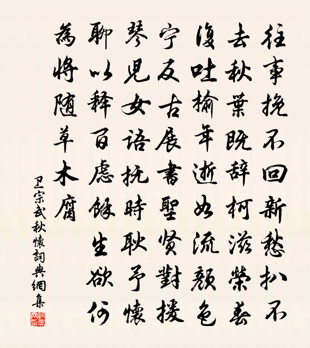 詩詞名句歷史字典書法欣賞書法字典國語詞典說文解字康熙字典古漢語字典標 題 作 者 詩 句 秋懷作者:衛宗武 朝代:宋代秋懷原文往事挽不回,新愁扒不去。秋葉既辭柯,滋榮春復吐。榆年逝如流,顏色寧反古。展書聖賢對,援琴兒女語。撫時耿予懷,聊以釋百慮。餘生欲何為,將隨草木腐。詩詞問答問:秋懷的作者是誰?答:衛宗武問:秋懷寫於哪個朝代?答:宋代衛宗武秋懷書法欣賞秋懷書法作品詩詞推薦石榴花丘葵〔宋代〕莫峙而匪山,莫流而匪川。人生有懿德,萬性同此天。雲胡不自責,聽此六賊牽。蒼梧雲氣項斯〔唐代〕何年化作愁,漠漠便難收。數點山能遠,平鋪水不流。濕連湘竹暮,濃蓋舜墳秋。亦有思歸客,看來盡白頭。訪李國器於包山同登寺後山庵樓鑰〔宋代〕訪客包家山,相與登層顛。嶙峋巨石中,屈曲扶欄乾。夜來雨初過,石罅時涓涓。輕輿到岡頭,大江橫吾前。亭午寄克齋舅氏趙蕃〔宋代〕不幸書題遂一年,書猶斷絕況詩傳。興來亦復吟喔否,讀罷何當疾痼痊。慷慨初無伏波志,憂愁枉類屈原遷。使來卜運算元陳三聘〔宋代〕雪後竹枝風,醉夢風吹醒。瘦立寒階滿地春,淡月梅花影。門外轆轤寒,曉汲喧金井。長笛何人更倚樓,玉指風前頌一百則釋重顯〔宋代〕劫火光中立問端,衲僧猶滯兩重關。可憐一句隨他語,萬里區區獨往還。養竹記白居易〔唐代〕 竹似賢,何哉?竹本固,固以樹德,君子見其本,則思善建不拔者。竹性直,直以立身;君子見其性,則思中記夢陸游〔宋代〕夢不出心境,曠然成遠遊。花殘杜城醉,木落華山秋。戰血磨長劍,塵痕洗故裘。那知覺來處,身臥五湖舟。雪中憶昔五首方回〔宋代〕憶昔繁華侶俊游,寧知後死掛閒愁。無人復唱魚兒曲,何處重尋燕子樓。張敞空思前漢尹,邵平誰識故秦侯。定應奉和人日清暉閣宴群臣遇雪應制宗楚客〔唐代〕窈窕神仙閣,參差雲漢間。九重中葉啟,七日早春還。太液天為水,蓬萊雪作山。今朝上林樹,無處不堪攀。登樓晚望華岳〔宋代〕六曲朱闌瞰碧虛,淡煙秋水接平蕪。展開風月添詩料,裝點江山歸畫圖。舉足便堪馳駟馬,折腰何必問雙鳧。當年病起掇黃花數本焚香清坐二首錢時〔宋代〕秋風鵰鶚刷天涯,有底男兒只戀家。病後暫收文字眼,焚香清坐看黃花。【越調】憑闌人 贈吳國良倪瓚〔元代〕客有吳郎吹洞簫,明月沉江春霧曉。湘靈不可招,水雲中環佩搖。同吳心雲避暑顧逢〔宋代〕寺在深山裡,軒窗面面嘉。畫圖看水石,僧供款茶瓜。台蟻搬生飯,池魚噴落花。何人溪上住,竹林兩三家。題人州礱岩胡寅〔宋代〕蓋山限華夷,夷水不得出。澗壑相奮撞,竟朽此山骨。想其初洞達,借勢有神物。臂開青石壁,黤黮烏龍窟。奔流留別趙大年並侄十七秀才蘇籀〔宋代〕晉公賓佐選,英毅冠朝端。三日拂冠劍,一時增羽翰。世家存器質,國論佇圖難。從此拋經卷,青氈拜近官。早夏郡樓宴集姚合〔唐代〕官散有閒情,登樓步稍輕。窗雲帶雨氣,林鳥雜人聲。曉日襟前度,微風酒上生。城中會難得,掃壁各書名。琴茶白居易〔唐代〕兀兀寄形群動內,陶陶任性一生間。自拋官後春多醉,不讀書來老更閒。琴里知聞唯淥水,茶中故舊是蒙山。窮通和李參政龍鶴庵廬二首魏了翁〔宋代〕古往今來一貉丘,行藏有道坎還流。鳳凰池上春風夢,龍鶴山頭夜月秋。閒曳深衣聊獨樂,有懷連璧賦三游。何人蓬萊閣喻良能〔宋代〕絕知蓬島異塵寰,弱水相望萬裡間。爭似臥龍雲際閣,不勞跨海即鰲山。名句推薦輕汗微微透碧紈,明朝端午浴芳蘭。蘇軾《浣溪沙·端午》 昔我往矣,楊柳依依。佚名《採薇》 非鬼亦非仙,一曲桃花水辛棄疾《生查子·獨游雨岩》 江上雪,獨立釣漁翁。李綱《望江南·江上雪》 感之欲嘆息,對酒還自傾。李白《春日醉起言志》 明君用人,如大匠用材,隨其巨細長短,以施規矩繩墨。宋濂、王褘《元史·列傳·卷四十四》 心似雙絲網,中有千千結。張先《千秋歲·數聲鶗鴂》 醲肥辛甘非真味,真味只是淡無味洪應明《菜根譚·概論》 枕前淚共階前雨,隔個窗兒滴到明。聶勝瓊《鷓鴣天·別情》 種田不熟不如荒,養兒不肖不如無。馮夢龍《醒世恆言·卷十七》