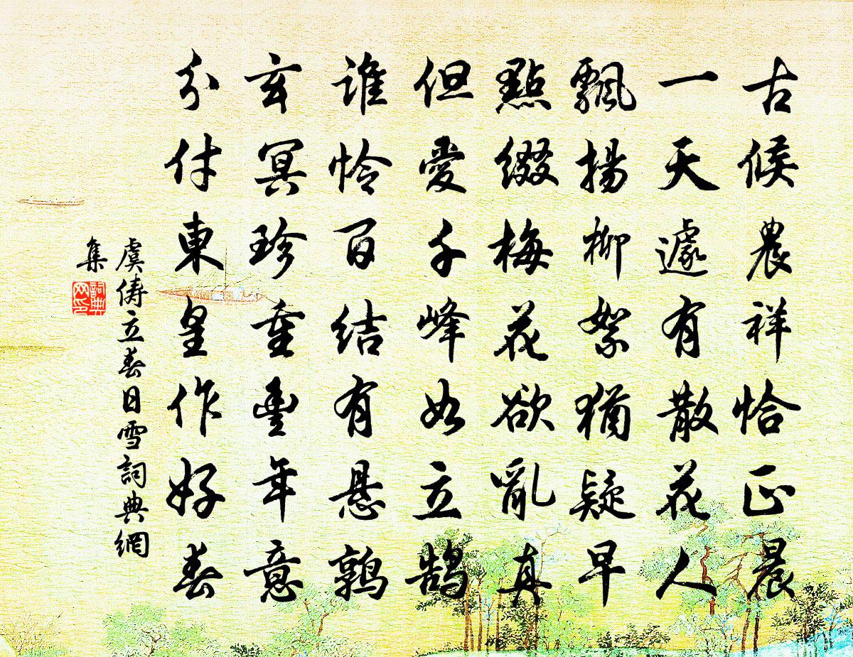 詩詞名句歷史字典書法欣賞書法字典國語詞典說文解字康熙字典古漢語字典標 題 作 者 詩 句 立春日雪作者:虞儔 朝代:宋代立春日雪原文古候農祥恰正晨,一天遽有散花人。飄揚柳絮猶疑早,點綴梅花欲亂真。但愛千峰如立鵠,誰憐百結有懸鶉。玄冥珍重豐年意,分付東皇作好春。詩詞問答問:立春日雪的作者是誰?答:虞儔問:立春日雪寫於哪個朝代?答:宋代虞儔立春日雪書法欣賞立春日雪書法作品詩詞推薦憶秦娥秦觀〔宋代〕頭一片庾樓月。庾樓月。水天涵映秋澄徹。秋澄徹。涼風清露,瑤台銀闕。桂花香滿蟾蜍窟。胡床興發霏談雪。霏詠懷阮籍〔魏晉〕二妃游江濱,逍遙順風翔。交甫懷環佩,婉孌有芬芳。猗靡情歡愛,千載不相忘。傾城迷下蔡,容好結中腸。感激江西道院集戊申四月九日得請補外初出國門宿楊萬里〔宋代〕出卻金宮入梵宮,翠微綠霧染衣濃。三年不識西湖月,一夜初聞南澗鍾。藏室蓬山真昨戲,園翁溪友得今從。若非踏莎行 贈友生王哲〔元代〕前歲麻收,去年麥覓。一麻一麥傳訊息。左邊金餅一陽生,右傍銀器純陰匿。偏黨無私,倒顛有則。心燈朗徹緣挑次韻吳伯庸竹間梅花十絕釋紹嵩〔宋代〕攜茶時復過幽亭,寄目悠然上杳冥。好是園林爭秀髮,梅花白白竹青青。送朱校理知濰州司馬光〔宋代〕東國連年水傷稼,使君到部即行春。茫茫四野潢污竭,鬱郁萬行桑柘新。俗不好奢田器貴,獄無留擊吏家貧。齊人送周六赴濠州戶曹二首張耒〔宋代〕從來悟道不由書,覿面相呈已有餘。麈尾花飛終不近,濠梁古鬼解揶揄。司徒侍中宣獻公輓詞二首宋祁〔宋代〕斯文推舊德,憂國變華顛。夙夜勞三事,東西止百年。溫辭聯冊秘,良史大都傳。他日賢臣壠,心知望圃田。休牧軒鄭剛中〔宋代〕自是牛圖不早傳,向來牛鼻不須穿。軒間縮手風真意,始悟控持非自然。江邊閒步孟貫〔唐代〕閒來南渡口,迤邐看江楓。一路波濤畔,數家蘆葦中。遠汀排晚樹,深浦漾寒鴻。吟罷慵回首,此情誰與同。淡紫賈似道〔宋代〕名為淡紫遍身明,項如青靛齒紫紅。頭上三尖腰要闊,戰得場中不敢逢。送僧張謂〔唐代〕童子學修道,誦經求出家。手持貝多葉,心念優曇花。得度北州近,隨緣東路賒。一身求清淨,百毳納袈裟。鍾嶺送黃提乾赴班李昴英〔宋代〕不枉金蘭貯一賢,唱名重見冕旒前。省闈見說第三賦,選調猶遲十八年。據實語人南嶠事,無多行李浙江船。壺山秋思陸游〔宋代〕疏泉洗石夸身健,試墨燒香破日長。若得三山安樂法,不須更覓玉函方。九日歸自南山方回〔宋代〕山寒小雨晴,落葉獻秋聲。酒可諸僧共,詩須此老評。鉤簾修竹淨,辟戶遠江橫。相送依依意,丹青畫不成。病起閒步陳造〔宋代〕瞑綠園亭小雨晴,病翁雙眼為誰明。柳如張緒不殊昔,竹與子猷相對清。門下鳥烏無客到,壁棲蛇蚓又詩成。回頭玉梁峽口懷朱嚴從事之官嶺外兩夕舟次於此林逋〔宋代〕蒼莽江灣盡入深,數家村塢在山陰。煙橫落木寒初靜,水帶微陽晚未沉。極覽定非他輩事,不來終負此生心。鱸魚徐容齋庭下竹顧逢〔宋代〕碧玉黃金竹,求來此種難。數竿真可愛,幾度共相看。月影畫半幅,風聲雨一般。歲寒心不改,日日報平安。夜句三首陳師道〔宋代〕過雨作秋清,歸雲放月明。入簾搖竹影,塞耳落洪聲。冬至夜懷湘靈白居易〔唐代〕艷質無由見,寒衾不可親。何堪最長夜,俱作獨眠人。名句推薦百二禁兵辭象闕,三千宮女下龍舟。許渾《汴河亭》 砧面瑩,杵聲齊。搗就征衣淚墨題。賀鑄《杵聲齊·砧面瑩》 白雲江上故鄉,月下風前吟處。子蘭《秋日思舊山》 知有兒童挑促織,夜深籬落一燈明。葉紹翁《夜書所見》 一番荷芰生池沼,檻前風送馨香。尹鶚《臨江仙·一番荷芰生池沼》 夜發清溪向三峽,思君不見下渝州。李白《峨眉山月歌》 樹挪死,人挪活。佚名《增廣賢文·下集》 知之者不如好之者,好之者不如樂之者。孔子弟子《論語·雍也篇》 性者、本始材朴也;偽者、文理隆盛也。無性則偽之無所加,無偽則性不能自美。荀子《荀子·禮論》 燕子斜陽來又去,如此江山。朱彝尊《賣花聲·雨花台》