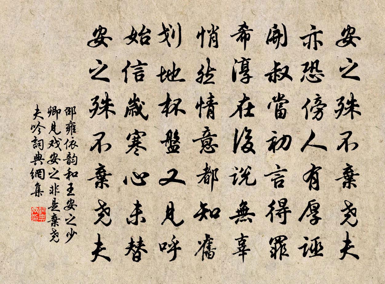 詩詞名句歷史字典書法欣賞書法字典國語詞典說文解字康熙字典古漢語字典標 題 作 者 詩 句 依韻和王安之少卿見戲安之非是棄堯夫吟作者:邵雍 朝代:宋代原文安之殊不棄堯夫,亦恐傍人有厚誣。開叔當初言得罪,希淳在後說無辜。悄然情意都知舊,劃地杯盤又見呼。始信歲寒心未替,安之殊不棄堯夫。詩詞問答問:《依韻和王安之少卿見戲安之非是棄堯夫吟》的作者是誰?答:邵雍問:該詩寫於哪個朝代?答:宋代書法欣賞依韻和王安之少卿見戲安之非是棄堯夫吟書法作品詩詞推薦建康六感齊劉子翬〔宋代〕堯宮不翦茨,禹室無崇壤。巍巍天步隆,萬代猶可仰。荒哉二三君,經營務華敞。落柹滿清江,飛斤殷遙響。疏淵年老逢春十三首邵雍〔宋代〕年老逢春春不任,不任緣被老來侵。一身老去惡足惜,滿眼春歸何處尋。紅日墜時風更急,落花流處水仍深。流鶯舟行遇順風衛涇〔宋代〕晝船昨日吳江西,風雨滿江鼓棹遲。客帆過眼撇波去,坐看舟子相猶夷。今朝風忽發東北,縱帆如飛揭百尺。來者頌古三十九首釋道樞〔宋代〕大悲菩薩千手眼,如人背後摸枕頭。猢孫跳出布袋口,不妨隨處逞風流。和陶丙辰歲八月中於下潠田舍獲吳芾〔宋代〕淵明事南畝,躬自獲岩隈。雖復竭吾力,卻得舒我懷。所收既不薄,卒歲事可諧。隣家相慰勞,競持酒與雞。留連番陽湖范成大〔宋代〕淒悲鴻雁來,泱漭魚龍蟄。雷霆一鼓罷,星斗萬里濕。波翻漁火碎,月落村舂急。折葦已紛披,衰楊尚僵立。長年潤州錢祠部新建寶墨亭蘇頌〔宋代〕王蕭書跡衛公詩,流落江南世少知。古寺購尋遺刻在,新亭龕置斷珉奇。模傳遂比黃庭字,埋沒非同石鼓碑。墨藪沁園春 泉南初度,伯時將北歸,諸友宴次,張翥〔元代〕天上玉堂,海外瀛洲,山中蛻岩。甚六十四歲,出持使節,八千餘里,來駐征驂。香火緣深,功名意薄,夢覺仙家【南呂】四塊玉_詠手弦上看喬吉〔元代〕詠手弦上看,花間把,握雨攜雲那清嘉,春風滿袖拈羅帕。擎玉斝,微蘸甲,風韻煞。玉掌溫,瓊枝嫩,閒弄閒拈挽呂東萊趙燁〔宋代〕近接南軒訃,公今事亦休。彫零數耆舊,牢落一山丘。吾道將窮矣,蒼天可問不。雙溪樓下水,應共哭聲流。一寸金 賞雪 以上嗚鶴餘音卷七,卷七中尚有佚名〔宋代〕暮鴻嘹唳。更晚來地籟,陰風齊起。造作嚴凝,同雲黯黯,四海玉龍呈端。妝點萬家清景,普綻瓊花鮮麗。最好是登大伾山詩王守仁〔明代〕曉披煙霧入青巒,山寺疏鍾萬木寒。千古河流成沃野,幾年沙勢自風湍。水穿石甲龍鱗動,日繞峰頭佛頂寬。宮闕花心動(梅意)高觀國〔宋代〕碧蘚封枝,點寒英、疏疏玉清冰潔。夢憶舊家,春與新恩,曾映壽陽妝額。綠裙青袂南鄰伴,應怪我、精神都別。渡長泖投小蒸邵教授宿戴表元〔宋代〕清曉浮雙槳,黃昏值一餐。風鳴長泖浪,雲掩小蒸村。饞極知鱸美,驚還覺雁喧。同袍恩有愛,燈火細溫存。知郡檢計齋醮禱雨,登時感通,輒賦古風,以范成大〔宋代〕六月火雲高偃蹇,使君有意憐焦卷。一封紅篆驛金龍,雨氣倏隨爐燎滿。風師避路雷車鳴,石破天驚檐溜傾。不知步虛詞/西江月范成大〔宋代〕流鈴響,龍馭籋雲來。夾道騫華龍彩仗,紅雲扶輅輾天街。迎駕鶴毰毸。梅花喜神譜就實六枝宋伯仁〔宋代〕醉帽不輕飛,秋菊有佳色。自慚群座中,主人猶未識。聽曹剛琵琶兼示重蓮白居易〔唐代〕撥撥弦弦意不同,胡啼番語兩玲瓏。誰能截得曹剛手,插向重蓮衣袖中?詩酒吟邵雍〔宋代〕聖人難處口能宣,何止千年與萬年。心靜始能知白日,眼明方會看青天。鬼神情狀將詩寫,造化功夫用酒傳。傳寫知府提舉訪求前守凌公遺蹟忽於庭廡雨壓複壁趙蕃〔宋代〕郡齋新刻總珍藏,得此遺蹤益有光。再拜從公乞余本,歸齎不復恨空囊。名句推薦雲鎖嫩黃煙柳細,風吹紅蒂雪梅殘。閻選《八拍蠻·雲鎖嫩黃煙柳細》 隔水氈鄉,落日牛羊下,區脫縱橫。張孝祥《六州歌頭·長淮望斷》 曉迎秋露一枝新,不占園中最上春。杜牧《紫薇花》 蜀道之難,難於上青天!李白《蜀道難》 寄書長不達,況乃未休兵。杜甫《月夜憶舍弟》 蓬門未識綺羅香,擬托良媒益自傷。秦韜玉《貧女》 目之於色也,有同美焉。孟子《孟子·告子章句上·第七節》 明月出海底,一朝開光曜。李白《古風·齊有倜儻生》 人生自古誰無死?留取丹心照汗青。文天祥《過零丁洋》 遠上寒山石徑斜,白雲生處有人家。杜牧《山行》