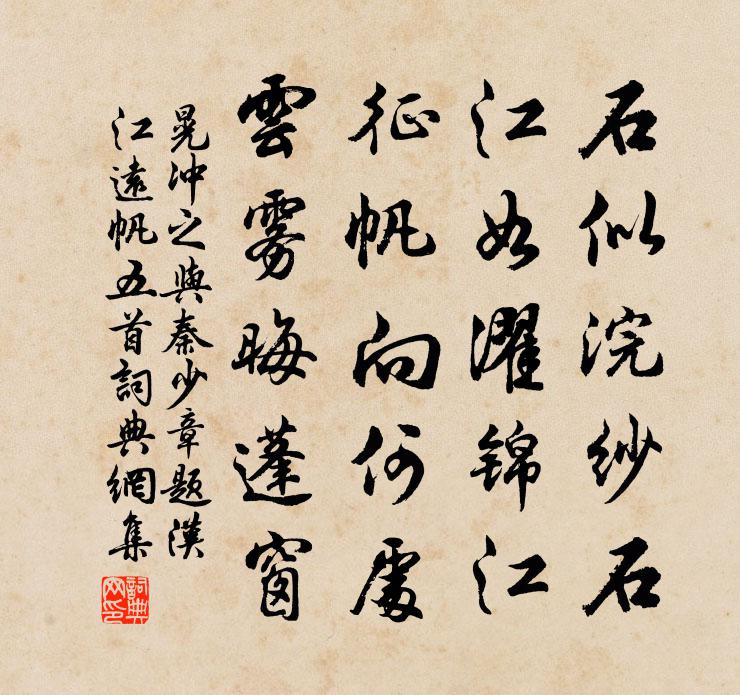 詩詞名句歷史字典書法欣賞書法字典國語詞典說文解字康熙字典古漢語字典標 題 作 者 詩 句 與秦少章題漢江遠帆五首作者:晃沖之 朝代:宋代與秦少章題漢江遠帆五首原文石似浣紗石,江如濯錦江。征帆向何處,雲霧晦蓬窗。詩詞問答問:與秦少章題漢江遠帆五首的作者是誰?答:晃沖之問:與秦少章題漢江遠帆五首寫於哪個朝代?答:宋代晃沖之與秦少章題漢江遠帆五首書法欣賞與秦少章題漢江遠帆五首書法作品詩詞推薦題王伯忠雪月圖王柏〔宋代〕片紙裁成數雨慳,王孫風致寄毫端。只於天地交光里,認得前程萬里寬。杏園芳尹鶚〔唐代〕嚴妝嫩臉花明,教人見了關情。含羞舉步越羅輕,稱娉婷。終朝咫尺窺香閣,迢遙似隔層城。何時休遣夢相縈,入林竹翁求跋朱南傑〔宋代〕何物耐交情,林翁竹借名。霜嚴不改操,風勁鎮長清。袖裡森珠玉,胸中富甲兵。江湖莫相笑,已播逸民聾。送楊偕太傅知淮陽軍宋祁〔宋代〕下拜親膺一札書,隋河風柂送行艫。曉辭漢署茅留蕝,暮聽廉歌袴換襦。方誌貢珍傳磬錯,客庖羞品盛魚腴。雙旌黃寺丞輓詩項安世〔宋代〕白鹿人先去,西坡事又非。客情何所向,老淚不禁揮。日短輀車急,山寒冢未腓。猶聞辭楚辟,來救越民飢。河源破賊後贈袁將軍法振〔唐代〕白羽三千駐,蕭蕭萬里行。出關深漢壘,帶月破蕃營。蔓草河原色,悲笳碎葉聲。欲朝王母殿,前路駐高旌。次韻虞子建見咍贖帶作醮范成大〔宋代〕齊祠難著野衣冠,旋贖金章始見閒。台架塵侵球路暗,花書墨漬笏頭斑。當年馹騎傳呼賜,此日村童拂拭還。若比汨羅李德裕〔唐代〕遠謫南荒一病身,停舟暫吊汨羅人。都緣靳尚圖專國,豈是懷王厭直臣。萬里碧潭秋景靜,四時愁色野花新。不勞阮郎歸元好問〔金代〕謾郎活計拙於鳩。閒中又過秋。枕書眠了卻登樓。貧來頗自由。書咄咄,賦休休。西窗晚更幽。詩家貧殺也風流。登城五首劉克莊〔宋代〕已作南夷長,那為北面臣。未忘真定冢,畢竟是華人。湓城東孔武仲〔宋代〕廬山之岑岑,橫絕東南天。大江之湯湯,洲渚相鉤連。山水兩中間,君家之故園。憶昨別此去,春風初破年。歸來連日灌畦蒔菜廢作詩葛立方〔宋代〕莫問新來額插犀,了無魂夢到金閨。平頭上尾慵搜句,重後輕前且灌畦。正自無人嘗鼎臠,不如有客辦萍虀。庾郎方氏墓廬扁曰白雲飛處薛嵎〔宋代〕諸峰互隱蔽,一望一增悲。觸目易成感,思親無盡時。松扉陰似雨,翁仲立如痴。出岫亦何意,悠然自不知。活水亭觀書有感二首·其二朱熹〔宋代〕昨夜江邊春水生,艨艟巨艦一毛輕。向來枉費推移力,此日中流自在行。題獨醒小亭王琮〔宋代〕退食多留此,翛然一散襟。涼從曉來覺,秋向雨中深。牆竹侵山色,檐茅雜柳陰。有誰能載酒,過我共幽尋。答公孫及李復〔宋代〕輾轉臥不周,遙夜何漫漫。娟娟竹間月,照我影零亂。繁蟲哀陰壁,輕風泛幃幔。節物自感人,寤言興永嘆。頹坐謝張寬夫送棕耳頌黃庭堅〔宋代〕菜茹之品棕耳君,乖龍割耳鱉脫裙。張子羞我助貧餐,桑鵝楮雞不足雲。曲肱一飽南風薰,萬事於我如浮雲。將渡揚子風雨忽作強至〔宋代〕南徐景物古愁人,薄宦扁舟更水濱。不識濁醪傾北固,獨隨寒雨出西津。連天風浪聲兼厲,當路黿鼉氣亦振。吾道句伍誥〔宋代〕扁舟何日江南岸,與子歸來竹一竿。木蘭花慢 壽碭山蔣令王旭〔元代〕孟春琴才過了,琴看兩葉,琴坼堯*。正杏蕾包紅,梅琴謝白,楊柳回青。東風此時須記,是當年、河嶽降英靈。名句推薦興盡晚回舟,誤入藕花深處。李清照《如夢令·常記溪亭日暮》 國家將興,必有禎祥;國家將亡,必有妖孽。子思《中庸·第二十四章》 裳裳者華,其葉湑兮。佚名《裳裳者華》 越女新妝出鏡心,自知明艷更沉吟。張籍《酬朱慶餘》 記取江湖泊船處,臥聞新雁落寒汀。陸游《夜泊水村》 故人宿茅宇,夕鳥栖楊園。李白《之廣陵宿常二南郭幽居》 夜闌更秉燭,相對如夢寐杜甫《羌村》 月到東南秋正半。雙闕中間,浩蕩流銀漢。王國維《蝶戀花·月到東南秋正半》 夫知人之性,莫難察焉。諸葛亮《將苑·卷一·知人性》 王顧左右而言他。孟子《孟子·梁惠王章句下·第六節》