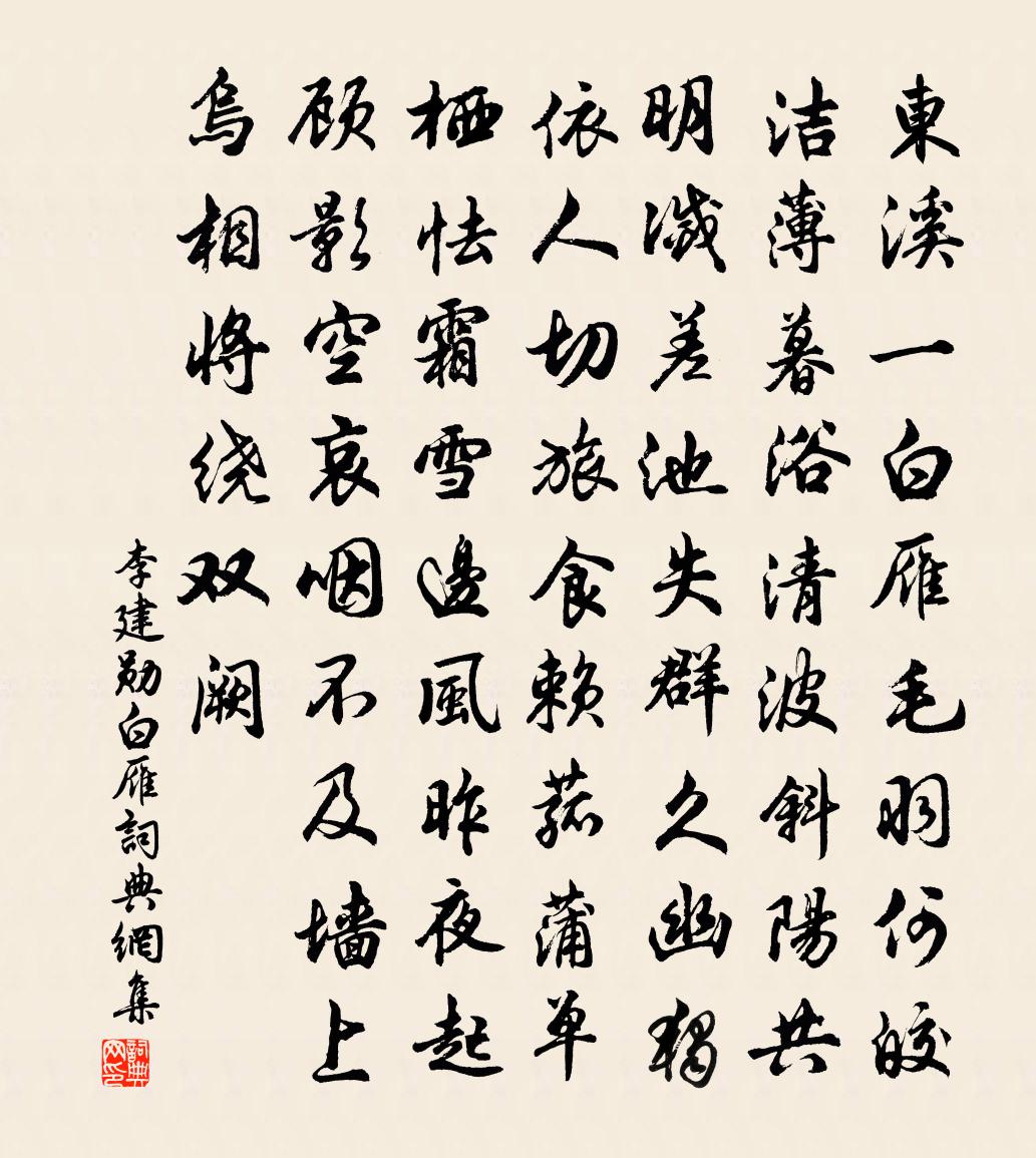 詩詞名句歷史字典書法欣賞書法字典國語詞典說文解字康熙字典古漢語字典標 題 作 者 詩 句 白雁作者:李建勛 朝代:唐代白雁原文東溪一白雁,毛羽何皎潔。薄暮浴清波,斜陽共明滅。差池失群久,幽獨依人切。旅食賴菰蒲,單棲怯霜雪。邊風昨夜起,顧影空哀咽。不及牆上烏,相將繞雙闕。詩詞問答問:白雁的作者是誰?答:李建勛問:白雁寫於哪個朝代?答:唐代問:白雁是什麼體裁?答:五古李建勛白雁書法欣賞白雁書法作品注釋全唐詩:卷739-2詩詞推薦別眉山源上人員興宗〔宋代〕我生喜際招提客,欲宜漚幻子塵色。偶然揮斥仍六極,無相光中豈南北。上人得我慰寂寞,相與含笑了一默。生死惠蓮峰詩以為謝釋文珦〔宋代〕月汀家在帝王都,不藏歌舞唯藏書。舊詫鄴侯三萬軸,君家所藏還有餘。寄我一詩辭縝密,言言皆自書中出。復來長安夜懷李頻〔唐代〕匹馬西遊日,從吳又轉荊。風雷幾夜坐,山水半年行。夢永秋燈滅,吟余曉露明。良時不我與,白髮向秦生。偶成葉茵〔宋代〕人間總利名,此地此心清。雨架筆多潤,風欞琴自聲。虛堂回古味,逆境見真情。脫帽尋蘄簟,酣眠小太平。贈主人孟郊〔唐代〕斗水瀉大海,不如瀉枯池。分明賢達交,豈顧豪華兒。海有不足流,豪有不足資。枯鱗易為水,貧士易為施。幸睹春雲鄧倚〔唐代〕搖曳自西東,依林又逐風。勢移青道里,影 * 波中。夕霽方明日,朝陽復蔽空。度關隨去馬,出塞引歸鴻。色任久雨曾幾〔宋代〕小雨飛空十日餘,苔錢稱意上階除。芒鞋不踏門前路,坐聽嘔啞過竹輿。戲景思王之望〔宋代〕顏色傾城世更精,愛卿長是說卿卿。卷中昔日催徽貌,重見應憐太瘦生。既別文顯兄弟晚宿日光寺書懷寄之趙蕃〔宋代〕別君當以詩,此物不充飢。二事交為病,吾曹均坐茲。欲談殊爛漫,趣去苦淒悲。晚宿投幽寺,翻思赴野期。風燈早秋二絕寇準〔宋代〕年光苒苒暗推移,坐惜流年感舊期。獨聽早蟬秋色里,潘安初見二毛時。護國寺秋吟八首白玉蟾〔宋代〕犬吠月如晝,馬鳴人渡橋。更無詩與酒,虛度可憐宵。偈頌七十六首釋師範〔宋代〕昨日九月九,過了重陽節。今日憶重陽,陞堂何可說。擬欲問黃花,黃花雖有在東籬。擬欲問白醪,白醪雖有非我觀公孫大娘弟子舞劍器行並序杜甫〔唐代〕昔有佳人公孫氏,一舞劍器動四方。觀者如山色沮喪,天地為之久低昂。爧如羿射九日落,嬌如群帝驂龍翔。來如次韻明法游法相院二首郭印〔宋代〕禪扉塵不雜,景趣自然幽。黛色排軒入,仙香繞殿浮。傍林滋野興,出郭契清游。歸路風埃起,眠沙愧白鷗。次韻王省乾陳造〔宋代〕一官初有祿,三月免無君。平時愛人學,蘄試百一分。羽俗南北異,所見違所聞。致化要無倦,儒者貴長文。月夜泛小舟湖中三更乃歸陸游〔宋代〕落日愁思把釣鉤,南鄰借得采菱舟。湖心月上明如晝,樹杪風生冷逼秋。壯歲功名慚汗馬,暮年心事許沙鷗。桐江題義門胡氏華林書院柳直〔宋代〕華林茂族藹青芬,族本重華遠裔孫。弟侄聲光攀郤桂,君王恩渥表於閭。書幃月鑒琴橫席,吟閣雲殘村隔原。多感次韻梓上人釋紹嵩〔宋代〕一身無定處,誰見寂寥心。始為江山靜,徒雲寒暑侵。少孤心易感,漂泊病難任。未遂長棲此,孤懷自不禁。贈虔州術士謝晉臣蘇軾〔宋代〕屬國新從海外歸,君平且莫下簾帷。前生恐是盧行者,後學過呼韓退之。死後人傳戒定慧,生時宿直鬥牛箕。憑君訪朱放山人皎然〔唐代〕野人未相識,何處異鄉隔。昨逢雲陽信,教向雲陽覓。空聞天上風,飄颻不可覿。應非矍鑠翁,或是滄浪客。早晚名句推薦想翠竹、碧梧風采,舊遊何處。張寧《滿江紅·題碧梧翠竹送李陽春》 數年來往鹹京道,殘杯冷炙謾消魂晏殊《山亭柳·贈歌者》 兩岸荔枝紅,萬家煙雨中。李師中《菩薩蠻·子規啼破城樓月》 有孫母未去,出入無完裙。杜甫《石壕吏》 佇久河橋欲去,斜陽淚滿。吳文英《三姝媚·過都城舊居有感》 君不見,黃河之水天上來,奔流到海不復回。李白《將進酒》 半生已分孤眠過,山枕檀痕涴。納蘭性德《虞美人·曲闌深處重相見》 兒童急走追黃蝶,飛入菜花無處尋。楊萬里《宿新市徐公店》 善言天者必有徵於人,善言古者必有驗於今班固《漢書·傳·董仲舒傳》 桃花仙人種桃樹,又摘桃花換酒錢。唐寅《桃花庵歌》