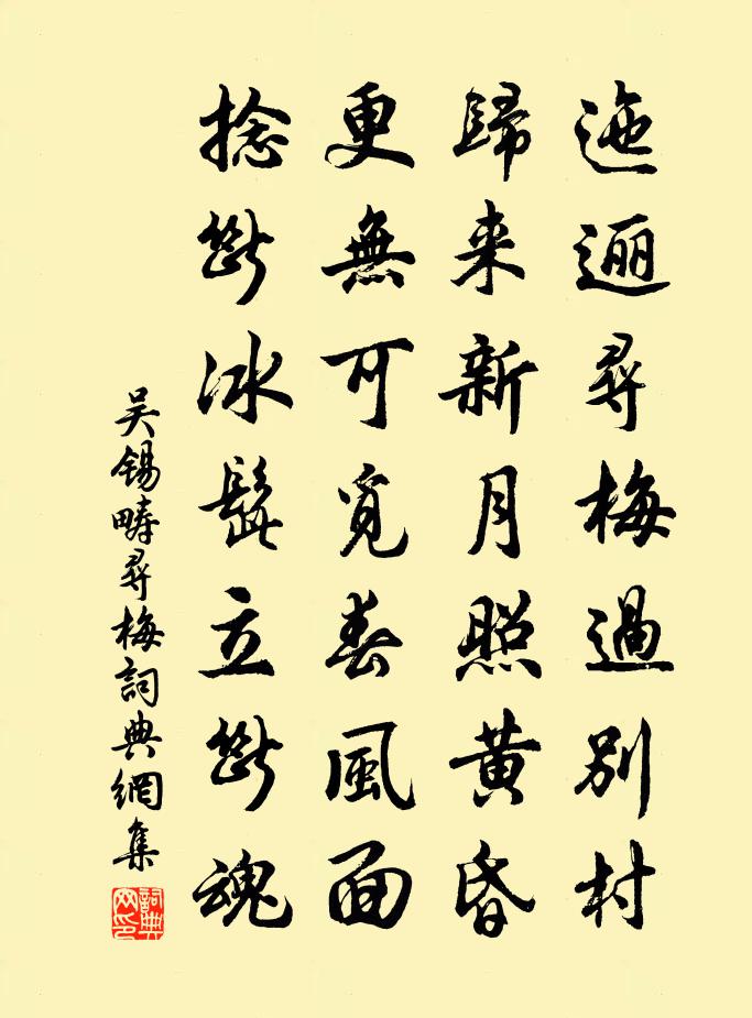 詩詞名句歷史字典書法欣賞書法字典國語詞典說文解字康熙字典古漢語字典標 題 作 者 詩 句 尋梅作者:吳錫疇 朝代:宋代尋梅原文迤邐尋梅過別村,歸來新月照黃昏。更無可覓春風面,捻斷冰髭立斷魂。詩詞問答問:尋梅的作者是誰?答:吳錫疇問:尋梅寫於哪個朝代?答:宋代吳錫疇尋梅書法欣賞尋梅書法作品詩詞推薦和孫廷平坦嵩山十首天外峰韓維〔宋代〕孤峰望不極,卻視天形低。天高豈可逾,直以雲蒙之。何時一掃去,高下皎不疑。同綦毋學士月夜聞雁張九齡〔唐代〕棲宿豈無意,飛飛更遠尋。長途未及半,中夜有遺音。月思關山笛,風號流水琴。空聲兩相應,幽感一何深。避繳偈頌一百零四首釋紹曇〔宋代〕道無可成,法無可說。黃面瞿曇,重重敗缺。家醜豈容外泄,剛被兒孫告訐。圖形畫影與人看,乳竇門風添暖熱。苦熱和徐山甫韻金履祥〔宋代〕地卷槁苗盡,人居沸鼎中。何時霖雨相,夢到武丁宮。留題李頡林亭林逋〔宋代〕兼琴枕鶴經,盡日臥林亭。啼鳥自相語,幽人誰欲聽。半闌花籍白,一徑草盤青。何必對樽酒,此中堪獨醒。試院中秋效諸進士作月涌大江流喻良能〔宋代〕團月臨清夜,平分一半秋。輪侵斜漢迥,色涌大江流。皎皎驚飛鵲,亭亭喘臥牛。一川寒練靜,十頃素光浮。碎彩春詞張良臣〔宋代〕後主搴香復倚春,潘嬙梳洗最輕盈。南朝破後無詞客,燕子桃花古石城。詠杜若詩沈約〔南北朝〕生在窮絕地。豈與世相親。不顧逢採擷。本欲芳幽人。程森甫見示同伯幾游雪矼觀海棠之作伯幾賞與汪炎昶〔宋代〕風中霧屢拂銀灣,滿貯煙霞洞府寬。物外山供情宛轉,吟邊海鑲思漲漫。岫雲影壓龍湫暝,潤瀑聲吹鶴夢寒。喚醒次韻酬孫艮齋三首楊公遠〔宋代〕抱膝孤吟欠范模,原隨雞犬藉丹爐。儻能化得塵凡骨,差勝無聲水墨圖。次韻回文三首蘇軾〔宋代〕羞雲斂慘傷春暮,細縷詩成織意深。頭畔枕屏山掩恨,日昏塵暗玉窗琴。玉田八景華頂秋容李堪〔宋代〕何處棲真遠世紛,五華高頂絕人氛。仙翁自有餐霞法,謾使人間望彩雲。華山畿·啼相憶佚名〔南北朝〕啼相憶,淚如漏刻水,晝夜流不息。擬古納蘭性德〔清代〕朔風吹古柳,時序忽代續。庭草萎已盡,顧視白日速。吾本落拓人,無為自拘束。倜儻寄天地,樊籠非所欲。嗟載張公洞蘇轍〔宋代〕亂山深處白雲堆,地坼中空洞府開。繭瓮有天含宇宙,瑤台無路接蓬萊。金芝春暖青牛臥,珠樹月明黃鶴回。此日悼翁仲立達州陳傅良〔宋代〕淮幙何多譽,巴城僅一麾。最書膚使上,好語近臣知。篳路江山久,維舟日月遲。空懷歸報牘,不逮勞還時。叔文九日陳普〔宋代〕江左夷吾本勝流,晚因造膝卻生愁。紫囊肯上斯人腕,敢怨離騷佩不收。春山三朅來李涉〔唐代〕釣魚朅來春日暖,沿溪不厭舟行緩。野竹初栽碧玉長,澄潭欲下青絲短。昔人避世兼避讎。暮棲雲外朝悠悠。我今登玉山諸峰,偶至悟真寺錢起〔唐代〕郭南雲水佳,訟簡野情發。紫芝每相引,黃綬不能紲。稍入石門幽,始知靈境絕。冥搜未寸晷,仙徑俄九折。蟠木憫雨曾幾〔宋代〕梅子黃初遍,秧針綠未抽。若無三日雨,那復一年秋。薄晚看天意,今宵破客愁。不眠聽竹樹,還有好音不。名句推薦想見廣寒宮殿,正雲梳風掠。辛棄疾《好事近·中秋席上和王路鈐》 致君堯舜上,再使風俗淳。杜甫《奉贈韋左丞丈二十二韻》 霜雪兮漼溰,冰凍兮洛澤。王逸《九思》 穗帷飄井幹,樽酒若平生。謝朓《同謝諮議詠銅雀台》 壯志飢餐胡虜肉,笑談渴飲匈奴血。岳飛《滿江紅·寫懷》 儒以文亂法,俠以武犯禁。韓非及後人《韓非子·五蠹》 心即理也。天下又有心外之事,心外之理乎王陽明《傳習錄·卷上·徐愛錄》 人情若比初相識,到底終無怨恨心。馮夢龍《醒世恆言·卷一》 夜喧山門店,獨宿不安席。韋應物《聽嘉陵江水聲寄深上人》 家有常業,雖飢不餓;國有常法,雖危不亡。韓非及後人《韓非子·飾邪》